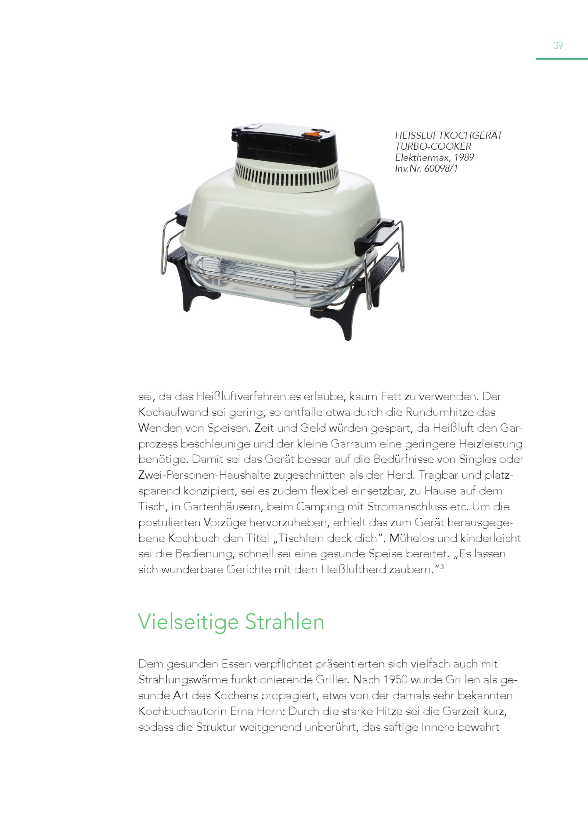 39 HEISSLUFTKOCHGERÄT TURBO-COOKER Elekthermax, 1989 Inv.Nr. 60098/1 sei, da das Heißluftverfahren es erlaube, kaum Fett zu verwenden. Der Kochaufwand sei gering, so entfalle etwa durch die Rundumhitze das Wenden von Speisen. Zeit und Geld würden gespart, da Heißluft den Gar prozess beschleunige und der kleine Garraum eine geringere Heizleistung benötige. Damit sei das Gerät besser auf die Bedürfnisse von Singles oder Zwei-Personen-Haushalte zugeschnitten als der Herd. Tragbar und platzsparend konzipiert, sei es zudem flexibel einsetzbar, zu Hause auf dem Tisch, in Gartenhäusern, beim Camping mit Stromanschluss etc. Um die postulierten Vorzüge hervorzuheben, erhielt das zum Gerät herausgegebene Kochbuch den Titel„Tischlein deck dich“. Mühelos und kinderleicht sei die Bedienung, schnell sei eine gesunde Speise bereitet.„Es lassen sich wunderbare Gerichte mit dem Heißluftherd zaubern.“ 3 Vielseitige Strahlen Dem gesunden Essen verpflichtet präsentierten sich vielfach auch mit Strahlungswärme funktionierende Griller. Nach 1950 wurde Grillen als gesunde Art des Kochens propagiert, etwa von der damals sehr bekannten Kochbuchautorin Erna Horn: Durch die starke Hitze sei die Garzeit kurz, sodass die Struktur weitgehend unberührt, das saftige Innere bewahrt