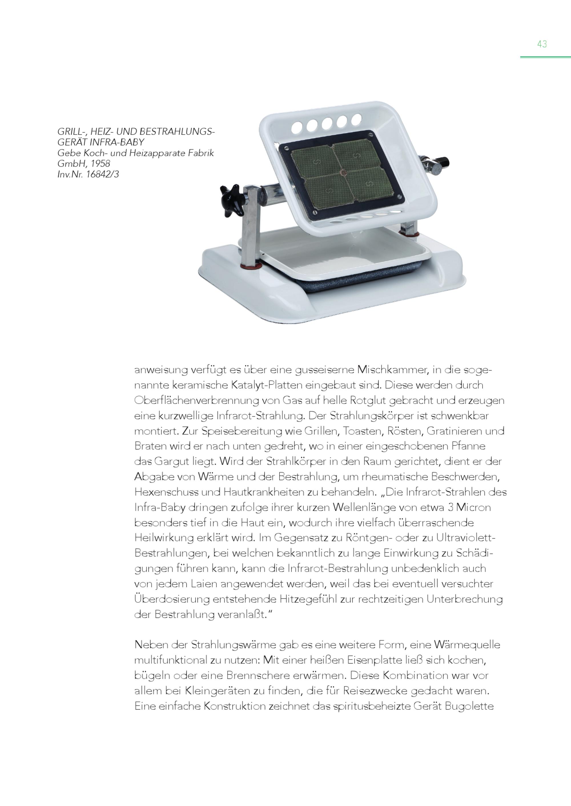 GRILL-, HEIZ- UND BESTRAHLUNGSGERÄT INFRA-BABY Gebe Koch- und Heizapparate Fabrik GmbH, 1958 Inv.Nr. 16842/3 43 anweisung verfügt es über eine gusseiserne Mischkammer, in die sogenannte keramische Katalyt-Platten eingebaut sind. Diese werden durch Oberflächenverbrennung von Gas auf helle Rotglut gebracht und erzeugen eine kurzwellige Infrarot-Strahlung. Der Strahlungskörper ist schwenkbar montiert. Zur Speisebereitung wie Grillen, Toasten, Rösten, Gratinieren und Braten wird er nach unten gedreht, wo in einer eingeschobenen Pfanne das Gargut liegt. Wird der Strahlkörper in den Raum gerichtet, dient er der Abgabe von Wärme und der Bestrahlung, um rheumatische Beschwerden, Hexenschuss und Hautkrankheiten zu behandeln.„Die Infrarot-Strahlen des Infra-Baby dringen zufolge ihrer kurzen Wellenlänge von etwa 3 Micron besonders tief in die Haut ein, wodurch ihre vielfach überraschende Heilwirkung erklärt wird. Im Gegensatz zu Röntgen- oder zu UltraviolettBestrahlungen, bei welchen bekanntlich zu lange Einwirkung zu Schädigungen führen kann, kann die Infrarot-Bestrahlung unbedenklich auch von jedem Laien angewendet werden, weil das bei eventuell versuchter Überdosierung entstehende Hitzegefühl zur rechtzeitigen Unterbrechung der Bestrahlung veranlaßt.“ Neben der Strahlungswärme gab es eine weitere Form, eine Wärmequelle multifunktional zu nutzen: Mit einer heißen Eisenplatte ließ sich kochen, bügeln oder eine Brennschere erwärmen. Diese Kombination war vor allem bei Kleingeräten zu finden, die für Reisezwecke gedacht waren. Eine einfache Konstruktion zeichnet das spiritusbeheizte Gerät Bugolette