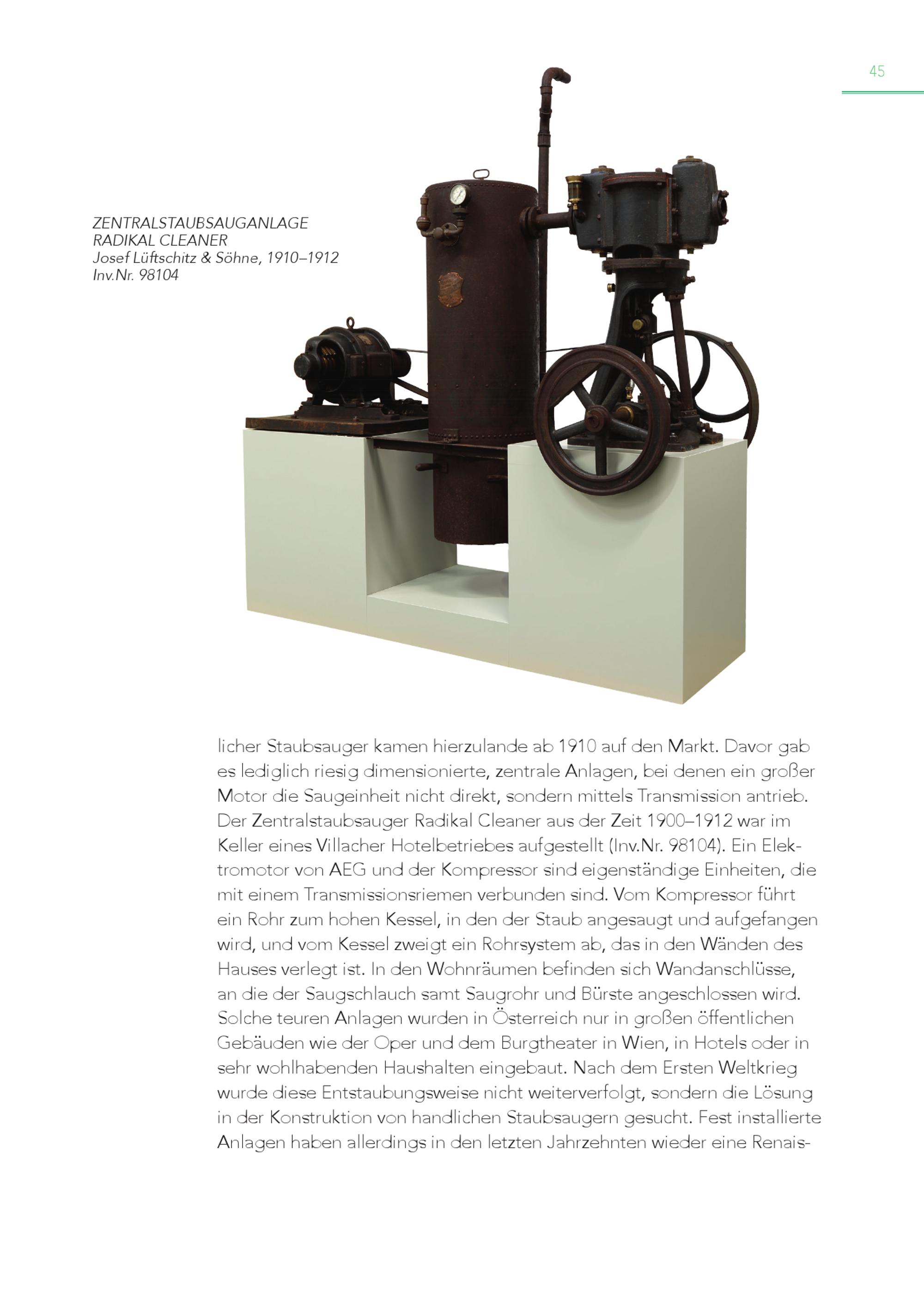 ZENTRALSTAUBSAUGANLAGE RADIKAL CLEANER Josef Lüftschitz& Söhne, 1910–1912 Inv.Nr. 98104 45 licher Staubsauger kamen hierzulande ab 1910 auf den Markt. Davor gab es lediglich riesig dimensionierte, zentrale Anlagen, bei denen ein großer Motor die Saugeinheit nicht direkt, sondern mittels Transmission antrieb. Der Zentralstaubsauger Radikal Cleaner aus der Zeit 1900–1912 war im Keller eines Villacher Hotelbetriebes aufgestellt(Inv.Nr. 98104). Ein Elektromotor von AEG und der Kompressor sind eigenständige Einheiten, die mit einem Transmissionsriemen verbunden sind. Vom Kompressor führt ein Rohr zum hohen Kessel, in den der Staub angesaugt und aufgefangen wird, und vom Kessel zweigt ein Rohrsystem ab, das in den Wänden des Hauses verlegt ist. In den Wohnräumen befinden sich Wandanschlüsse, an die der Saugschlauch samt Saugrohr und Bürste angeschlossen wird. Solche teuren Anlagen wurden in Österreich nur in großen öffentlichen Gebäuden wie der Oper und dem Burgtheater in Wien, in Hotels oder in sehr wohlhabenden Haushalten eingebaut. Nach dem Ersten Weltkrieg wurde diese Entstaubungsweise nicht weiterverfolgt, sondern die Lösung in der Konstruktion von handlichen Staubsaugern gesucht. Fest installierte Anlagen haben allerdings in den letzten Jahrzehnten wieder eine Renais -
