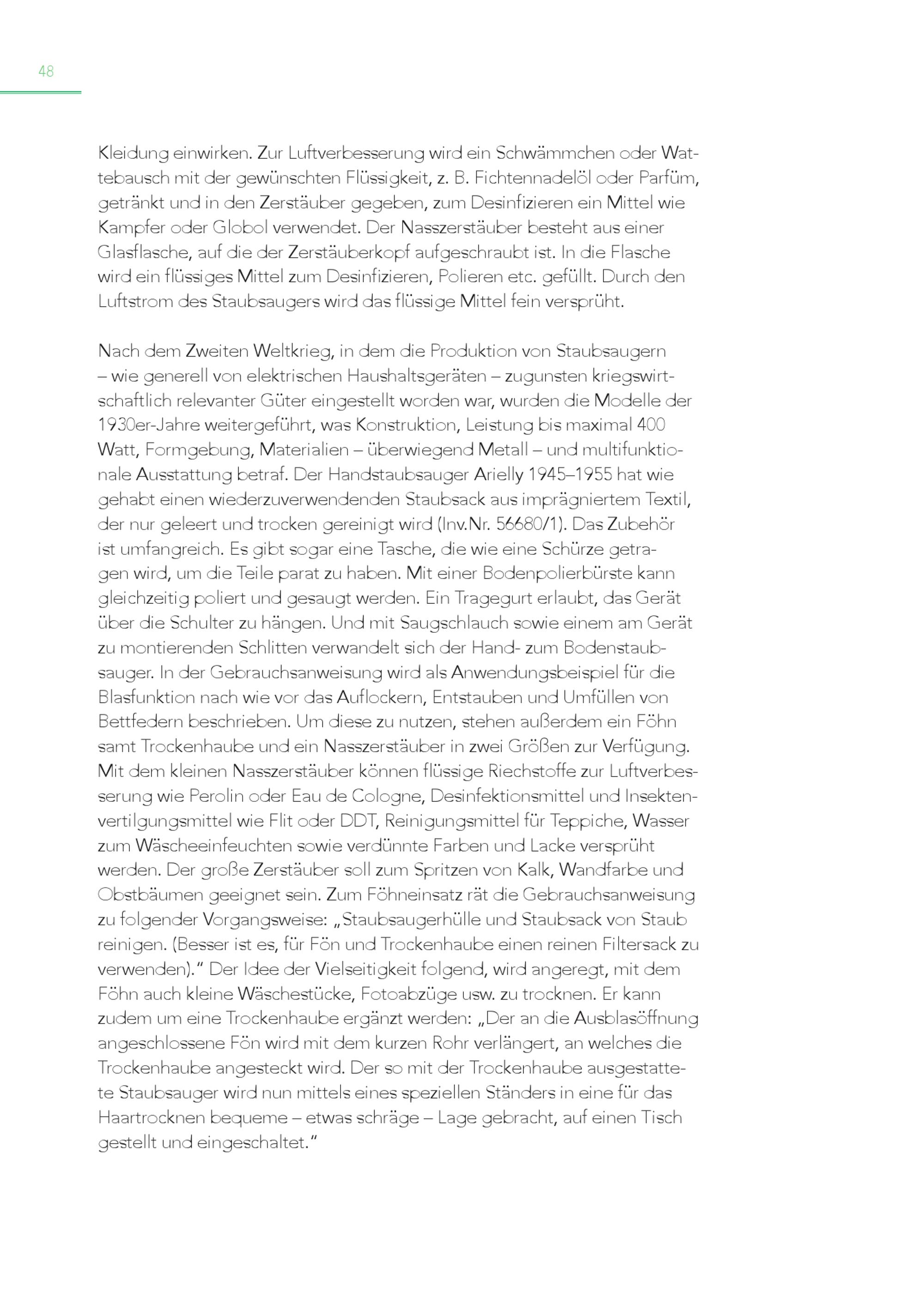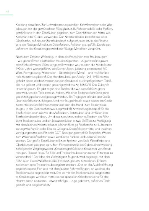 48 Kleidung einwirken. Zur Luftverbesserung wird ein Schwämmchen oder Wat tebausch mit der gewünschten Flüssigkeit, z. B. Fichtennadelöl oder Parfüm, getränkt und in den Zerstäuber gegeben, zum Desinfizieren ein Mittel wie Kampfer oder Globol verwendet. Der Nasszerstäuber besteht aus einer Glasflasche, auf die der Zerstäuberkopf aufgeschraubt ist. In die Flasche wird ein flüssiges Mittel zum Desinfizieren, Polieren etc. gefüllt. Durch den Luftstrom des Staubsaugers wird das flüssige Mittel fein versprüht. Nach dem Zweiten Weltkrieg, in dem die Produktion von Staubsaugern – wie generell von elektrischen Haushaltsgeräten – zugunsten kriegswirt schaftlich relevanter Güter eingestellt worden war, wurden die Modelle der 1930er-Jahre weitergeführt, was Konstruktion, Leistung bis maximal 400 Watt, Formgebung, Materialien – überwiegend Metall – und multifunktio nale Ausstattung betraf. Der Handstaubsauger Arielly 1945–1955 hat wie gehabt einen wiederzuverwendenden Staubsack aus imprägniertem Textil, der nur geleert und trocken gereinigt wird(Inv.Nr. 56680/1). Das Zubehör ist umfangreich. Es gibt sogar eine Tasche, die wie eine Schürze getragen wird, um die Teile parat zu haben. Mit einer Bodenpolierbürste kann gleichzeitig poliert und gesaugt werden. Ein Tragegurt erlaubt, das Gerät über die Schulter zu hängen. Und mit Saugschlauch sowie einem am Gerät zu montierenden Schlitten verwandelt sich der Hand- zum Bodenstaubsauger. In der Gebrauchsanweisung wird als Anwendungsbeispiel für die Blasfunktion nach wie vor das Auflockern, Entstauben und Umfüllen von Bettfedern beschrieben. Um diese zu nutzen, stehen außerdem ein Föhn samt Trockenhaube und ein Nasszerstäuber in zwei Größen zur Verfügung. Mit dem kleinen Nasszerstäuber können flüssige Riechstoffe zur Luftverbes serung wie Perolin oder Eau de Cologne, Desinfektionsmittel und Insektenvertilgungsmittel wie Flit oder DDT, Reinigungsmittel für Teppiche, Wasser zum Wäscheeinfeuchten sowie verdünnte Farben und Lacke versprüht werden. Der große Zerstäuber soll zum Spritzen von Kalk, Wandfarbe und Obstbäumen geeignet sein. Zum Föhneinsatz rät die Gebrauchsanweisung zu folgender Vorgangsweise:„Staubsaugerhülle und Staubsack von Staub reinigen.(Besser ist es, für Fön und Trockenhaube einen reinen Filtersack zu verwenden).“ Der Idee der Vielseitigkeit folgend, wird angeregt, mit dem Föhn auch kleine Wäschestücke, Fotoabzüge usw. zu trocknen. Er kann zudem um eine Trockenhaube ergänzt werden:„Der an die Ausblasöffnung angeschlossene Fön wird mit dem kurzen Rohr verlängert, an welches die Trockenhaube angesteckt wird. Der so mit der Trockenhaube ausgestattete Staubsauger wird nun mittels eines speziellen Ständers in eine für das Haartrocknen bequeme – etwas schräge – Lage gebracht, auf einen Tisch gestellt und eingeschaltet.“