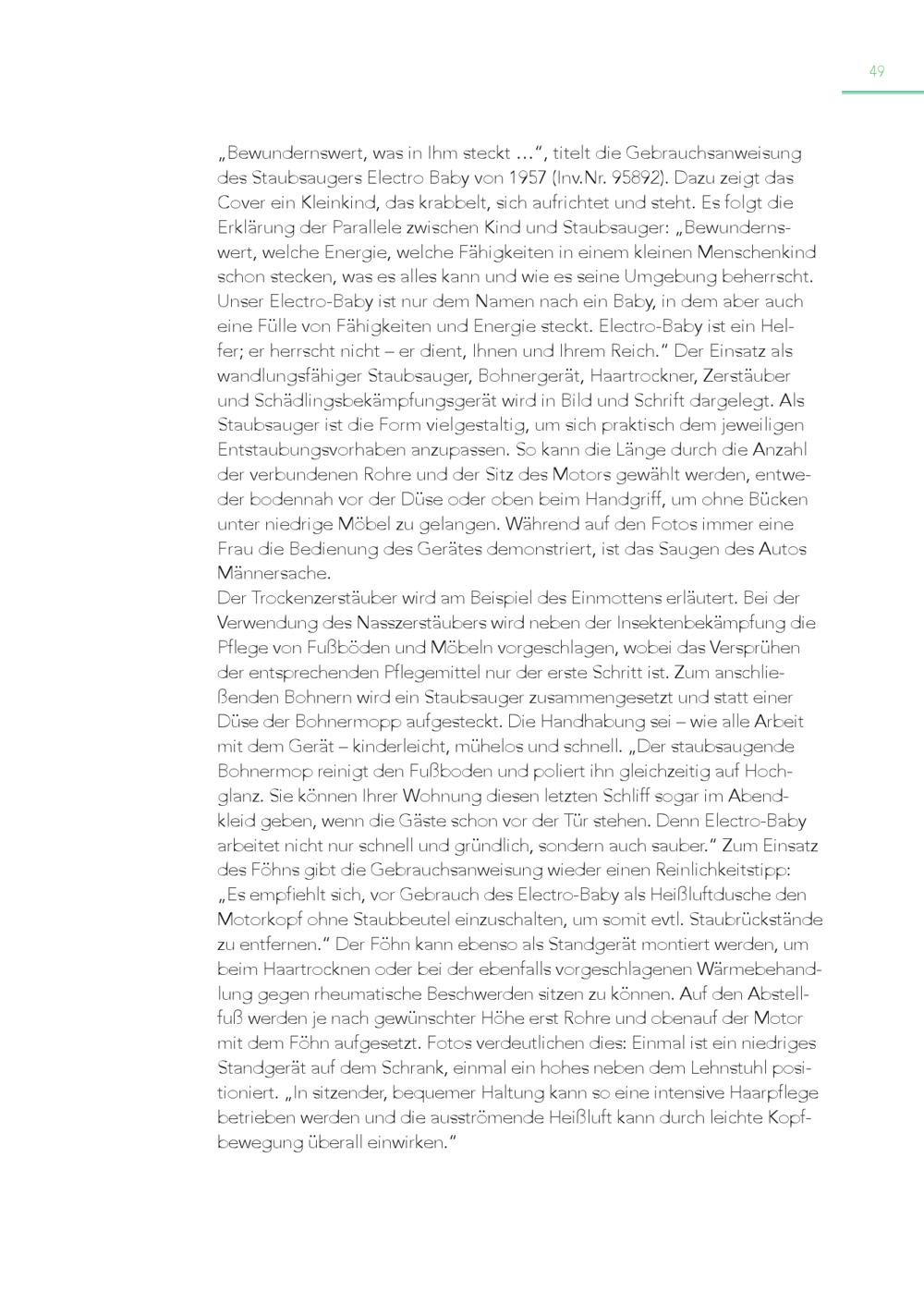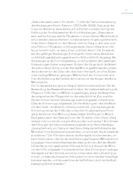 49 „Bewundernswert, was in Ihm steckt …“, titelt die Gebrauchsanweisung des Staubsaugers Electro Baby von 1957(Inv.Nr. 95892). Dazu zeigt das Cover ein Kleinkind, das krabbelt, sich aufrichtet und steht. Es folgt die Erklärung der Parallele zwischen Kind und Staubsauger:„Bewunderns wert, welche Energie, welche Fähigkeiten in einem kleinen Menschenkind schon stecken, was es alles kann und wie es seine Umgebung beherrscht. Unser Electro-Baby ist nur dem Namen nach ein Baby, in dem aber auch eine Fülle von Fähigkeiten und Energie steckt. Electro-Baby ist ein Hel fer; er herrscht nicht – er dient, Ihnen und Ihrem Reich.“ Der Einsatz als wandlungsfähiger Staubsauger, Bohnergerät, Haartrockner, Zerstäuber und Schädlingsbekämpfungsgerät wird in Bild und Schrift dargelegt. Als Staubsauger ist die Form vielgestaltig, um sich praktisch dem jeweiligen Entstaubungsvorhaben anzupassen. So kann die Länge durch die Anzahl der verbundenen Rohre und der Sitz des Motors gewählt werden, entweder bodennah vor der Düse oder oben beim Handgriff, um ohne Bücken unter niedrige Möbel zu gelangen. Während auf den Fotos immer eine Frau die Bedienung des Gerätes demonstriert, ist das Saugen des Autos Männersache. Der Trockenzerstäuber wird am Beispiel des Einmottens erläutert. Bei der Verwendung des Nasszerstäubers wird neben der Insektenbekämpfung die Pflege von Fußböden und Möbeln vorgeschlagen, wobei das Versprühen der entsprechenden Pflegemittel nur der erste Schritt ist. Zum anschlie ßenden Bohnern wird ein Staubsauger zusammengesetzt und statt einer Düse der Bohnermopp aufgesteckt. Die Handhabung sei – wie alle Arbeit mit dem Gerät – kinderleicht, mühelos und schnell.„Der staubsaugende Bohnermop reinigt den Fußboden und poliert ihn gleichzeitig auf Hochglanz. Sie können Ihrer Wohnung diesen letzten Schliff sogar im Abend kleid geben, wenn die Gäste schon vor der Tür stehen. Denn Electro-Baby arbeitet nicht nur schnell und gründlich, sondern auch sauber.“ Zum Einsatz des Föhns gibt die Gebrauchsanweisung wieder einen Reinlichkeitstipp: „Es empfiehlt sich, vor Gebrauch des Electro-Baby als Heißluftdusche den Motorkopf ohne Staubbeutel einzuschalten, um somit evtl. Staubrückstände zu entfernen.“ Der Föhn kann ebenso als Standgerät montiert werden, um beim Haartrocknen oder bei der ebenfalls vorgeschlagenen Wärmebehand lung gegen rheumatische Beschwerden sitzen zu können. Auf den Abstell fuß werden je nach gewünschter Höhe erst Rohre und obenauf der Motor mit dem Föhn aufgesetzt. Fotos verdeutlichen dies: Einmal ist ein niedriges Standgerät auf dem Schrank, einmal ein hohes neben dem Lehnstuhl positioniert.„In sitzender, bequemer Haltung kann so eine intensive Haarpflege betrieben werden und die ausströmende Heißluft kann durch leichte Kopf bewegung überall einwirken.“