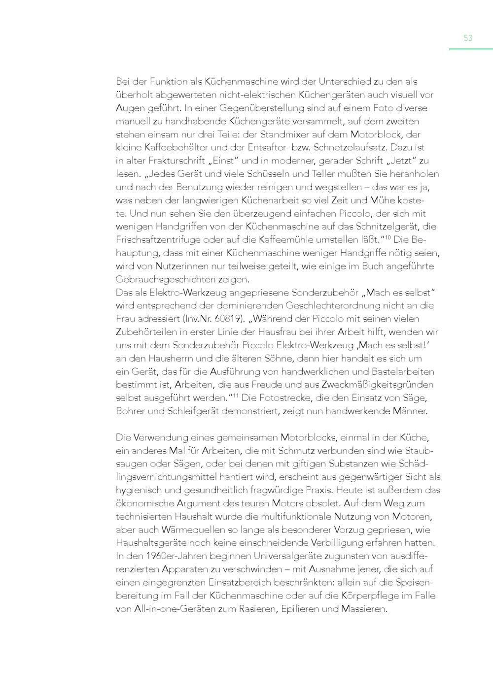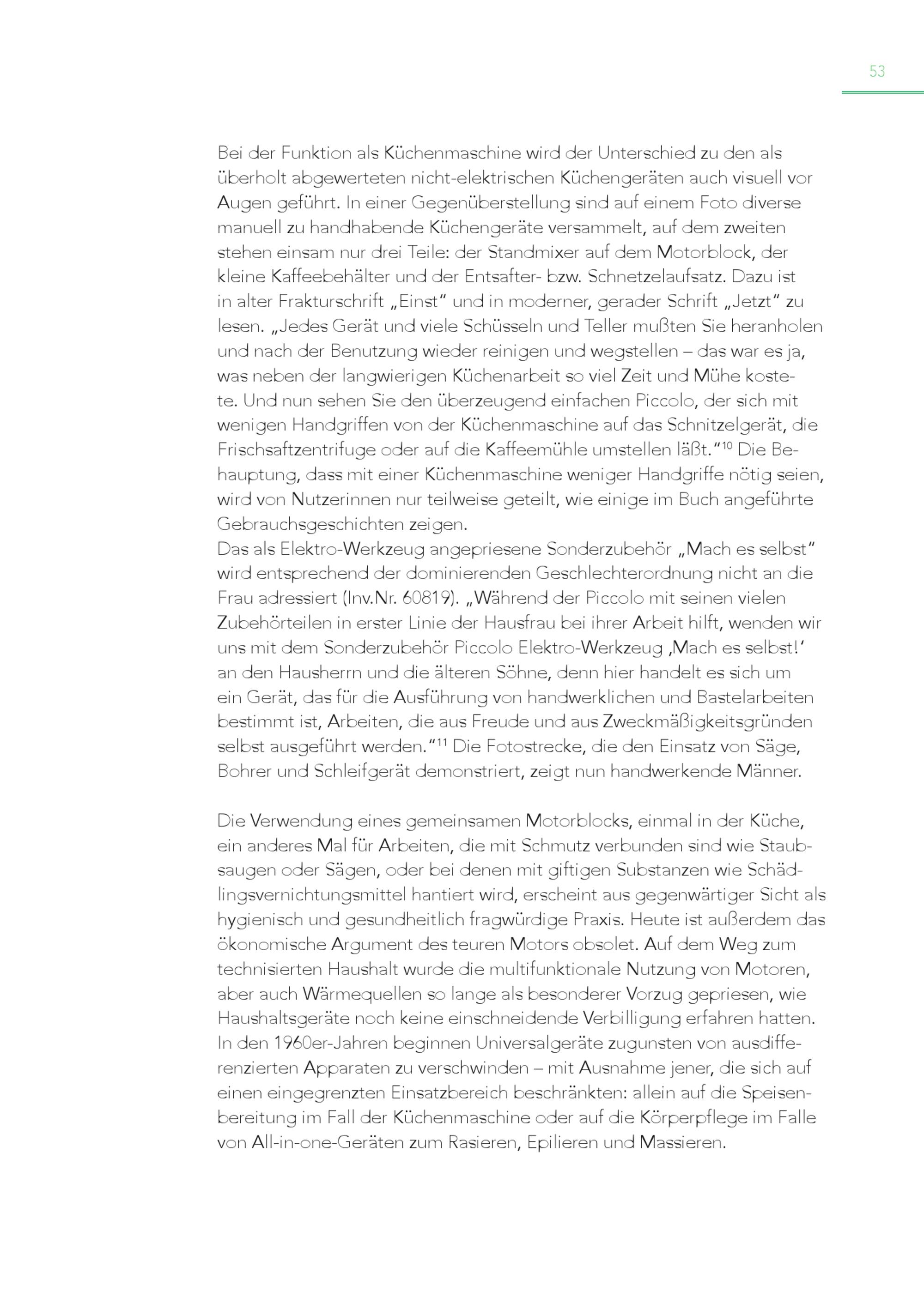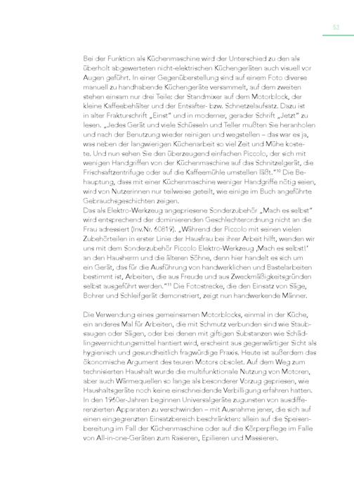 53 Bei der Funktion als Küchenmaschine wird der Unterschied zu den als überholt abgewerteten nicht-elektrischen Küchengeräten auch visuell vor Augen geführt. In einer Gegenüberstellung sind auf einem Foto diverse manuell zu handhabende Küchengeräte versammelt, auf dem zweiten stehen einsam nur drei Teile: der Standmixer auf dem Motorblock, der kleine Kaffeebehälter und der Entsafter- bzw. Schnetzelaufsatz. Dazu ist in alter Frakturschrift„Einst“ und in moderner, gerader Schrift„Jetzt“ zu lesen.„Jedes Gerät und viele Schüsseln und Teller mußten Sie heranholen und nach der Benutzung wieder reinigen und wegstellen – das war es ja, was neben der langwierigen Küchenarbeit so viel Zeit und Mühe kostete. Und nun sehen Sie den überzeugend einfachen Piccolo, der sich mit wenigen Handgriffen von der Küchenmaschine auf das Schnitzelgerät, die Frischsaftzentrifuge oder auf die Kaffeemühle umstellen läßt.“ 10 Die Behauptung, dass mit einer Küchenmaschine weniger Handgriffe nötig seien, wird von Nutzerinnen nur teilweise geteilt, wie einige im Buch angeführte Gebrauchsgeschichten zeigen. Das als Elektro-Werkzeug angepriesene Sonderzubehör„Mach es selbst“ wird entsprechend der dominierenden Geschlechterordnung nicht an die Frau adressiert(Inv.Nr. 60819).„Während der Piccolo mit seinen vielen Zubehörteilen in erster Linie der Hausfrau bei ihrer Arbeit hilft, wenden wir uns mit dem Sonderzubehör Piccolo Elektro-Werkzeug ‚Mach es selbst!‘ an den Hausherrn und die älteren Söhne, denn hier handelt es sich um ein Gerät, das für die Ausführung von handwerklichen und Bastelarbeiten bestimmt ist, Arbeiten, die aus Freude und aus Zweckmäßigkeitsgründen selbst ausgeführt werden.“ 11 Die Fotostrecke, die den Einsatz von Säge, Bohrer und Schleifgerät demonstriert, zeigt nun handwerkende Männer. Die Verwendung eines gemeinsamen Motorblocks, einmal in der Küche, ein anderes Mal für Arbeiten, die mit Schmutz verbunden sind wie Staub saugen oder Sägen, oder bei denen mit giftigen Substanzen wie Schädlingsvernichtungsmittel hantiert wird, erscheint aus gegenwärtiger Sicht als hygienisch und gesundheitlich fragwürdige Praxis. Heute ist außerdem das ökonomische Argument des teuren Motors obsolet. Auf dem Weg zum technisierten Haushalt wurde die multifunktionale Nutzung von Motoren, aber auch Wärmequellen so lange als besonderer Vorzug gepriesen, wie Haushaltsgeräte noch keine einschneidende Verbilligung erfahren hatten. In den 1960er-Jahren beginnen Universalgeräte zugunsten von ausdifferenzierten Apparaten zu verschwinden – mit Ausnahme jener, die sich auf einen eingegrenzten Einsatzbereich beschränkten: allein auf die Speisen bereitung im Fall der Küchenmaschine oder auf die Körperpflege im Falle von All-in-one-Geräten zum Rasieren, Epilieren und Massieren.