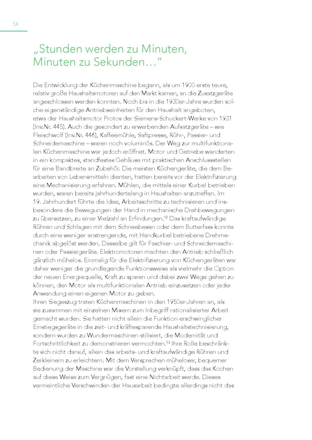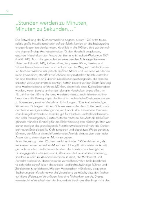 54 „Stunden werden zu Minuten, Minuten zu Sekunden…“ Die Entwicklung der Küchenmaschine begann, als um 1900 erste teure, relativ große Haushaltsmotoren auf den Markt kamen, an die Zusatzgeräte angeschlossen werden konnten. Noch bis in die 1930er-Jahre wurden solche eigenständige Antriebseinheiten für den Haushalt angeboten, etwa der Haushaltsmotor Protos der Siemens-Schuckert-Werke von 1931 (Inv.Nr. 445). Auch die gesondert zu erwerbenden Aufsatzgeräte – wie Fleischwolf(Inv.Nr. 446), Kaffeemühle, Saftpresse, Rühr-, Passier- und Schneidemaschine – waren noch voluminös. Der Weg zur multifunktiona len Küchenmaschine war jedoch eröffnet. Motor und Getriebe wanderten in ein kompaktes, standfestes Gehäuse mit praktischen Anschlussstellen für eine Bandbreite an Zubehör. Die meisten Küchengeräte, die dem Be arbeiten von Lebensmitteln dienten, hatten bereits vor der Elektrifizierung eine Mechanisierung erfahren. Mühlen, die mittels einer Kurbel betrieben wurden, waren bereits jahrhundertelang in Haushalten anzutreffen. Im 19. Jahrhundert führte die Idee, Arbeitsschritte zu technisieren und ins besondere die Bewegungen der Hand in mechanische Drehbewegungen zu übersetzen, zu einer Vielzahl an Erfindungen. 12 Das kraftaufwändige Rühren und Schlagen mit dem Schneebesen oder dem Butterfass konnte durch eine weniger anstrengende, mit Handkurbel betriebene Drehmechanik abgelöst werden. Dasselbe gilt für Faschier- und Schneidemaschi nen oder Passiergeräte. Elektromotoren machten den Antrieb schließlich gänzlich mühelos. Einmalig für die Elektrifizierung von Küchengeräten war daher weniger die grundlegende Funktionsweise als vielmehr die Option der neuen Energiequelle, Kraft zu sparen und dabei zwei Wege gehen zu können, den Motor als multifunktionalen Antrieb einzusetzen oder jeder Anwendung einen eigenen Motor zu geben. Ihren Siegeszug traten Küchenmaschinen in den 1950er-Jahren an, als sie zusammen mit einzelnen Mixern zum Inbegriff rationalisierter Arbeit gemacht wurden. Sie hatten nicht allein die Funktion erschwinglicher Einstiegsgeräte in die zeit- und kräftesparende Haushaltstechnisierung, sondern wurden zu Wundermaschinen stilisiert, die Modernität und Fortschrittlichkeit zu demonstrieren vermochten. 13 Ihre Rolle beschränkte sich nicht darauf, allein das arbeits- und kraftaufwändige Rühren und Zerkleinern zu erleichtern. Mit dem Versprechen müheloser, bequemer Bedienung der Maschine war die Vorstellung verknüpft, dass das Kochen auf diese Weise zum Vergnügen, fast eine Nichtarbeit werde. Dieses vermeintliche Verschwinden der Hausarbeit bedingte allerdings nicht das