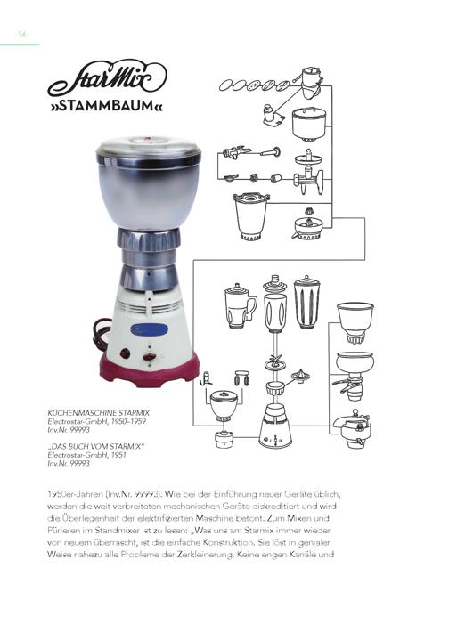 56 STAMMBAUM « KÜCHENMASCHINE STARMIX Electrostar-GmbH, 1950–1959 Inv.Nr. 99993 „DAS BUCH VOM STARMIX“ Electrostar-GmbH, 1951 Inv.Nr. 99993 1950er-Jahren(Inv.Nr. 99993). Wie bei der Einführung neuer Geräte üblich, werden die weit verbreiteten mechanischen Geräte diskreditiert und wird die Überlegenheit der elektrifizierten Maschine betont. Zum Mixen und Pürieren im Standmixer ist zu lesen:„Was uns am Starmix immer wieder von neuem überrascht, ist die einfache Konstruktion. Sie löst in genialer Weise nahezu alle Probleme der Zerkleinerung. Keine engen Kanäle und