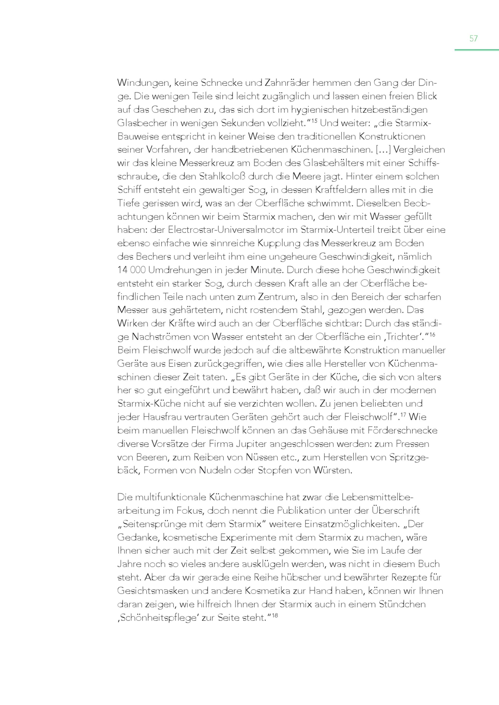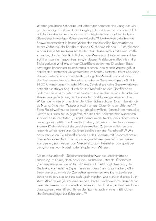 57 Windungen, keine Schnecke und Zahnräder hemmen den Gang der Din ge. Die wenigen Teile sind leicht zugänglich und lassen einen freien Blick auf das Geschehen zu, das sich dort im hygienischen hitzebeständigen Glasbecher in wenigen Sekunden vollzieht.“ 15 Und weiter:„die StarmixBauweise entspricht in keiner Weise den traditionellen Konstruktionen seiner Vorfahren, der handbetriebenen Küchenmaschinen.[…] Vergleichen wir das kleine Messerkreuz am Boden des Glasbehälters mit einer Schiffsschraube, die den Stahlkoloß durch die Meere jagt. Hinter einem solchen Schiff entsteht ein gewaltiger Sog, in dessen Kraftfeldern alles mit in die Tiefe gerissen wird, was an der Oberfläche schwimmt. Dieselben Beob achtungen können wir beim Starmix machen, den wir mit Wasser gefüllt haben: der Electrostar-Universalmotor im Starmix-Unterteil treibt über eine ebenso einfache wie sinnreiche Kupplung das Messerkreuz am Boden des Bechers und verleiht ihm eine ungeheure Geschwindigkeit, nämlich 14 000 Umdrehungen in jeder Minute. Durch diese hohe Geschwindigkeit entsteht ein starker Sog, durch dessen Kraft alle an der Oberfläche be findlichen Teile nach unten zum Zentrum, also in den Bereich der scharfen Messer aus gehärtetem, nicht rostendem Stahl, gezogen werden. Das Wirken der Kräfte wird auch an der Oberfläche sichtbar: Durch das ständi ge Nachströmen von Wasser entsteht an der Oberfläche ein ‚Trichter‘.“ 16 Beim Fleischwolf wurde jedoch auf die altbewährte Konstruktion manueller Geräte aus Eisen zurückgegriffen, wie dies alle Hersteller von Küchenmaschinen dieser Zeit taten.„Es gibt Geräte in der Küche, die sich von alters her so gut eingeführt und bewährt haben, daß wir auch in der modernen Starmix-Küche nicht auf sie verzichten wollen. Zu jenen beliebten und jeder Hausfrau vertrauten Geräten gehört auch der Fleischwolf“. 17 Wie beim manuellen Fleischwolf können an das Gehäuse mit Förderschnecke diverse Vorsätze der Firma Jupiter angeschlossen werden: zum Pressen von Beeren, zum Reiben von Nüssen etc., zum Herstellen von Spritzgebäck, Formen von Nudeln oder Stopfen von Würsten. Die multifunktionale Küchenmaschine hat zwar die Lebensmittelbearbeitung im Fokus, doch nennt die Publikation unter der Überschrift „Seitensprünge mit dem Starmix“ weitere Einsatzmöglichkeiten.„Der Gedanke, kosmetische Experimente mit dem Starmix zu machen, wäre Ihnen sicher auch mit der Zeit selbst gekommen, wie Sie im Laufe der Jahre noch so vieles andere ausklügeln werden, was nicht in diesem Buch steht. Aber da wir gerade eine Reihe hübscher und bewährter Rezepte für Gesichtsmasken und andere Kosmetika zur Hand haben, können wir Ihnen daran zeigen, wie hilfreich Ihnen der Starmix auch in einem Stündchen ‚Schönheitspflege‘ zur Seite steht.“ 18