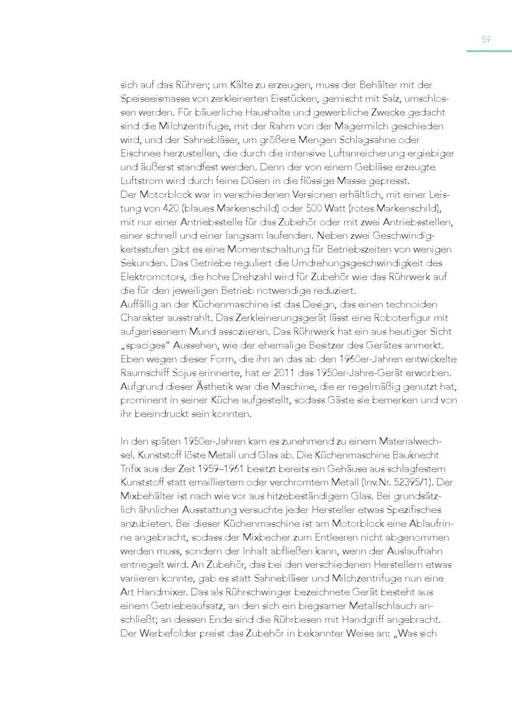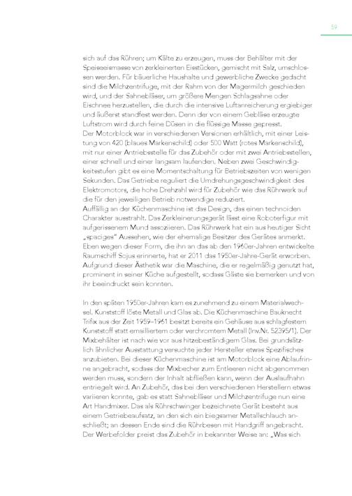 59 sich auf das Rühren; um Kälte zu erzeugen, muss der Behälter mit der Speiseeismasse von zerkleinerten Eisstücken, gemischt mit Salz, umschlossen werden. Für bäuerliche Haushalte und gewerbliche Zwecke gedacht sind die Milchzentrifuge, mit der Rahm von der Magermilch geschieden wird, und der Sahnebläser, um größere Mengen Schlagsahne oder Eischnee herzustellen, die durch die intensive Luftanreicherung ergiebiger und äußerst standfest werden. Denn der von einem Gebläse erzeugte Luftstrom wird durch feine Düsen in die flüssige Masse gepresst. Der Motorblock war in verschiedenen Versionen erhältlich, mit einer Leistung von 420(blaues Markenschild) oder 500 Watt(rotes Markenschild), mit nur einer Antriebsstelle für das Zubehör oder mit zwei Antriebsstellen, einer schnell und einer langsam laufenden. Neben zwei Geschwindigkeitsstufen gibt es eine Momentschaltung für Betriebszeiten von wenigen Sekunden. Das Getriebe reguliert die Umdrehungsgeschwindigkeit des Elektromotors, die hohe Drehzahl wird für Zubehör wie das Rührwerk auf die für den jeweiligen Betrieb notwendige reduziert. Auffällig an der Küchenmaschine ist das Design, das einen technoiden Charakter ausstrahlt. Das Zerkleinerungsgerät lässt eine Roboterfigur mit aufgerissenem Mund assoziieren. Das Rührwerk hat ein aus heutiger Sicht „spaciges“ Aussehen, wie der ehemalige Besitzer des Gerätes anmerkt. Eben wegen dieser Form, die ihn an das ab den 1960er-Jahren entwickelte Raumschiff Sojus erinnerte, hat er 2011 das 1950er-Jahre-Gerät erworben. Aufgrund dieser Ästhetik war die Maschine, die er regelmäßig genutzt hat, prominent in seiner Küche aufgestellt, sodass Gäste sie bemerken und von ihr beeindruckt sein konnten. In den späten 1950er-Jahren kam es zunehmend zu einem Materialwechsel. Kunststoff löste Metall und Glas ab. Die Küchenmaschine Bauknecht Trifix aus der Zeit 1959–1961 besitzt bereits ein Gehäuse aus schlagfestem Kunststoff statt emailliertem oder verchromtem Metall(Inv.Nr. 52395/1). Der Mixbehälter ist nach wie vor aus hitzebeständigem Glas. Bei grundsätz lich ähnlicher Ausstattung versuchte jeder Hersteller etwas Spezifisches anzubieten. Bei dieser Küchenmaschine ist am Motorblock eine Ablaufrin ne angebracht, sodass der Mixbecher zum Entleeren nicht abgenommen werden muss, sondern der Inhalt abfließen kann, wenn der Auslaufhahn entriegelt wird. An Zubehör, das bei den verschiedenen Herstellern etwas variieren konnte, gab es statt Sahnebläser und Milchzentrifuge nun eine Art Handmixer. Das als Rührschwinger bezeichnete Gerät besteht aus einem Getriebeaufsatz, an den sich ein biegsamer Metallschlauch anschließt; an dessen Ende sind die Rührbesen mit Handgriff angebracht. Der Werbefolder preist das Zubehör in bekannter Weise an:„Was sich