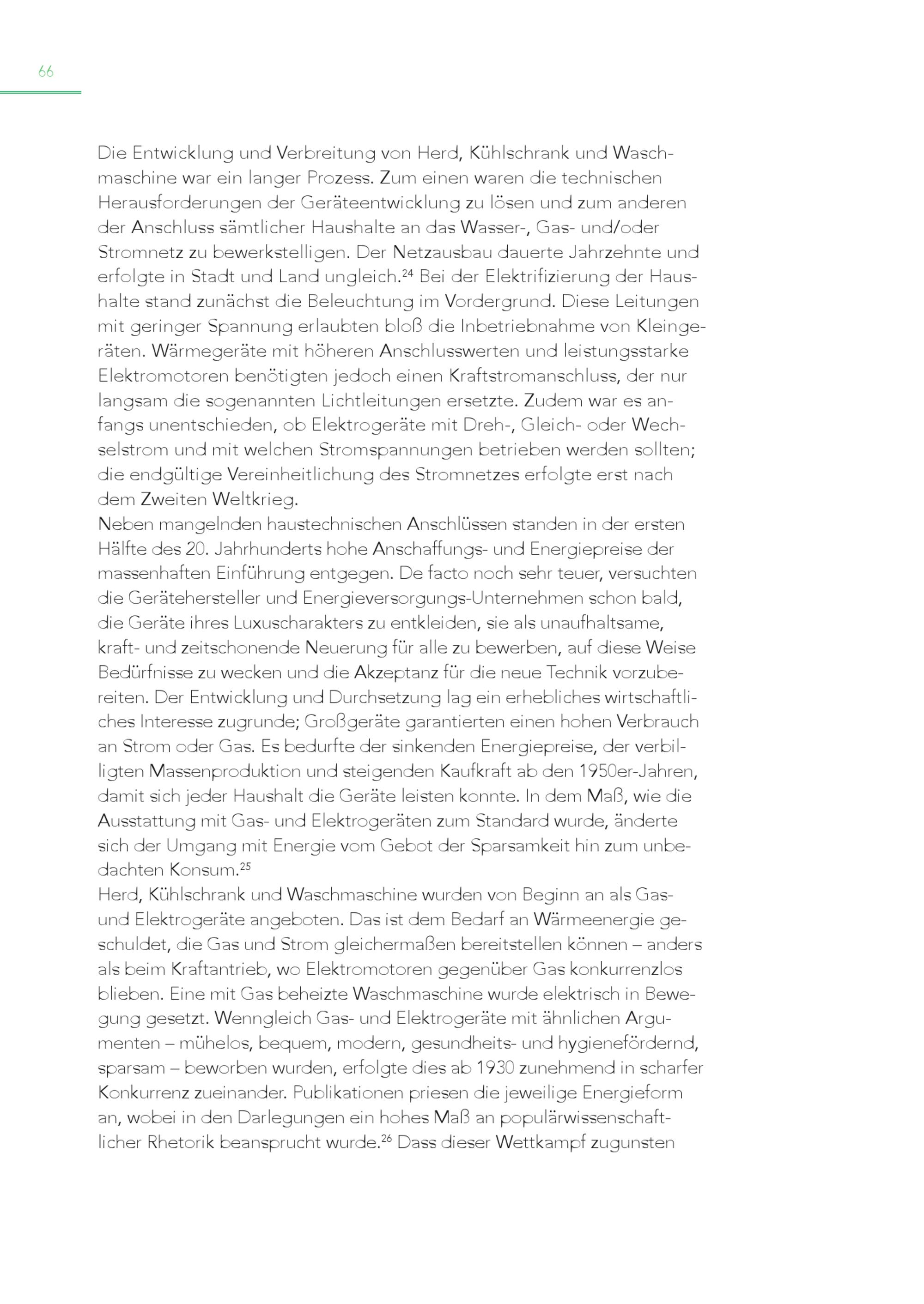 66 Die Entwicklung und Verbreitung von Herd, Kühlschrank und Waschmaschine war ein langer Prozess. Zum einen waren die technischen Herausforderungen der Geräteentwicklung zu lösen und zum anderen der Anschluss sämtlicher Haushalte an das Wasser-, Gas- und/oder Stromnetz zu bewerkstelligen. Der Netzausbau dauerte Jahrzehnte und erfolgte in Stadt und Land ungleich. 24 Bei der Elektrifizierung der Haus halte stand zunächst die Beleuchtung im Vordergrund. Diese Leitungen mit geringer Spannung erlaubten bloß die Inbetriebnahme von Kleingeräten. Wärmegeräte mit höheren Anschlusswerten und leistungsstarke Elektromotoren benötigten jedoch einen Kraftstromanschluss, der nur langsam die sogenannten Lichtleitungen ersetzte. Zudem war es anfangs unentschieden, ob Elektrogeräte mit Dreh-, Gleich- oder Wechselstrom und mit welchen Stromspannungen betrieben werden sollten; die endgültige Vereinheitlichung des Stromnetzes erfolgte erst nach dem Zweiten Weltkrieg. Neben mangelnden haustechnischen Anschlüssen standen in der ersten Hälfte des 20. Jahrhunderts hohe Anschaffungs- und Energiepreise der massenhaften Einführung entgegen. De facto noch sehr teuer, versuchten die Gerätehersteller und Energieversorgungs-Unternehmen schon bald, die Geräte ihres Luxuscharakters zu entkleiden, sie als unaufhaltsame, kraft- und zeitschonende Neuerung für alle zu bewerben, auf diese Weise Bedürfnisse zu wecken und die Akzeptanz für die neue Technik vorzubereiten. Der Entwicklung und Durchsetzung lag ein erhebliches wirtschaftliches Interesse zugrunde; Großgeräte garantierten einen hohen Verbrauch an Strom oder Gas. Es bedurfte der sinkenden Energiepreise, der verbilligten Massenproduktion und steigenden Kaufkraft ab den 1950er-Jahren, damit sich jeder Haushalt die Geräte leisten konnte. In dem Maß, wie die Ausstattung mit Gas- und Elektrogeräten zum Standard wurde, änderte sich der Umgang mit Energie vom Gebot der Sparsamkeit hin zum unbedachten Konsum. 25 Herd, Kühlschrank und Waschmaschine wurden von Beginn an als Gasund Elektrogeräte angeboten. Das ist dem Bedarf an Wärmeenergie geschuldet, die Gas und Strom gleichermaßen bereitstellen können – anders als beim Kraftantrieb, wo Elektromotoren gegenüber Gas konkurrenzlos blieben. Eine mit Gas beheizte Waschmaschine wurde elektrisch in Bewegung gesetzt. Wenngleich Gas- und Elektrogeräte mit ähnlichen Argumenten – mühelos, bequem, modern, gesundheits- und hygienefördernd, sparsam – beworben wurden, erfolgte dies ab 1930 zunehmend in scharfer Konkurrenz zueinander. Publikationen priesen die jeweilige Energieform an, wobei in den Darlegungen ein hohes Maß an populärwissenschaftlicher Rhetorik beansprucht wurde. 26 Dass dieser Wettkampf zugunsten