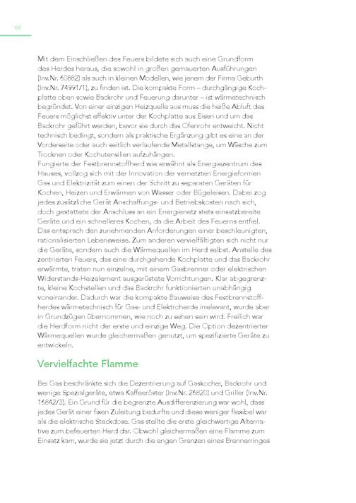 68 Mit dem Einschließen des Feuers bildete sich auch eine Grundform des Herdes heraus, die sowohl in großen gemauerten Ausführungen (Inv.Nr. 60882) als auch in kleinen Modellen, wie jenem der Firma Geburth (Inv.Nr. 74991/1), zu finden ist. Die kompakte Form – durchgängige Koch platte oben sowie Backrohr und Feuerung darunter – ist wärmetechnisch begründet. Von einer einzigen Heizquelle aus muss die heiße Abluft des Feuers möglichst effektiv unter der Kochplatte aus Eisen und um das Backrohr geführt werden, bevor sie durch das Ofenrohr entweicht. Nicht technisch bedingt, sondern als praktische Ergänzung gibt es eine an der Vorderseite oder auch seitlich verlaufende Metallstange, um Wäsche zum Trocknen oder Kochutensilien aufzuhängen. Fungierte der Festbrennstoffherd wie erwähnt als Energiezentrum des Hauses, vollzog sich mit der Innovation der vernetzten Energieformen Gas und Elektrizität zum einen der Schritt zu separaten Geräten für Kochen, Heizen und Erwärmen von Wasser oder Bügeleisen. Dabei zog jedes zusätzliche Gerät Anschaffungs- und Betriebskosten nach sich, doch gestattete der Anschluss an ein Energienetz stets einsatzbereite Geräte und ein schnelleres Kochen, da die Arbeit des Feuerns entfiel. Das entsprach den zunehmenden Anforderungen einer beschleunigten, rationalisierten Lebensweise. Zum anderen vervielfältigten sich nicht nur die Geräte, sondern auch die Wärmequellen im Herd selbst. Anstelle des zentrierten Feuers, das eine durchgehende Kochplatte und das Backrohr erwärmte, traten nun einzelne, mit einem Gasbrenner oder elektrischen Widerstands-Heizelement ausgerüstete Vorrichtungen. Klar abgegrenzte, kleine Kochstellen und das Backrohr funktionierten unabhängig voneinander. Dadurch war die kompakte Bauweise des Festbrennstoffherdes wärmetechnisch für Gas- und Elektroherde irrelevant, wurde aber in Grundzügen übernommen, wie noch zu sehen sein wird. Freilich war die Herdform nicht der erste und einzige Weg. Die Option dezentrierter Wärmequellen wurde gleichermaßen genutzt, um spezifizierte Geräte zu entwickeln. Vervielfachte Flamme Bei Gas beschränkte sich die Dezentrierung auf Gaskocher, Backrohr und wenige Spezialgeräte, etwa Kaffeeröster(Inv.Nr. 26820) und Griller(Inv.Nr. 16842/3). Ein Grund für die begrenzte Ausdifferenzierung war wohl, dass jedes Gerät einer fixen Zuleitung bedurfte und diese weniger flexibel war als die elektrische Steckdose. Gas stellte die erste gleichwertige Alternative zum befeuerten Herd dar. Obwohl gleichermaßen eine Flamme zum Einsatz kam, wurde sie jetzt durch die engen Grenzen eines Brennerringes