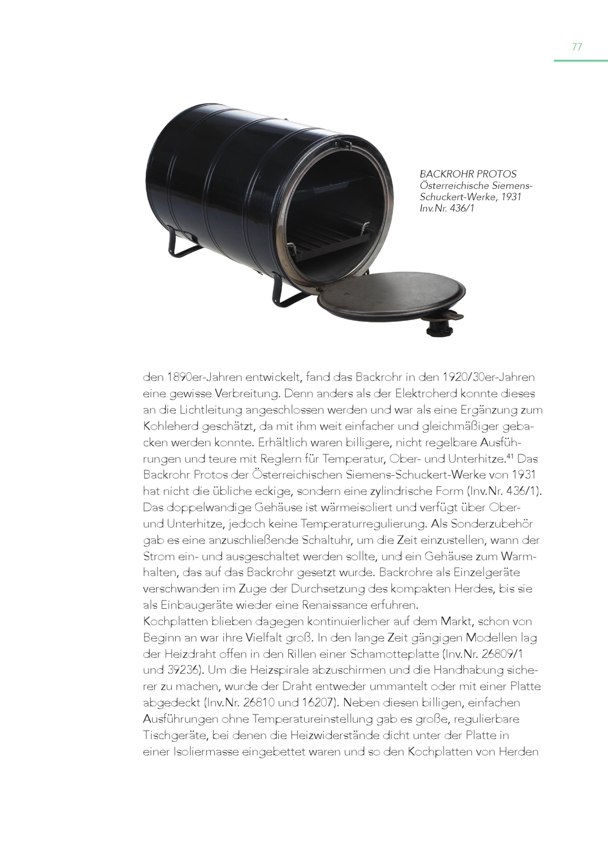 77 BACKROHR PROTOS Österreichische SiemensSchuckert-Werke, 1931 Inv.Nr. 436/1 den 1890er-Jahren entwickelt, fand das Backrohr in den 1920/30er-Jahren eine gewisse Verbreitung. Denn anders als der Elektroherd konnte dieses an die Lichtleitung angeschlossen werden und war als eine Ergänzung zum Kohleherd geschätzt, da mit ihm weit einfacher und gleichmäßiger gebacken werden konnte. Erhältlich waren billigere, nicht regelbare Ausführungen und teure mit Reglern für Temperatur, Ober- und Unterhitze. 41 Das Backrohr Protos der Österreichischen Siemens-Schuckert-Werke von 1931 hat nicht die übliche eckige, sondern eine zylindrische Form(Inv.Nr. 436/1). Das doppelwandige Gehäuse ist wärmeisoliert und verfügt über Oberund Unterhitze, jedoch keine Temperaturregulierung. Als Sonderzubehör gab es eine anzuschließende Schaltuhr, um die Zeit einzustellen, wann der Strom ein- und ausgeschaltet werden sollte, und ein Gehäuse zum Warmhalten, das auf das Backrohr gesetzt wurde. Backrohre als Einzelgeräte verschwanden im Zuge der Durchsetzung des kompakten Herdes, bis sie als Einbaugeräte wieder eine Renaissance erfuhren. Kochplatten blieben dagegen kontinuierlicher auf dem Markt, schon von Beginn an war ihre Vielfalt groß. In den lange Zeit gängigen Modellen lag der Heizdraht offen in den Rillen einer Schamotteplatte(Inv.Nr. 26809/1 und 39236). Um die Heizspirale abzuschirmen und die Handhabung sicherer zu machen, wurde der Draht entweder ummantelt oder mit einer Platte abgedeckt(Inv.Nr. 26810 und 16207). Neben diesen billigen, einfachen Ausführungen ohne Temperatureinstellung gab es große, regulierbare Tischgeräte, bei denen die Heizwiderstände dicht unter der Platte in einer Isoliermasse eingebettet waren und so den Kochplatten von Herden