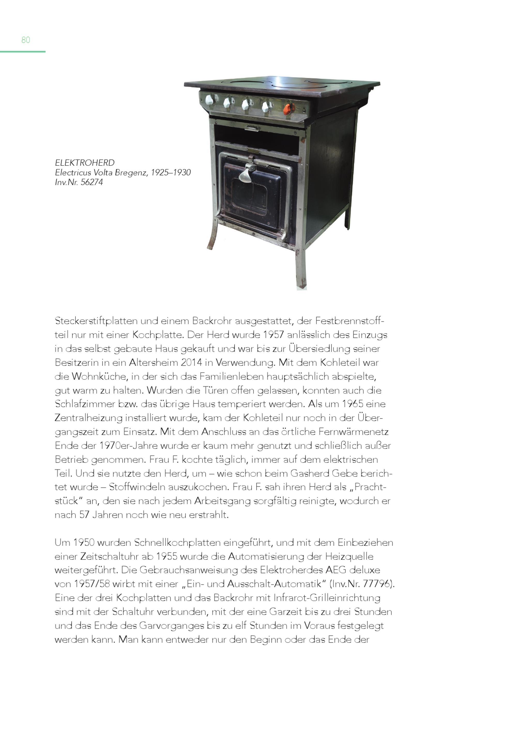 80 ELEKTROHERD Electricus Volta Bregenz, 1925–1930 Inv.Nr. 56274 Steckerstiftplatten und einem Backrohr ausgestattet, der Festbrennstoffteil nur mit einer Kochplatte. Der Herd wurde 1957 anlässlich des Einzugs in das selbst gebaute Haus gekauft und war bis zur Übersiedlung seiner Besitzerin in ein Altersheim 2014 in Verwendung. Mit dem Kohleteil war die Wohnküche, in der sich das Familienleben hauptsächlich abspielte, gut warm zu halten. Wurden die Türen offen gelassen, konnten auch die Schlafzimmer bzw. das übrige Haus temperiert werden. Als um 1965 eine Zentralheizung installiert wurde, kam der Kohleteil nur noch in der Übergangszeit zum Einsatz. Mit dem Anschluss an das örtliche Fernwärmenetz Ende der 1970er-Jahre wurde er kaum mehr genutzt und schließlich außer Betrieb genommen. Frau F. kochte täglich, immer auf dem elektrischen Teil. Und sie nutzte den Herd, um – wie schon beim Gasherd Gebe berichtet wurde – Stoffwindeln auszukochen. Frau F. sah ihren Herd als„Prachtstück“ an, den sie nach jedem Arbeitsgang sorgfältig reinigte, wodurch er nach 57 Jahren noch wie neu erstrahlt. Um 1950 wurden Schnellkochplatten eingeführt, und mit dem Einbeziehen einer Zeitschaltuhr ab 1955 wurde die Automatisierung der Heizquelle weitergeführt. Die Gebrauchsanweisung des Elektroherdes AEG deluxe von 1957/58 wirbt mit einer„Ein- und Ausschalt-Automatik“(Inv.Nr. 77796). Eine der drei Kochplatten und das Backrohr mit Infrarot-Grilleinrichtung sind mit der Schaltuhr verbunden, mit der eine Garzeit bis zu drei Stunden und das Ende des Garvorganges bis zu elf Stunden im Voraus festgelegt werden kann. Man kann entweder nur den Beginn oder das Ende der