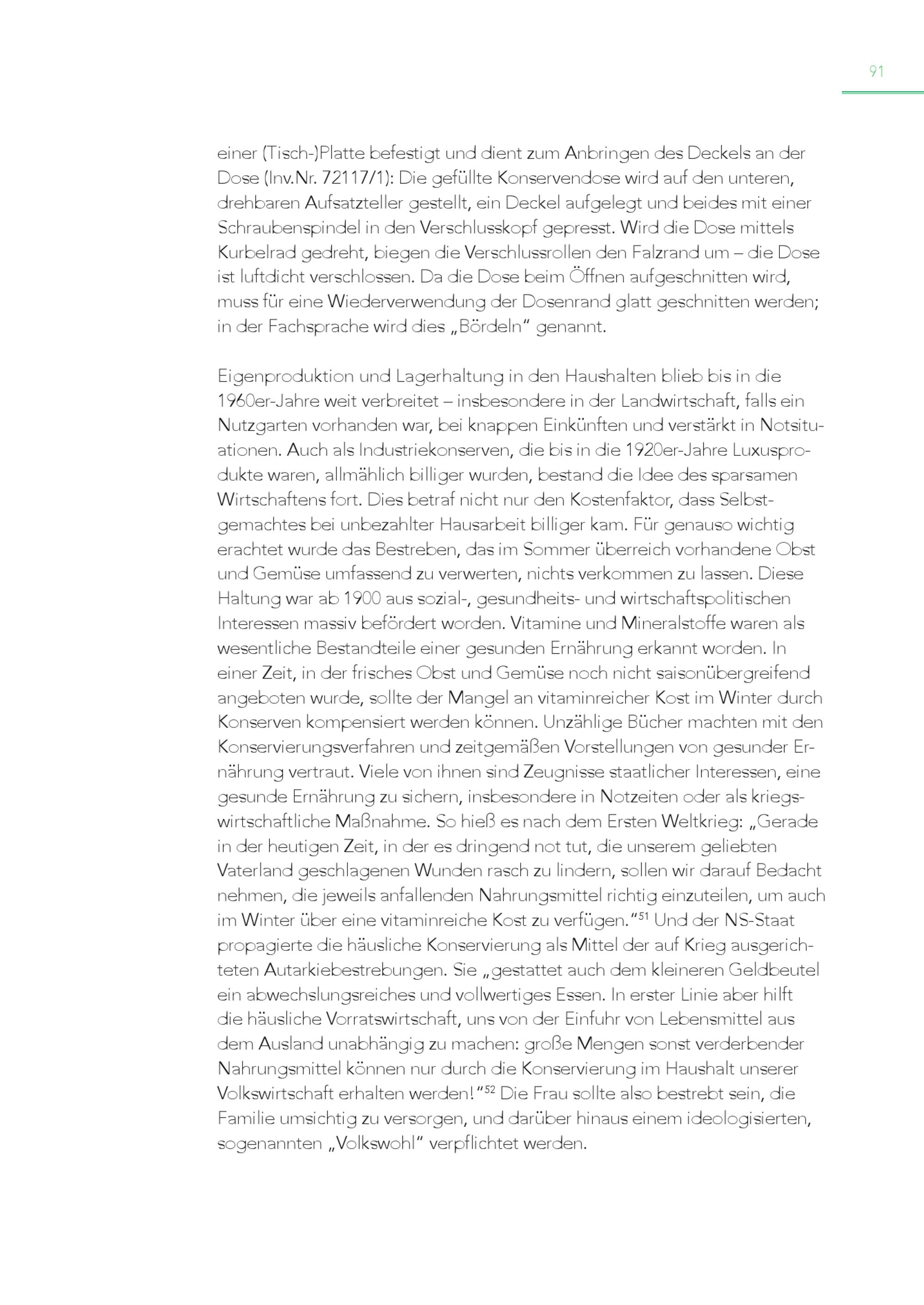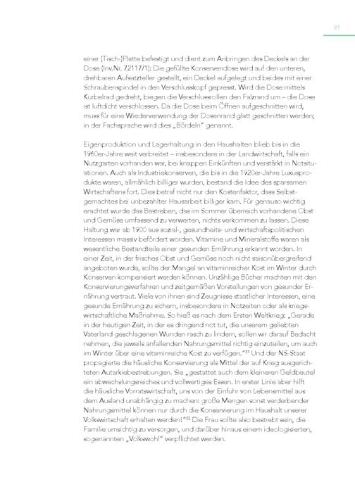 91 einer(Tisch-)Platte befestigt und dient zum Anbringen des Deckels an der Dose(Inv.Nr. 72117/1): Die gefüllte Konservendose wird auf den unteren, drehbaren Aufsatzteller gestellt, ein Deckel aufgelegt und beides mit einer Schraubenspindel in den Verschlusskopf gepresst. Wird die Dose mittels Kurbelrad gedreht, biegen die Verschlussrollen den Falzrand um – die Dose ist luftdicht verschlossen. Da die Dose beim Öffnen aufgeschnitten wird, muss für eine Wiederverwendung der Dosenrand glatt geschnitten werden; in der Fachsprache wird dies„Bördeln“ genannt. Eigenproduktion und Lagerhaltung in den Haushalten blieb bis in die 1960er-Jahre weit verbreitet – insbesondere in der Landwirtschaft, falls ein Nutzgarten vorhanden war, bei knappen Einkünften und verstärkt in Notsituationen. Auch als Industriekonserven, die bis in die 1920er-Jahre Luxusprodukte waren, allmählich billiger wurden, bestand die Idee des sparsamen Wirtschaftens fort. Dies betraf nicht nur den Kostenfaktor, dass Selbstgemachtes bei unbezahlter Hausarbeit billiger kam. Für genauso wichtig erachtet wurde das Bestreben, das im Sommer überreich vorhandene Obst und Gemüse umfassend zu verwerten, nichts verkommen zu lassen. Diese Haltung war ab 1900 aus sozial-, gesundheits- und wirtschaftspolitischen Interessen massiv befördert worden. Vitamine und Mineralstoffe waren als wesentliche Bestandteile einer gesunden Ernährung erkannt worden. In einer Zeit, in der frisches Obst und Gemüse noch nicht saisonübergreifend angeboten wurde, sollte der Mangel an vitaminreicher Kost im Winter durch Konserven kompensiert werden können. Unzählige Bücher machten mit den Konservierungsverfahren und zeitgemäßen Vorstellungen von gesunder Ernährung vertraut. Viele von ihnen sind Zeugnisse staatlicher Interessen, eine gesunde Ernährung zu sichern, insbesondere in Notzeiten oder als kriegswirtschaftliche Maßnahme. So hieß es nach dem Ersten Weltkrieg:„Gerade in der heutigen Zeit, in der es dringend not tut, die unserem geliebten Vaterland geschlagenen Wunden rasch zu lindern, sollen wir darauf Bedacht nehmen, die jeweils anfallenden Nahrungsmittel richtig einzuteilen, um auch im Winter über eine vitaminreiche Kost zu verfügen.“ 51 Und der NS-Staat propagierte die häusliche Konservierung als Mittel der auf Krieg ausgerichteten Autarkiebestrebungen. Sie„gestattet auch dem kleineren Geldbeutel ein abwechslungsreiches und vollwertiges Essen. In erster Linie aber hilft die häusliche Vorratswirtschaft, uns von der Einfuhr von Lebensmittel aus dem Ausland unabhängig zu machen: große Mengen sonst verderbender Nahrungsmittel können nur durch die Konservierung im Haushalt unserer Volkswirtschaft erhalten werden!“ 52 Die Frau sollte also bestrebt sein, die Familie umsichtig zu versorgen, und darüber hinaus einem ideologisierten, sogenannten„Volkswohl“ verpflichtet werden.