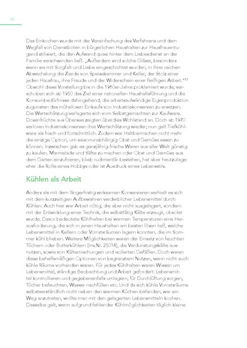 92 Das Einkochen wurde mit der Vereinfachung des Verfahrens und dem Wegfall von Dienstboten in bürgerlichen Haushalten zur Hausfrauentugend stilisiert, die den Aufwand quasi hinter dem Liebesdienst an der Familie verschwinden ließ.„Außerdem sind solche Gläser, besonders wenn sie mit Sorgfalt und Liebe eingeschichtet wurden, in ihrer reichen Abwechslung die Zierde von Speisekammer und Keller, der Stolz einer jeden Hausfrau, ihre Freude und der Widerschein einer fleißigen Arbeit.“ 53 Obwohl diese Vorstellung bis in die 1960er-Jahre proklamiert wurde, verschoben sich ab 1950 das Ziel einer rationellen Haushaltsführung und die Konsumbedürfnisse dahingehend, die arbeitsaufwändige Eigenproduktion zugunsten des mühelosen Einkaufs von Industriekonserven zu ersetzen. Die Wertschätzung verlagerte sich vom Selbstgemachten zur Kaufware. Dosenfrüchte aus Übersee zeigten überdies Wohlstand an. Doch ab 1970 verloren Industriekonserven ihre Wertschätzung wieder; nun galt Tiefkühlware als frisch und fortschrittlich. Zudem war Haltbarmachen nicht mehr die einzige Option, um saisonunabhängig Obst und Gemüse essen zu können. Inzwischen gab es ganzjährig frische Waren aus aller Welt günstig zu kaufen. Marmelade und Säfte zu machen oder Obst und Gemüse aus dem Garten einzufrieren, blieb rudimentär bestehen, hat aber heutzutage eher die Rolle eines Hobbys oder ist Ausdruck eines Lebensstils. Kühlen als Arbeit Anders als mit dem längerfristig wirksamen Konservieren verhielt es sich mit dem kurzzeitigen Aufbewahren verderblicher Lebensmittel durch Kühlen. Auch hier war Arbeit nötig, die aber nicht ausgelagert, sondern mit der Entwicklung einer Technik, die selbsttätig Kälte erzeugt, obsolet wurde. Davor bedeutete Kühlhalten bei warmen Temperaturen eine Herausforderung, die sich in jenen Haushalten am besten lösen ließ, welche Lebensmittel in Kellern oder Vorratsräumen lagern konnten, die im Sommer kühl blieben. Weitere Möglichkeiten waren der Einsatz von feuchten Tüchern oder Butterkühlern(Inv.Nr. 25014), die Verdunstungskälte ausnutzen, sowie von Kältemischungen und isolierten Gefäßen. Doch waren diese behelfsmäßigen Optionen von begrenztem Nutzen, wenn nicht auch kühle Räume vorhanden waren. Für jedes Kühlhalten waren Wissen um Lebensmittel, ständige Beobachtung und Arbeit gefordert: Lebensmittel kontrollieren und gegebenenfalls umlagern, für Durchlüftung sorgen, Tücher befeuchten, Wasser nachfüllen etc. Und da sich kühle Vorratsräume selbstverständlich nicht neben den warmen Küchen befanden, war ein Weg anzutreten, wollte man mit den gelagerten Lebensmitteln kochen. Dasselbe galt, wenn aufgrund fehlender Kühlmöglichkeiten täglich kleine