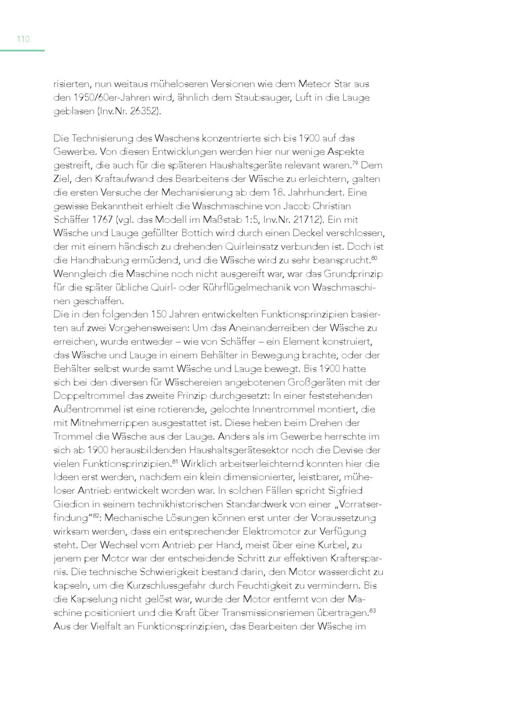 110 risierten, nun weitaus müheloseren Versionen wie dem Meteor Star aus den 1950/60er-Jahren wird, ähnlich dem Staubsauger, Luft in die Lauge geblasen(Inv.Nr. 26352). Die Technisierung des Waschens konzentrierte sich bis 1900 auf das Gewerbe. Von diesen Entwicklungen werden hier nur wenige Aspekte gestreift, die auch für die späteren Haushaltsgeräte relevant waren. 79 Dem Ziel, den Kraftaufwand des Bearbeitens der Wäsche zu erleichtern, galten die ersten Versuche der Mechanisierung ab dem 18. Jahrhundert. Eine gewisse Bekanntheit erhielt die Waschmaschine von Jacob Christian Schäffer 1767(vgl. das Modell im Maßstab 1:5, Inv.Nr. 21712). Ein mit Wäsche und Lauge gefüllter Bottich wird durch einen Deckel verschlossen, der mit einem händisch zu drehenden Quirleinsatz verbunden ist. Doch ist die Handhabung ermüdend, und die Wäsche wird zu sehr beansprucht. 80 Wenngleich die Maschine noch nicht ausgereift war, war das Grundprinzip für die später übliche Quirl- oder Rührflügelmechanik von Waschmaschi nen geschaffen. Die in den folgenden 150 Jahren entwickelten Funktionsprinzipien basierten auf zwei Vorgehensweisen: Um das Aneinanderreiben der Wäsche zu erreichen, wurde entweder – wie von Schäffer – ein Element konstruiert, das Wäsche und Lauge in einem Behälter in Bewegung brachte, oder der Behälter selbst wurde samt Wäsche und Lauge bewegt. Bis 1900 hatte sich bei den diversen für Wäschereien angebotenen Großgeräten mit der Doppeltrommel das zweite Prinzip durchgesetzt: In einer feststehenden Außentrommel ist eine rotierende, gelochte Innentrommel montiert, die mit Mitnehmerrippen ausgestattet ist. Diese heben beim Drehen der Trommel die Wäsche aus der Lauge. Anders als im Gewerbe herrschte im sich ab 1900 herausbildenden Haushaltsgerätesektor noch die Devise der vielen Funktionsprinzipien. 81 Wirklich arbeitserleichternd konnten hier die Ideen erst werden, nachdem ein klein dimensionierter, leistbarer, müheloser Antrieb entwickelt worden war. In solchen Fällen spricht Sigfried Giedion in seinem technikhistorischen Standardwerk von einer„Vorratserfindung“ 82 : Mechanische Lösungen können erst unter der Voraussetzung wirksam werden, dass ein entsprechender Elektromotor zur Verfügung steht. Der Wechsel vom Antrieb per Hand, meist über eine Kurbel, zu jenem per Motor war der entscheidende Schritt zur effektiven Kraftersparnis. Die technische Schwierigkeit bestand darin, den Motor wasserdicht zu kapseln, um die Kurzschlussgefahr durch Feuchtigkeit zu vermindern. Bis die Kapselung nicht gelöst war, wurde der Motor entfernt von der Maschine positioniert und die Kraft über Transmissionsriemen übertragen. 83 Aus der Vielfalt an Funktionsprinzipien, das Bearbeiten der Wäsche im
