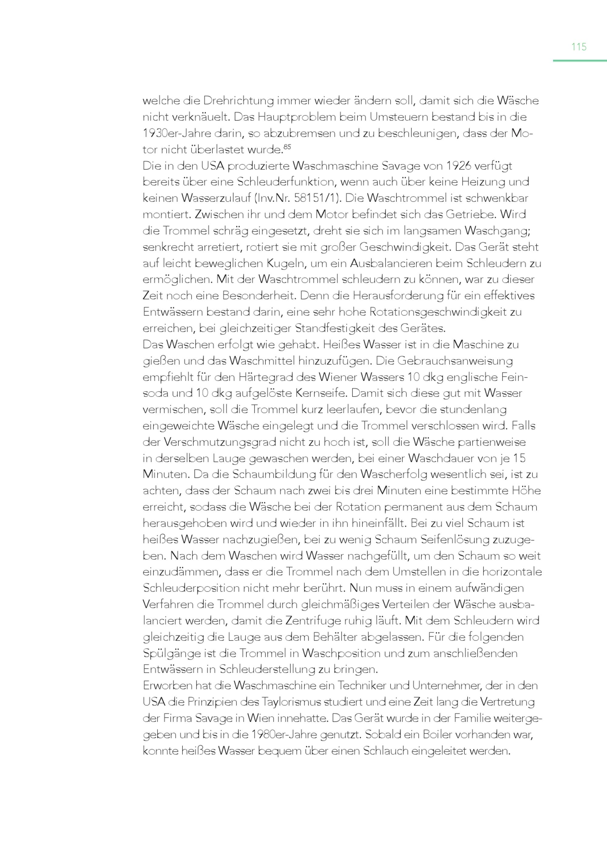 115 welche die Drehrichtung immer wieder ändern soll, damit sich die Wäsche nicht verknäuelt. Das Hauptproblem beim Umsteuern bestand bis in die 1930er-Jahre darin, so abzubremsen und zu beschleunigen, dass der Motor nicht überlastet wurde. 85 Die in den USA produzierte Waschmaschine Savage von 1926 verfügt bereits über eine Schleuderfunktion, wenn auch über keine Heizung und keinen Wasserzulauf(Inv.Nr. 58151/1). Die Waschtrommel ist schwenkbar montiert. Zwischen ihr und dem Motor befindet sich das Getriebe. Wird die Trommel schräg eingesetzt, dreht sie sich im langsamen Waschgang; senkrecht arretiert, rotiert sie mit großer Geschwindigkeit. Das Gerät steht auf leicht beweglichen Kugeln, um ein Ausbalancieren beim Schleudern zu ermöglichen. Mit der Waschtrommel schleudern zu können, war zu dieser Zeit noch eine Besonderheit. Denn die Herausforderung für ein effektives Entwässern bestand darin, eine sehr hohe Rotationsgeschwindigkeit zu erreichen, bei gleichzeitiger Standfestigkeit des Gerätes. Das Waschen erfolgt wie gehabt. Heißes Wasser ist in die Maschine zu gießen und das Waschmittel hinzuzufügen. Die Gebrauchsanweisung empfiehlt für den Härtegrad des Wiener Wassers 10 dkg englische Fein soda und 10 dkg aufgelöste Kernseife. Damit sich diese gut mit Wasser vermischen, soll die Trommel kurz leerlaufen, bevor die stundenlang eingeweichte Wäsche eingelegt und die Trommel verschlossen wird. Falls der Verschmutzungsgrad nicht zu hoch ist, soll die Wäsche partienweise in derselben Lauge gewaschen werden, bei einer Waschdauer von je 15 Minuten. Da die Schaumbildung für den Wascherfolg wesentlich sei, ist zu achten, dass der Schaum nach zwei bis drei Minuten eine bestimmte Höhe erreicht, sodass die Wäsche bei der Rotation permanent aus dem Schaum herausgehoben wird und wieder in ihn hineinfällt. Bei zu viel Schaum ist heißes Wasser nachzugießen, bei zu wenig Schaum Seifenlösung zuzugeben. Nach dem Waschen wird Wasser nachgefüllt, um den Schaum so weit einzudämmen, dass er die Trommel nach dem Umstellen in die horizontale Schleuderposition nicht mehr berührt. Nun muss in einem aufwändigen Verfahren die Trommel durch gleichmäßiges Verteilen der Wäsche ausbalanciert werden, damit die Zentrifuge ruhig läuft. Mit dem Schleudern wird gleichzeitig die Lauge aus dem Behälter abgelassen. Für die folgenden Spülgänge ist die Trommel in Waschposition und zum anschließenden Entwässern in Schleuderstellung zu bringen. Erworben hat die Waschmaschine ein Techniker und Unternehmer, der in den USA die Prinzipien des Taylorismus studiert und eine Zeit lang die Vertretung der Firma Savage in Wien innehatte. Das Gerät wurde in der Familie weitergegeben und bis in die 1980er-Jahre genutzt. Sobald ein Boiler vorhanden war, konnte heißes Wasser bequem über einen Schlauch eingeleitet werden.