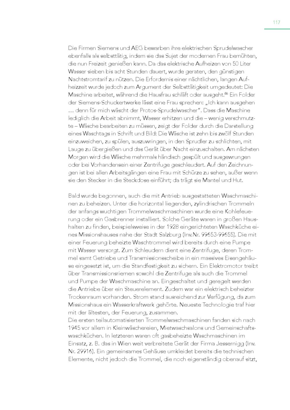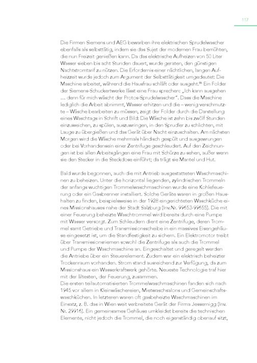 117 Die Firmen Siemens und AEG bewarben ihre elektrischen Sprudelwascher ebenfalls als selbsttätig, indem sie das Sujet der modernen Frau bemühten, die nun Freizeit genießen kann. Da das elektrische Aufheizen von 50 Liter Wasser sieben bis acht Stunden dauert, wurde geraten, den günstigen Nachtstromtarif zu nützen. Die Erfordernis einer nächtlichen, langen Aufheizzeit wurde jedoch zum Argument der Selbsttätigkeit umgedeutet: Die Maschine arbeitet, während die Hausfrau schläft oder ausgeht. 86 Ein Folder der Siemens-Schuckertwerke lässt eine Frau sprechen:„Ich kann ausgehen … denn für mich wäscht der Protos-Sprudelwascher“. Dass die Maschine lediglich die Arbeit abnimmt, Wasser erhitzen und die – wenig verschmutzte – Wäsche bearbeiten zu müssen, zeigt der Folder durch die Darstellung eines Waschtags in Schrift und Bild: Die Wäsche ist zehn bis zwölf Stunden einzuweichen, zu spülen, auszuwringen, in den Sprudler zu schlichten, mit Lauge zu übergießen und das Gerät über Nacht einzuschalten. Am nächsten Morgen wird die Wäsche mehrmals händisch gespült und ausgewrungen oder bei Vorhandensein einer Zentrifuge geschleudert. Auf den Zeichnungen ist bei allen Arbeitsgängen eine Frau mit Schürze zu sehen, außer wenn sie den Stecker in die Steckdose einführt; da trägt sie Mantel und Hut. Bald wurde begonnen, auch die mit Antrieb ausgestatteten Waschmaschinen zu beheizen. Unter die horizontal liegenden, zylindrischen Trommeln der anfangs wuchtigen Trommelwaschmaschinen wurde eine Kohlefeuerung oder ein Gasbrenner installiert. Solche Geräte waren in großen Haushalten zu finden, beispielsweise in der 1928 eingerichteten Waschküche ei nes Missionshauses nahe der Stadt Salzburg(Inv.Nr. 99653-99655). Die mit einer Feuerung beheizte Waschtrommel wird bereits durch eine Pumpe mit Wasser versorgt. Zum Schleudern dient eine Zentrifuge, deren Trommel samt Getriebe und Transmissionsscheibe in ein massives Eisengehäuse eingesetzt ist, um die Standfestigkeit zu sichern. Ein Elektromotor treibt über Transmissionsriemen sowohl die Zentrifuge als auch die Trommel und Pumpe der Waschmaschine an. Eingeschaltet und geregelt werden die Antriebe über ein Steuerelement. Zudem war ein elektrisch beheizter Trockenraum vorhanden. Strom stand ausreichend zur Verfügung, da zum Missionshaus ein Wasserkraftwerk gehörte. Neueste Technologie traf hier mit der ältesten, der Feuerung, zusammen. Die ersten teilautomatisierten Trommelwaschmaschinen fanden sich nach 1945 vor allem in Kleinwäschereien, Mietwaschsalons und Gemeinschaftswaschküchen. In letzteren waren oft gasbeheizte Waschmaschinen im Einsatz, z. B. das in Wien weit verbreitete Gerät der Firma Jessernigg(Inv. Nr. 29916). Ein gemeinsames Gehäuse umkleidet bereits die technischen Elemente, nicht jedoch die Trommel, die noch eigenständig obenauf sitzt,