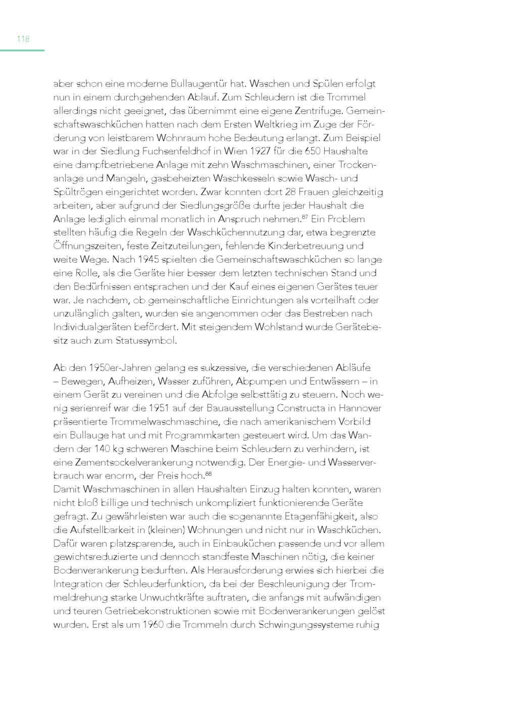 118 aber schon eine moderne Bullaugentür hat. Waschen und Spülen erfolgt nun in einem durchgehenden Ablauf. Zum Schleudern ist die Trommel allerdings nicht geeignet, das übernimmt eine eigene Zentrifuge. Gemeinschaftswaschküchen hatten nach dem Ersten Weltkrieg im Zuge der Förderung von leistbarem Wohnraum hohe Bedeutung erlangt. Zum Beispiel war in der Siedlung Fuchsenfeldhof in Wien 1927 für die 650 Haushalte eine dampfbetriebene Anlage mit zehn Waschmaschinen, einer Trockenanlage und Mangeln, gasbeheizten Waschkesseln sowie Wasch- und Spültrögen eingerichtet worden. Zwar konnten dort 28 Frauen gleichzeitig arbeiten, aber aufgrund der Siedlungsgröße durfte jeder Haushalt die Anlage lediglich einmal monatlich in Anspruch nehmen. 87 Ein Problem stellten häufig die Regeln der Waschküchennutzung dar, etwa begrenzte Öffnungszeiten, feste Zeitzuteilungen, fehlende Kinderbetreuung und weite Wege. Nach 1945 spielten die Gemeinschaftswaschküchen so lange eine Rolle, als die Geräte hier besser dem letzten technischen Stand und den Bedürfnissen entsprachen und der Kauf eines eigenen Gerätes teuer war. Je nachdem, ob gemeinschaftliche Einrichtungen als vorteilhaft oder unzulänglich galten, wurden sie angenommen oder das Bestreben nach Individualgeräten befördert. Mit steigendem Wohlstand wurde Gerätebesitz auch zum Statussymbol. Ab den 1950er-Jahren gelang es sukzessive, die verschiedenen Abläufe – Bewegen, Aufheizen, Wasser zuführen, Abpumpen und Entwässern – in einem Gerät zu vereinen und die Abfolge selbsttätig zu steuern. Noch wenig serienreif war die 1951 auf der Bauausstellung Constructa in Hannover präsentierte Trommelwaschmaschine, die nach amerikanischem Vorbild ein Bullauge hat und mit Programmkarten gesteuert wird. Um das Wandern der 140 kg schweren Maschine beim Schleudern zu verhindern, ist eine Zementsockelverankerung notwendig. Der Energie- und Wasserverbrauch war enorm, der Preis hoch. 88 Damit Waschmaschinen in allen Haushalten Einzug halten konnten, waren nicht bloß billige und technisch unkompliziert funktionierende Geräte gefragt. Zu gewährleisten war auch die sogenannte Etagenfähigkeit, also die Aufstellbarkeit in(kleinen) Wohnungen und nicht nur in Waschküchen. Dafür waren platzsparende, auch in Einbauküchen passende und vor allem gewichtsreduzierte und dennoch standfeste Maschinen nötig, die keiner Bodenverankerung bedurften. Als Herausforderung erwies sich hierbei die Integration der Schleuderfunktion, da bei der Beschleunigung der Trommeldrehung starke Unwuchtkräfte auftraten, die anfangs mit aufwändigen und teuren Getriebekonstruktionen sowie mit Bodenverankerungen gelöst wurden. Erst als um 1960 die Trommeln durch Schwingungssysteme ruhig