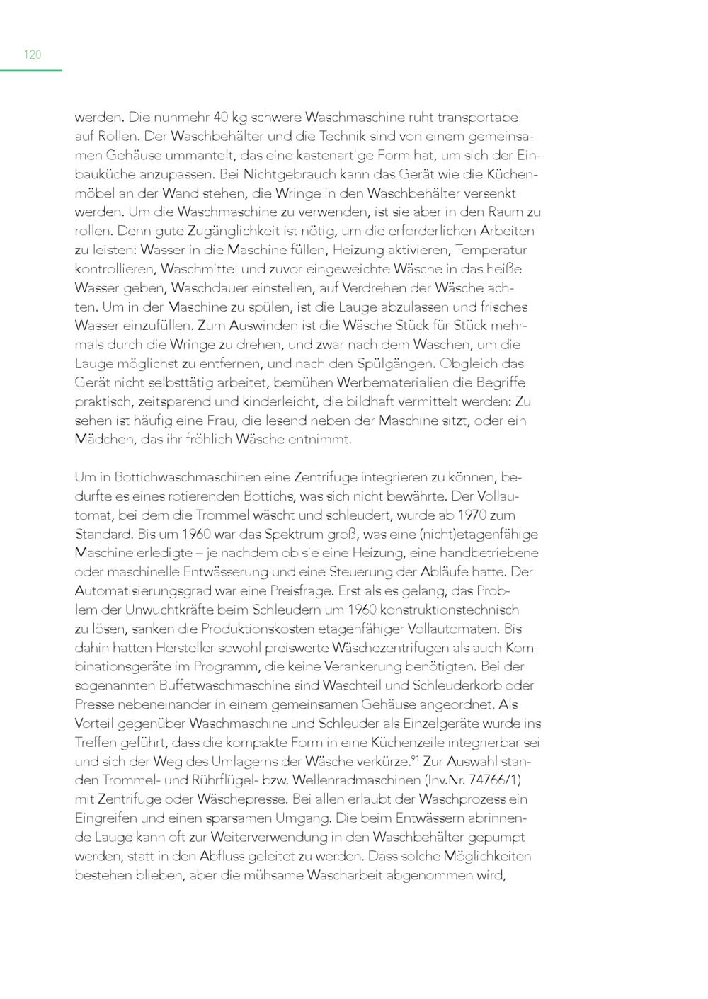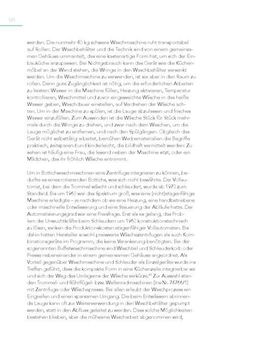 120 werden. Die nunmehr 40 kg schwere Waschmaschine ruht transportabel auf Rollen. Der Waschbehälter und die Technik sind von einem gemeinsamen Gehäuse ummantelt, das eine kastenartige Form hat, um sich der Einbauküche anzupassen. Bei Nichtgebrauch kann das Gerät wie die Küchenmöbel an der Wand stehen, die Wringe in den Waschbehälter versenkt werden. Um die Waschmaschine zu verwenden, ist sie aber in den Raum zu rollen. Denn gute Zugänglichkeit ist nötig, um die erforderlichen Arbeiten zu leisten: Wasser in die Maschine füllen, Heizung aktivieren, Temperatur kontrollieren, Waschmittel und zuvor eingeweichte Wäsche in das heiße Wasser geben, Waschdauer einstellen, auf Verdrehen der Wäsche achten. Um in der Maschine zu spülen, ist die Lauge abzulassen und frisches Wasser einzufüllen. Zum Auswinden ist die Wäsche Stück für Stück mehrmals durch die Wringe zu drehen, und zwar nach dem Waschen, um die Lauge möglichst zu entfernen, und nach den Spülgängen. Obgleich das Gerät nicht selbsttätig arbeitet, bemühen Werbematerialien die Begriffe praktisch, zeitsparend und kinderleicht, die bildhaft vermittelt werden: Zu sehen ist häufig eine Frau, die lesend neben der Maschine sitzt, oder ein Mädchen, das ihr fröhlich Wäsche entnimmt. Um in Bottichwaschmaschinen eine Zentrifuge integrieren zu können, bedurfte es eines rotierenden Bottichs, was sich nicht bewährte. Der Vollautomat, bei dem die Trommel wäscht und schleudert, wurde ab 1970 zum Standard. Bis um 1960 war das Spektrum groß, was eine(nicht)etagenfähige Maschine erledigte – je nachdem ob sie eine Heizung, eine handbetriebene oder maschinelle Entwässerung und eine Steuerung der Abläufe hatte. Der Automatisierungsgrad war eine Preisfrage. Erst als es gelang, das Problem der Unwuchtkräfte beim Schleudern um 1960 konstruktionstechnisch zu lösen, sanken die Produktionskosten etagenfähiger Vollautomaten. Bis dahin hatten Hersteller sowohl preiswerte Wäschezentrifugen als auch Kombinationsgeräte im Programm, die keine Verankerung benötigten. Bei der sogenannten Buffetwaschmaschine sind Waschteil und Schleuderkorb oder Presse nebeneinander in einem gemeinsamen Gehäuse angeordnet. Als Vorteil gegenüber Waschmaschine und Schleuder als Einzelgeräte wurde ins Treffen geführt, dass die kompakte Form in eine Küchenzeile integrierbar sei und sich der Weg des Umlagerns der Wäsche verkürze. 91 Zur Auswahl standen Trommel- und Rührflügel- bzw. Wellenradmaschinen(Inv.Nr. 74766/1) mit Zentrifuge oder Wäschepresse. Bei allen erlaubt der Waschprozess ein Eingreifen und einen sparsamen Umgang. Die beim Entwässern abrinnende Lauge kann oft zur Weiterverwendung in den Waschbehälter gepumpt werden, statt in den Abfluss geleitet zu werden. Dass solche Möglichkeiten bestehen blieben, aber die mühsame Wascharbeit abgenommen wird,