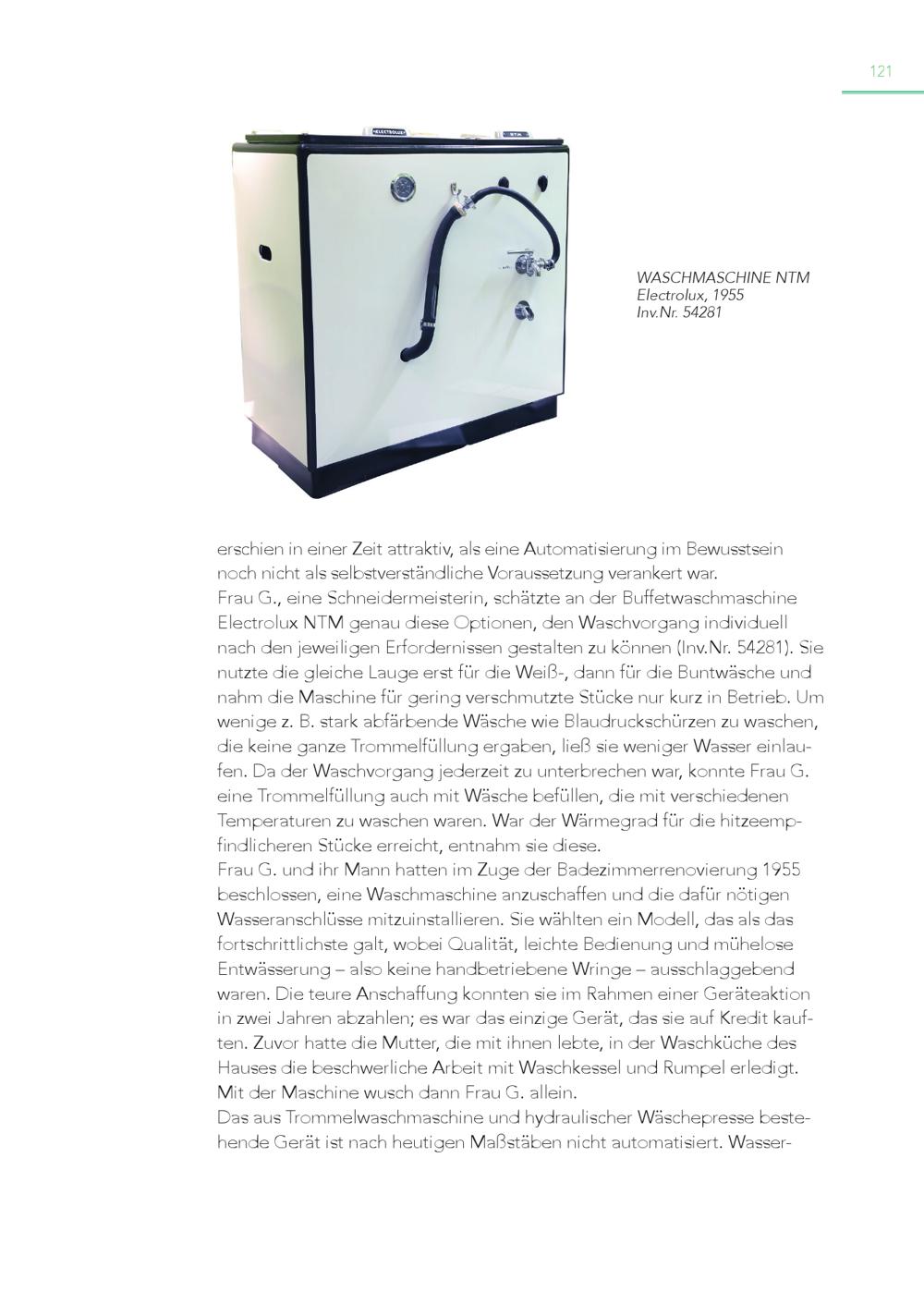 121 WASCHMASCHINE NTM Electrolux, 1955 Inv.Nr. 54281 erschien in einer Zeit attraktiv, als eine Automatisierung im Bewusstsein noch nicht als selbstverständliche Voraussetzung verankert war. Frau G., eine Schneidermeisterin, schätzte an der Buffetwaschmaschine Electrolux NTM genau diese Optionen, den Waschvorgang individuell nach den jeweiligen Erfordernissen gestalten zu können(Inv.Nr. 54281). Sie nutzte die gleiche Lauge erst für die Weiß-, dann für die Buntwäsche und nahm die Maschine für gering verschmutzte Stücke nur kurz in Betrieb. Um wenige z. B. stark abfärbende Wäsche wie Blaudruckschürzen zu waschen, die keine ganze Trommelfüllung ergaben, ließ sie weniger Wasser einlaufen. Da der Waschvorgang jederzeit zu unterbrechen war, konnte Frau G. eine Trommelfüllung auch mit Wäsche befüllen, die mit verschiedenen Temperaturen zu waschen waren. War der Wärmegrad für die hitzeempfindlicheren Stücke erreicht, entnahm sie diese. Frau G. und ihr Mann hatten im Zuge der Badezimmerrenovierung 1955 beschlossen, eine Waschmaschine anzuschaffen und die dafür nötigen Wasseranschlüsse mitzuinstallieren. Sie wählten ein Modell, das als das fortschrittlichste galt, wobei Qualität, leichte Bedienung und mühelose Entwässerung – also keine handbetriebene Wringe – ausschlaggebend waren. Die teure Anschaffung konnten sie im Rahmen einer Geräteaktion in zwei Jahren abzahlen; es war das einzige Gerät, das sie auf Kredit kauften. Zuvor hatte die Mutter, die mit ihnen lebte, in der Waschküche des Hauses die beschwerliche Arbeit mit Waschkessel und Rumpel erledigt. Mit der Maschine wusch dann Frau G. allein. Das aus Trommelwaschmaschine und hydraulischer Wäschepresse bestehende Gerät ist nach heutigen Maßstäben nicht automatisiert. Wasser-