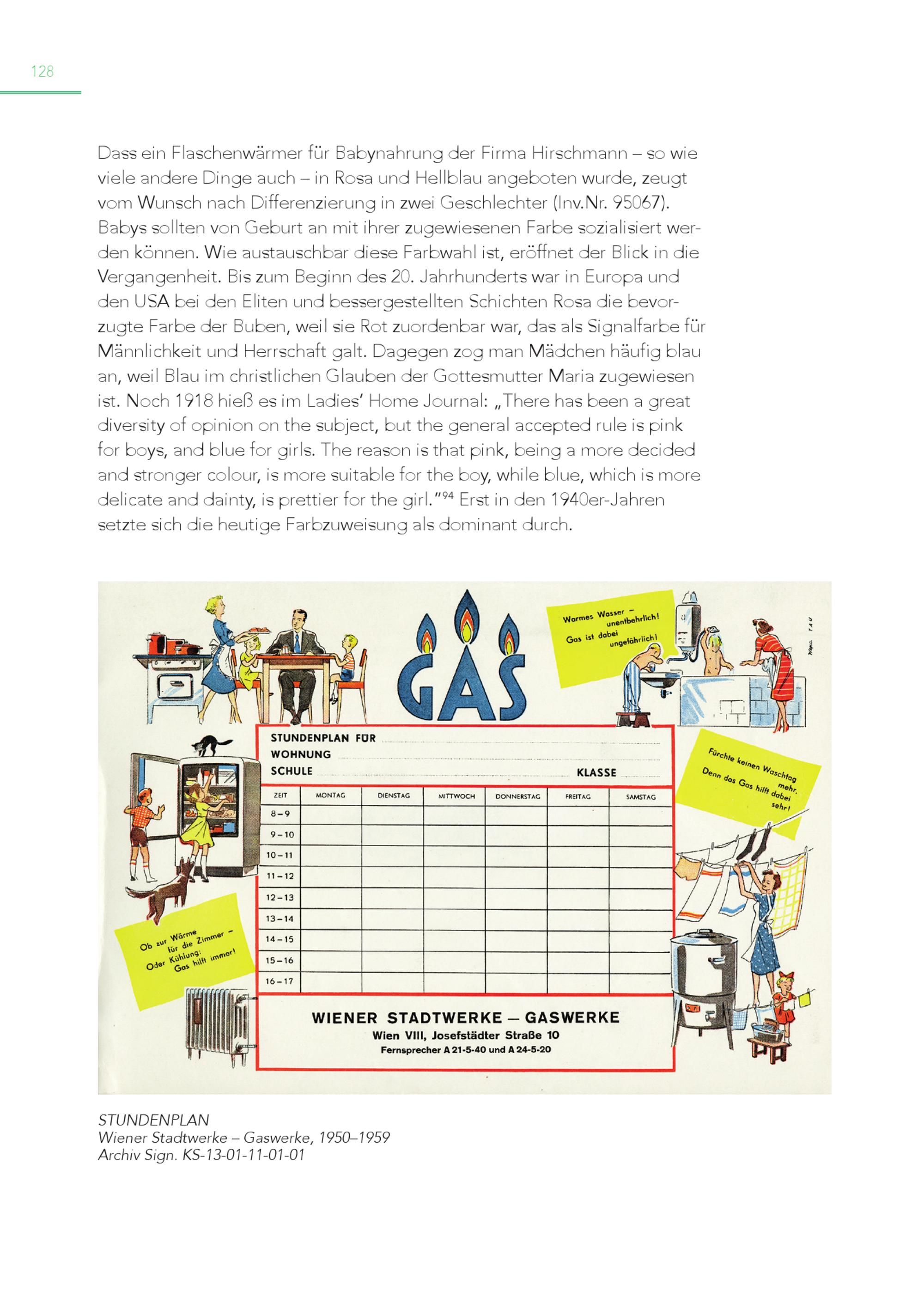 128 Dass ein Flaschenwärmer für Babynahrung der Firma Hirschmann – so wie viele andere Dinge auch – in Rosa und Hellblau angeboten wurde, zeugt vom Wunsch nach Differenzierung in zwei Geschlechter(Inv.Nr. 95067). Babys sollten von Geburt an mit ihrer zugewiesenen Farbe sozialisiert werden können. Wie austauschbar diese Farbwahl ist, eröffnet der Blick in die Vergangenheit. Bis zum Beginn des 20. Jahrhunderts war in Europa und den USA bei den Eliten und bessergestellten Schichten Rosa die bevorzugte Farbe der Buben, weil sie Rot zuordenbar war, das als Signalfarbe für Männlichkeit und Herrschaft galt. Dagegen zog man Mädchen häufig blau an, weil Blau im christlichen Glauben der Gottesmutter Maria zugewiesen ist. Noch 1918 hieß es im Ladies’ Home Journal:„There has been a great diversity of opinion on the subject, but the general accepted rule is pink for boys, and blue for girls. The reason is that pink, being a more decided and stronger colour, is more suitable for the boy, while blue, which is more delicate and dainty, is prettier for the girl.” 94 Erst in den 1940er-Jahren setzte sich die heutige Farbzuweisung als dominant durch. STUNDENPLAN Wiener Stadtwerke – Gaswerke, 1950–1959 Archiv Sign. KS-13-01-11-01-01
