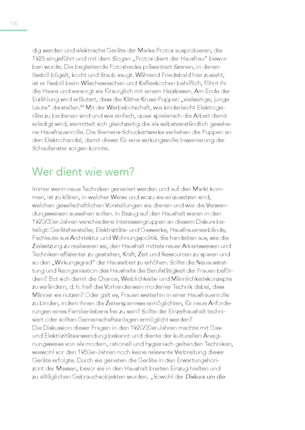 130 dig werden und elektrische Geräte der Marke Protos ausprobieren, die 1925 eingeführt und mit dem Slogan„Protos dient der Hausfrau“ beworben wurde. Die begleitende Fotostrecke präsentiert Szenen, in denen Ilsebill bügelt, kocht und Staub saugt. Während Friedebald hier zusieht, ist er Ilsebill beim Wäschewaschen und Kaffeekochen behilflich, föhnt ihr die Haare und versorgt sie fürsorglich mit einem Heizkissen. Am Ende der Erzählung wird erläutert, dass die Käthe-Kruse-Puppen„vielseitige, junge Leute“ darstellen. 95 Mit der Werbebotschaft, wie kinderleicht Elektrogeräte zu bedienen sind und wie einfach, quasi spielerisch die Arbeit damit erledigt wird, vermittelt sich gleichzeitig die als selbstverständlich gesehene Hausfrauenrolle. Die Siemens-Schuckertwerke verliehen die Puppen an den Elektrohandel, damit dieser für eine wirkungsvolle Inszenierung der Schaufenster sorgen konnte. Wer dient wie wem? Immer wenn neue Techniken generiert werden und auf den Markt kommen, ist zu klären, in welcher Weise und wozu sie einzusetzen sind, welchen gesellschaftlichen Vorstellungen sie dienen und wie die Verwendungsweisen aussehen sollen. In Bezug auf den Haushalt waren in den 1920/30er-Jahren verschiedene Interessengruppen an diesem Diskurs beteiligt: Gerätehersteller, Elektrizitäts- und Gaswerke, Hausfrauenverbände, Fachleute aus Architektur und Wohnungspolitik. Sie handelten aus, wie die Zielsetzung zu realisieren sei, den Haushalt mittels neuer Arbeitsweisen und Techniken effizienter zu gestalten, Kraft, Zeit und Ressourcen zu sparen und so den„Wirkungsgrad“ der Hausarbeit zu erhöhen. Sollte die Neuausstattung und Reorganisation des Haushalts die Berufstätigkeit der Frauen befördern? Bot sich damit die Chance, Weiblichkeits- und Männlichkeitskonzepte zu verändern, d. h. half das Vorhandensein moderner Technik dabei, dass Männer sie nutzen? Oder galt es, Frauen weiterhin in einer Hausfrauenrolle zu binden, indem ihnen die Zeitersparnisse ermöglichten, für neue Anforderungen eines Familienlebens frei zu sein? Sollte der Einzelhaushalt technisiert oder sollten Gemeinschaftsanlagen ermöglicht werden? Die Diskussion dieser Fragen in den 1920/30er-Jahren machte mit Gasund Elektrizitätsanwendung bekannt und diente der kulturellen Aneignungsweise von als modern, rationell und hygienisch geltenden Techniken, wiewohl vor den 1950er-Jahren noch keine relevante Verbreitung dieser Geräte erfolgte. Durch sie gerieten die Geräte in den Erwartungshorizont der Massen, bevor sie in den Haushalt breiten Einzug hielten und zu alltäglichen Gebrauchsobjekten wurden.„Sowohl der Diskurs um die