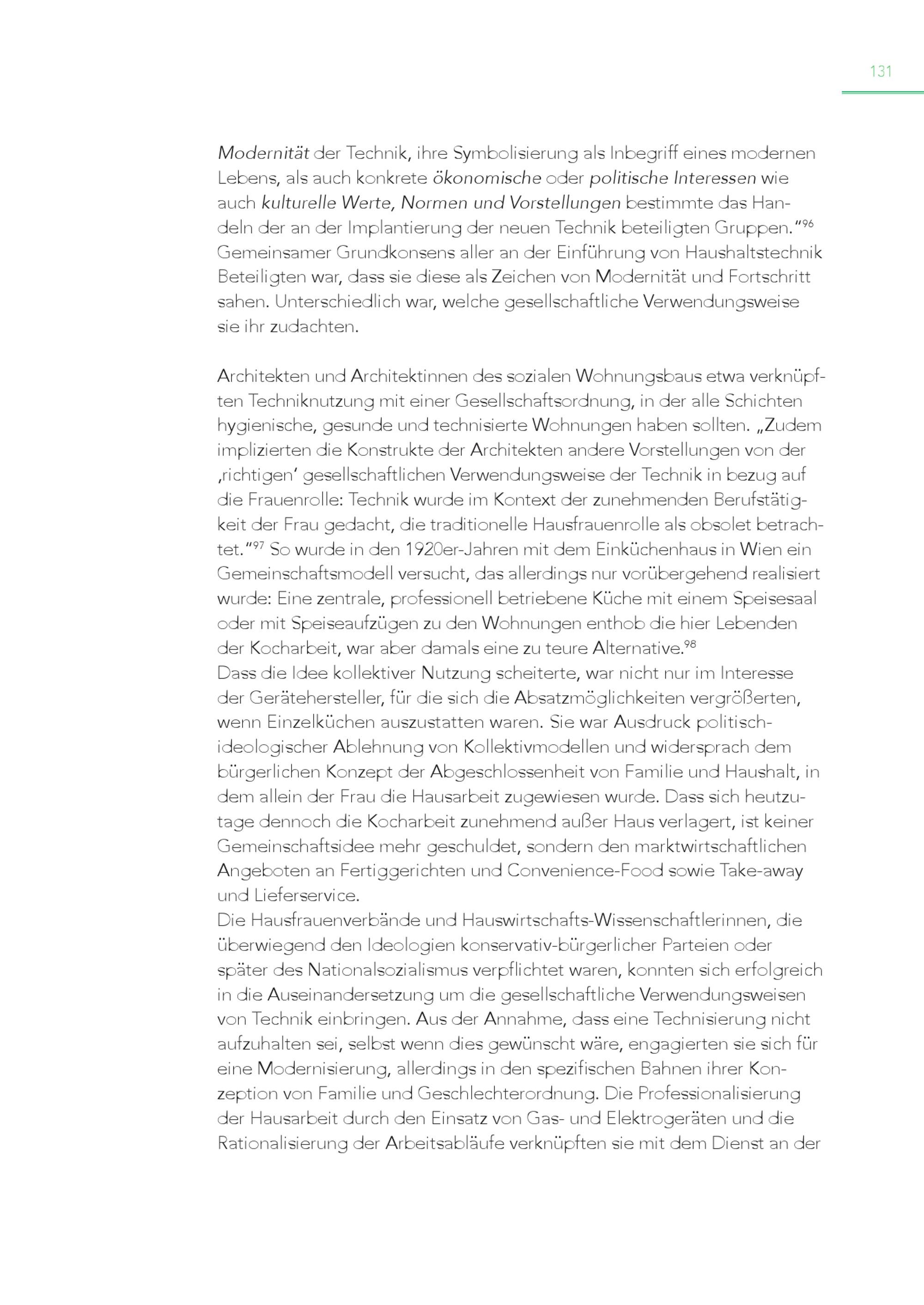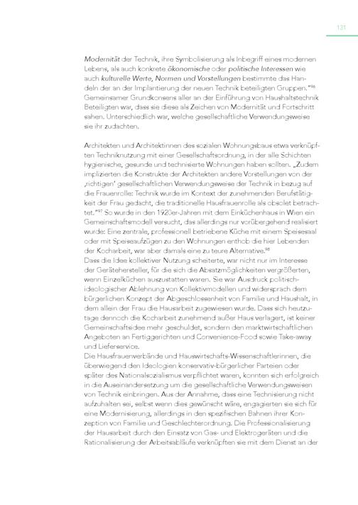 131 Modernität der Technik, ihre Symbolisierung als Inbegriff eines modernen Lebens, als auch konkrete ökonomische oder politische Interessen wie auch kulturelle Werte, Normen und Vorstellungen bestimmte das Handeln der an der Implantierung der neuen Technik beteiligten Gruppen.“ 96 Gemeinsamer Grundkonsens aller an der Einführung von Haushaltstechnik Beteiligten war, dass sie diese als Zeichen von Modernität und Fortschritt sahen. Unterschiedlich war, welche gesellschaftliche Verwendungsweise sie ihr zudachten. Architekten und Architektinnen des sozialen Wohnungsbaus etwa verknüpften Techniknutzung mit einer Gesellschaftsordnung, in der alle Schichten hygienische, gesunde und technisierte Wohnungen haben sollten.„Zudem implizierten die Konstrukte der Architekten andere Vorstellungen von der ‚richtigen‘ gesellschaftlichen Verwendungsweise der Technik in bezug auf die Frauenrolle: Technik wurde im Kontext der zunehmenden Berufstätigkeit der Frau gedacht, die traditionelle Hausfrauenrolle als obsolet betrachtet.“ 97 So wurde in den 1920er-Jahren mit dem Einküchenhaus in Wien ein Gemeinschaftsmodell versucht, das allerdings nur vorübergehend realisiert wurde: Eine zentrale, professionell betriebene Küche mit einem Speisesaal oder mit Speiseaufzügen zu den Wohnungen enthob die hier Lebenden der Kocharbeit, war aber damals eine zu teure Alternative. 98 Dass die Idee kollektiver Nutzung scheiterte, war nicht nur im Interesse der Gerätehersteller, für die sich die Absatzmöglichkeiten vergrößerten, wenn Einzelküchen auszustatten waren. Sie war Ausdruck politischideologischer Ablehnung von Kollektivmodellen und widersprach dem bürgerlichen Konzept der Abgeschlossenheit von Familie und Haushalt, in dem allein der Frau die Hausarbeit zugewiesen wurde. Dass sich heutzutage dennoch die Kocharbeit zunehmend außer Haus verlagert, ist keiner Gemeinschaftsidee mehr geschuldet, sondern den marktwirtschaftlichen Angeboten an Fertiggerichten und Convenience-Food sowie Take-away und Lieferservice. Die Hausfrauenverbände und Hauswirtschafts-Wissenschaftlerinnen, die überwiegend den Ideologien konservativ-bürgerlicher Parteien oder später des Nationalsozialismus verpflichtet waren, konnten sich erfolgreich in die Auseinandersetzung um die gesellschaftliche Verwendungsweisen von Technik einbringen. Aus der Annahme, dass eine Technisierung nicht aufzuhalten sei, selbst wenn dies gewünscht wäre, engagierten sie sich für eine Modernisierung, allerdings in den spezifischen Bahnen ihrer Kon zeption von Familie und Geschlechterordnung. Die Professionalisierung der Hausarbeit durch den Einsatz von Gas- und Elektrogeräten und die Rationalisierung der Arbeitsabläufe verknüpften sie mit dem Dienst an der