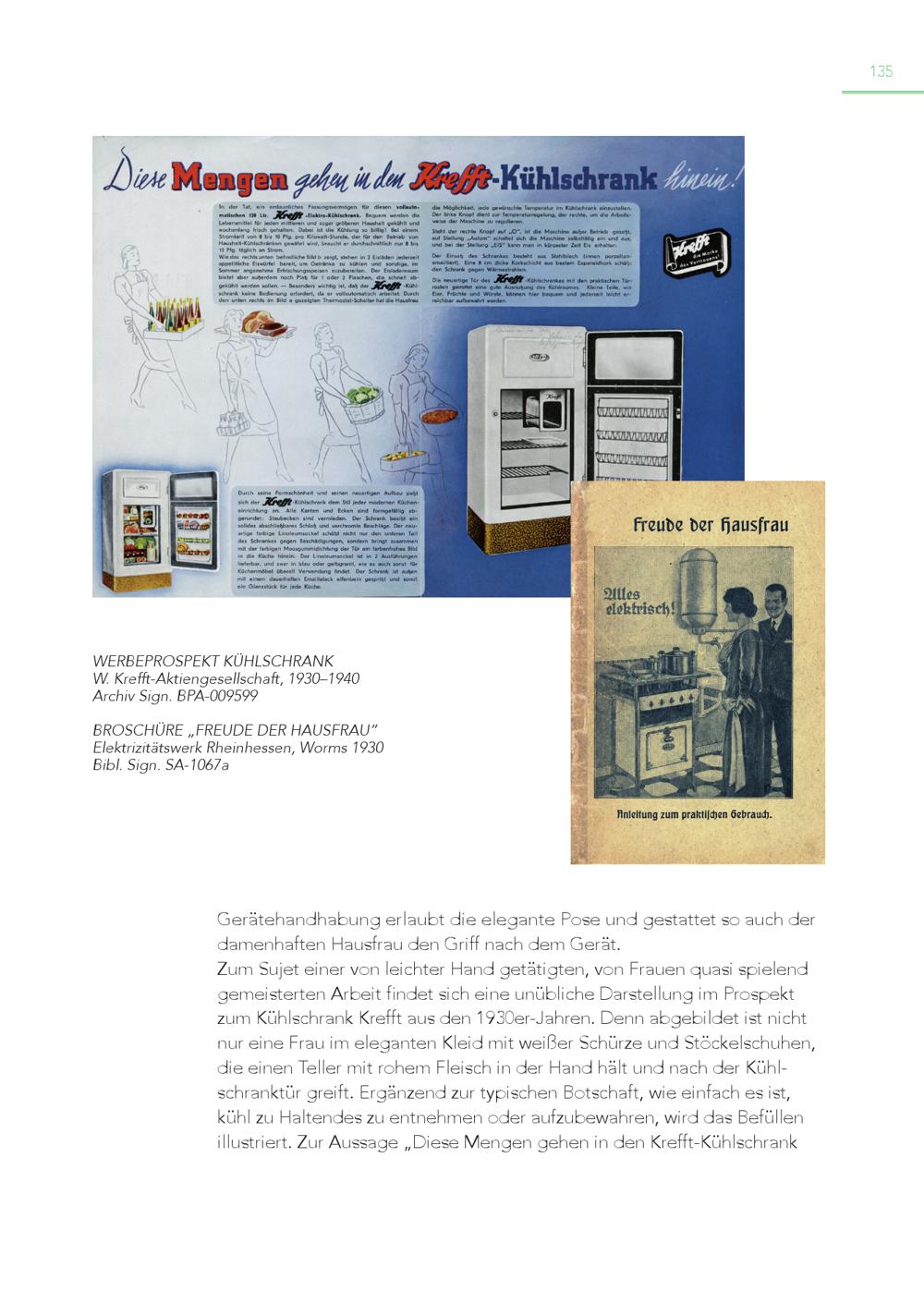 135 WERBEPROSPEKT KÜHLSCHRANK W. Krefft-Aktiengesellschaft, 1930–1940 Archiv Sign. BPA-009599 BROSCHÜRE„FREUDE DER HAUSFRAU“ Elektrizitätswerk Rheinhessen, Worms 1930 Bibl. Sign. SA-1067a Gerätehandhabung erlaubt die elegante Pose und gestattet so auch der damenhaften Hausfrau den Griff nach dem Gerät. Zum Sujet einer von leichter Hand getätigten, von Frauen quasi spielend gemeisterten Arbeit findet sich eine unübliche Darstellung im Prospekt zum Kühlschrank Krefft aus den 1930er-Jahren. Denn abgebildet ist nicht nur eine Frau im eleganten Kleid mit weißer Schürze und Stöckelschuhen, die einen Teller mit rohem Fleisch in der Hand hält und nach der Kühlschranktür greift. Ergänzend zur typischen Botschaft, wie einfach es ist, kühl zu Haltendes zu entnehmen oder aufzubewahren, wird das Befüllen illustriert. Zur Aussage„Diese Mengen gehen in den Krefft-Kühlschrank