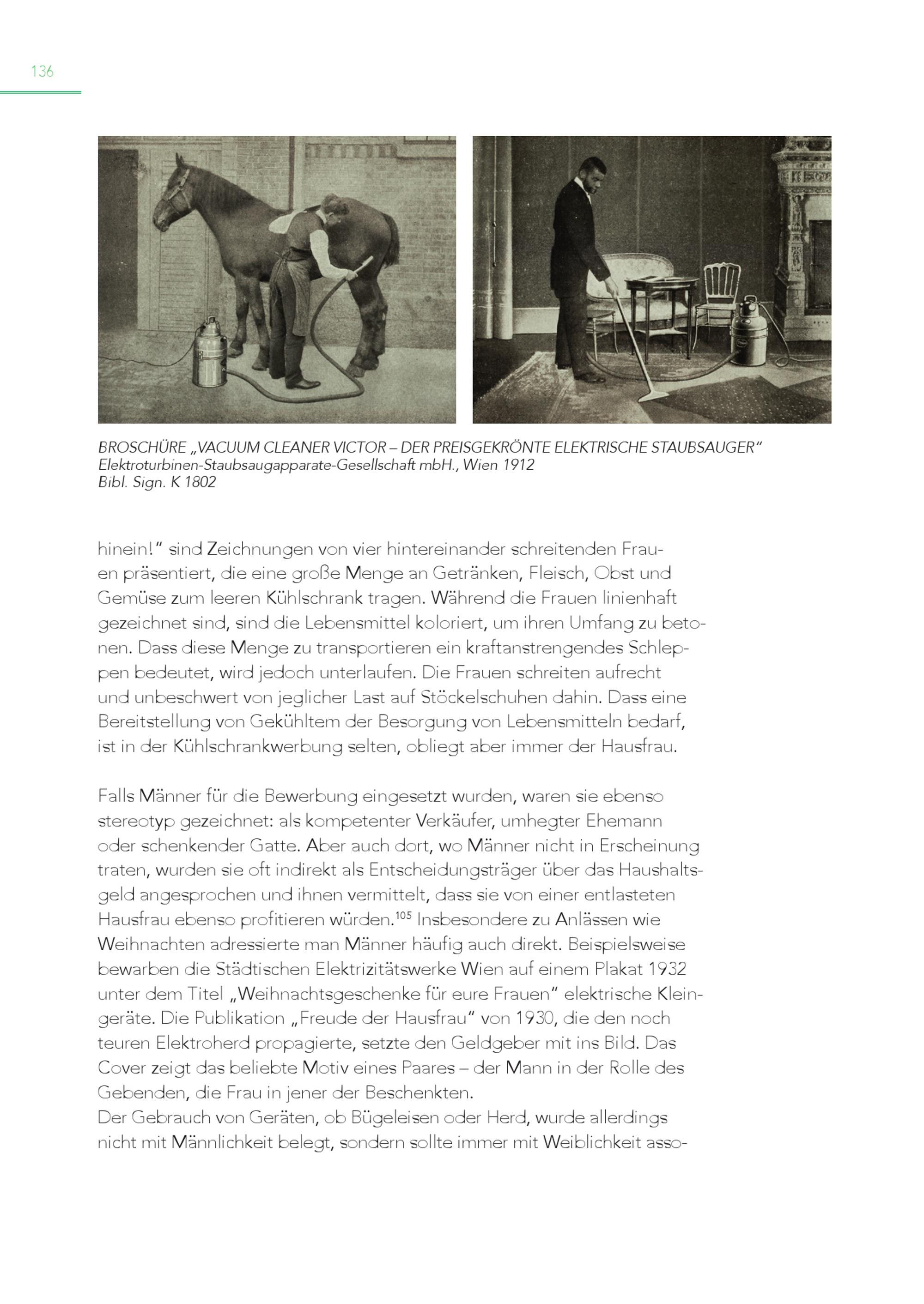 136 BROSCHÜRE„VACUUM CLEANER VICTOR – DER PREISGEKRÖNTE ELEKTRISCHE STAUBSAUGER“ Elektroturbinen-Staubsaugapparate-Gesellschaft mbH., Wien 1912 Bibl. Sign. K 1802 hinein!“ sind Zeichnungen von vier hintereinander schreitenden Frauen präsentiert, die eine große Menge an Getränken, Fleisch, Obst und Gemüse zum leeren Kühlschrank tragen. Während die Frauen linienhaft gezeichnet sind, sind die Lebensmittel koloriert, um ihren Umfang zu betonen. Dass diese Menge zu transportieren ein kraftanstrengendes Schleppen bedeutet, wird jedoch unterlaufen. Die Frauen schreiten aufrecht und unbeschwert von jeglicher Last auf Stöckelschuhen dahin. Dass eine Bereitstellung von Gekühltem der Besorgung von Lebensmitteln bedarf, ist in der Kühlschrankwerbung selten, obliegt aber immer der Hausfrau. Falls Männer für die Bewerbung eingesetzt wurden, waren sie ebenso stereotyp gezeichnet: als kompetenter Verkäufer, umhegter Ehemann oder schenkender Gatte. Aber auch dort, wo Männer nicht in Erscheinung traten, wurden sie oft indirekt als Entscheidungsträger über das Haushaltsgeld angesprochen und ihnen vermittelt, dass sie von einer entlasteten Hausfrau ebenso profitieren würden. 105 Insbesondere zu Anlässen wie Weihnachten adressierte man Männer häufig auch direkt. Beispielsweise bewarben die Städtischen Elektrizitätswerke Wien auf einem Plakat 1932 unter dem Titel„Weihnachtsgeschenke für eure Frauen“ elektrische Kleingeräte. Die Publikation„Freude der Hausfrau“ von 1930, die den noch teuren Elektroherd propagierte, setzte den Geldgeber mit ins Bild. Das Cover zeigt das beliebte Motiv eines Paares – der Mann in der Rolle des Gebenden, die Frau in jener der Beschenkten. Der Gebrauch von Geräten, ob Bügeleisen oder Herd, wurde allerdings nicht mit Männlichkeit belegt, sondern sollte immer mit Weiblichkeit asso-