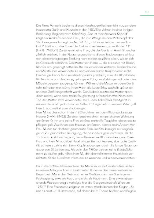 141 Die Firma Vorwerk bediente dieses Hausfrauenklischee nicht nur, sondern inszenierte Gerät und Nutzerin in den 1950/60er-Jahren in einer innigen Beziehung. Begleitet vom Schriftzug„Das ist mein Vorwerk Kobold“ zeigt ein Werbefolder eine Frau, die ihre Wange an den Motorkopf des Staubsaugers schmiegt(Inv.Nr. 56151).„Ich bin verliebt in meinen Kobold“ titelt auch das Cover der Gebrauchsanweisung zum Modell 111 (Inv.Nr. 74685/1). Zu sehen ist eine Frau, die das Gerät im Arm hält und es zärtlich anblickt. In der Nutzungsgeschichte dieses Staubsaugers schlug sich diese nahegelegte Bindung nicht nieder, es zählte allein, wie er sich im Gebrauch bewährte. Die Mutter von Herrn L., die bis dahin mit Besen, Klopfer etc. gereinigt hatte, kaufte ihn von einem Vertreter. Trockenhaube und Zerstäuber verwendete sie nach einem ersten Ausprobieren nicht. Das Saugzubehör fand sie allerdings sehr praktisch, etwa die Klopfbürste für Teppiche und das lange, gebogene Rohr, um Vorhänge und unter den Möbeln bequem saugen zu können. Während die Mutter mit dem Gerät sehr zufrieden war, störte ihren Mann die Lautstärke, weshalb später ein anderes Gerät angeschafft wurde. Den Kobold nutzte die Mutter sporadisch weiter, wenn eine starke Saugleistung erforderlich war. Nach dem Tod der Mutter 1985 verwendete Herr L. den Kobold als Zweitgerät in seinem Haushalt, jedoch nur im Keller. Im Gegensatz zu seinem Vater griff Herr L. auch selbst zum Staubsauger. Herr M. tat dies schon in den 1950er-Jahren mit dem Klopfstaubsauger Hoover(Inv.Nr. 81422). Zu einer geschmackvoll eingerichteten Wohnung gehörten für ihn und seine Frau schöne, wertvolle Teppiche, die es gut zu pflegen galt. Aus ihnen den Staub zu entfernen, konnte nach Ansicht von Frau M. der zur Hochzeit geschenkte Famulus-Staubsauger nur ungenügend. Zur gründlichen Reinigung, die besonders gewünscht war, als die Tochter zu krabbeln begann, bedurfte es eines Klopfstaubsaugers. Dass Frau und Herr M. auch bei Haushaltsgeräten auf teurere, aber gute Qualität achteten, zahlte sich beim Klopfstaubsauger durch die lange Nutzungsdauer von 50 Jahren aus. Als es in den 1980er-Jahren keine Staubsäcke mehr zu kaufen gab, nähte Herr M., der ebenfalls immer Hausarbeit verrichtete, Säcke aus altem Inlett, die sie wuschen und wiederverwendeten. Bis in die 1970er-Jahre erschien der Mann kaum als Gerätenutzer, selten im realen Alltag und nur in bestimmten Rollen in den Firmenmaterialien. Bewarb ein Mann den Gebrauch eines Gerätes, dann als überlegener Fachexperte, etwa als Koch, und nicht als Hausmann. Eine etwas abweichende Werbestrategie verfolgte hier die Gasgemeinschaft Wien um 1950. 111 Eine Plakatserie zeigte zum immer wiederkehrenden Slogan„So war es einst…“ Illustrationen, auf denen beim Thema Kochen und Bügeln