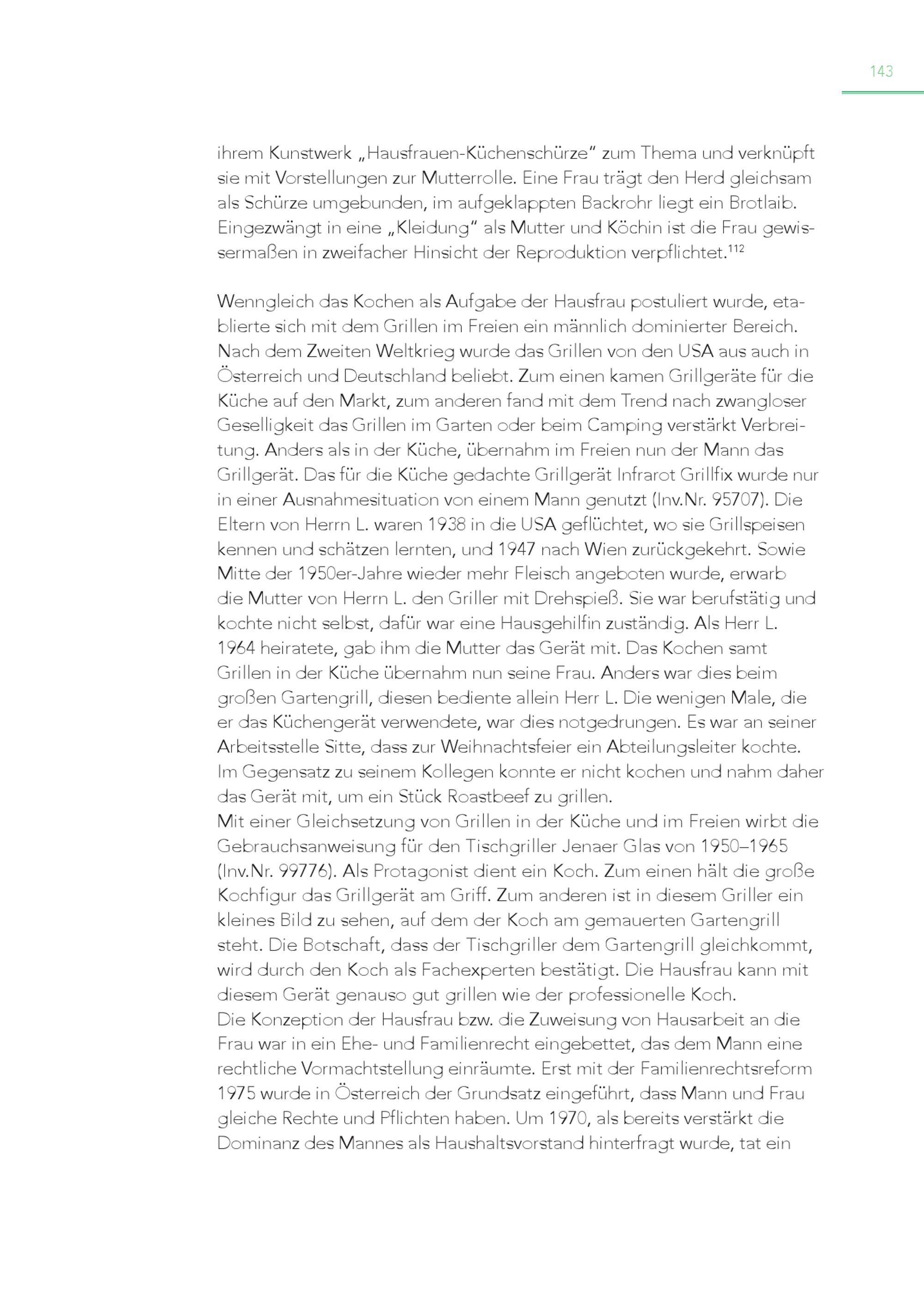 143 ihrem Kunstwerk„Hausfrauen-Küchenschürze“ zum Thema und verknüpft sie mit Vorstellungen zur Mutterrolle. Eine Frau trägt den Herd gleichsam als Schürze umgebunden, im aufgeklappten Backrohr liegt ein Brotlaib. Eingezwängt in eine„Kleidung“ als Mutter und Köchin ist die Frau gewissermaßen in zweifacher Hinsicht der Reproduktion verpflichtet. 112 Wenngleich das Kochen als Aufgabe der Hausfrau postuliert wurde, etablierte sich mit dem Grillen im Freien ein männlich dominierter Bereich. Nach dem Zweiten Weltkrieg wurde das Grillen von den USA aus auch in Österreich und Deutschland beliebt. Zum einen kamen Grillgeräte für die Küche auf den Markt, zum anderen fand mit dem Trend nach zwangloser Geselligkeit das Grillen im Garten oder beim Camping verstärkt Verbreitung. Anders als in der Küche, übernahm im Freien nun der Mann das Grillgerät. Das für die Küche gedachte Grillgerät Infrarot Grillfix wurde nur in einer Ausnahmesituation von einem Mann genutzt(Inv.Nr. 95707). Die Eltern von Herrn L. waren 1938 in die USA geflüchtet, wo sie Grillspeisen kennen und schätzen lernten, und 1947 nach Wien zurückgekehrt. Sowie Mitte der 1950er-Jahre wieder mehr Fleisch angeboten wurde, erwarb die Mutter von Herrn L. den Griller mit Drehspieß. Sie war berufstätig und kochte nicht selbst, dafür war eine Hausgehilfin zuständig. Als Herr L. 1964 heiratete, gab ihm die Mutter das Gerät mit. Das Kochen samt Grillen in der Küche übernahm nun seine Frau. Anders war dies beim großen Gartengrill, diesen bediente allein Herr L. Die wenigen Male, die er das Küchengerät verwendete, war dies notgedrungen. Es war an seiner Arbeitsstelle Sitte, dass zur Weihnachtsfeier ein Abteilungsleiter kochte. Im Gegensatz zu seinem Kollegen konnte er nicht kochen und nahm daher das Gerät mit, um ein Stück Roastbeef zu grillen. Mit einer Gleichsetzung von Grillen in der Küche und im Freien wirbt die Gebrauchsanweisung für den Tischgriller Jenaer Glas von 1950–1965 (Inv.Nr. 99776). Als Protagonist dient ein Koch. Zum einen hält die große Kochfigur das Grillgerät am Griff. Zum anderen ist in diesem Griller ein kleines Bild zu sehen, auf dem der Koch am gemauerten Gartengrill steht. Die Botschaft, dass der Tischgriller dem Gartengrill gleichkommt, wird durch den Koch als Fachexperten bestätigt. Die Hausfrau kann mit diesem Gerät genauso gut grillen wie der professionelle Koch. Die Konzeption der Hausfrau bzw. die Zuweisung von Hausarbeit an die Frau war in ein Ehe- und Familienrecht eingebettet, das dem Mann eine rechtliche Vormachtstellung einräumte. Erst mit der Familienrechtsreform 1975 wurde in Österreich der Grundsatz eingeführt, dass Mann und Frau gleiche Rechte und Pflichten haben. Um 1970, als bereits verstärkt die Dominanz des Mannes als Haushaltsvorstand hinterfragt wurde, tat ein