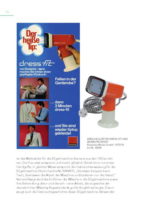 146 WÄSCHEGLÄTTER DRESS FIT UND WERBEPROSPEKT Rowenta-Werke GmbH, 1975/76 Inv.Nr. 38584 ist das Werbeblatt für die Bügelmaschine Siemens aus den 1950er-Jahren. Die Frau sitzt entspannt und macht glücklich lächelnd nur minimale Handgriffe. In gleicher Weise verspricht die Gebrauchsanweisung für die Bügelmaschine Electrolux(Inv.Nr. 68494/1):„Sie sitzen bequem beim Tisch, überlassen die Arbeit der Maschine und bedienen nur die Hebel.“ Vernachlässigt wird das Einführen der Wäsche in die Bügelmaschine sowie ihre Behandlung davor und danach – eine Arbeit, die angesichts der damals hohen Wäschepflegestandards große Sorgfalt verlangte. Davon zeugt auch die Gebrauchsgeschichte dieser Bügelmaschine. Verwendet