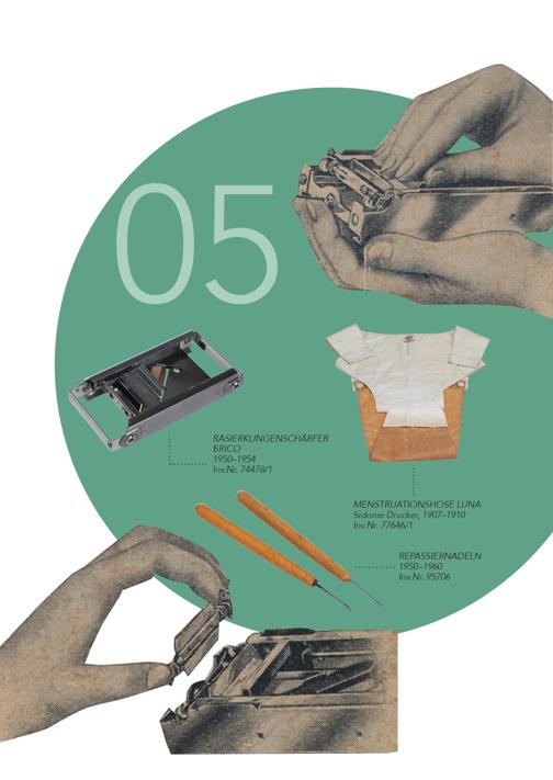 05 RASIERKLINGENSCHÄRFER BRICO 1950–1954 Inv.Nr. 74478/1 MENSTRUATIONSHOSE LUNA Sidonie Drucker, 1907–1910 Inv.Nr. 77646/1 REPASSIERNADELN 1950 –1960 Inv.Nr. 95706