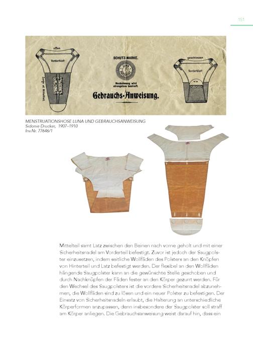 151 MENSTRUATIONSHOSE LUNA UND GEBRAUCHSANWEISUNG Sidonie Drucker, 1907–1910 Inv.Nr. 77646/1 Mittelteil samt Latz zwischen den Beinen nach vorne geholt und mit einer Sicherheitsnadel am Vorderteil befestigt. Zuvor ist jedoch der Saugpolster einzusetzen, indem seitliche Wollfäden des Polsters an den Knöpfen von Hinterteil und Latz befestigt werden. Der flexibel an den Wollfäden hängende Saugpolster kann an die gewünschte Stelle geschoben und durch Nachknüpfen der Fäden fester an den Körper gezurrt werden. Für den Wechsel des Saugpolsters ist die vordere Sicherheitsnadel abzunehmen, die Wollfäden sind zu lösen und ein neuer Polster zu befestigen. Der Einsatz von Sicherheitsnadeln erlaubt, die Halterung an unterschiedliche Körperformen anzupassen, denn insbesondere der Saugpolster soll straff am Körper anliegen. Die Gebrauchsanweisung weist darauf hin, dass ein