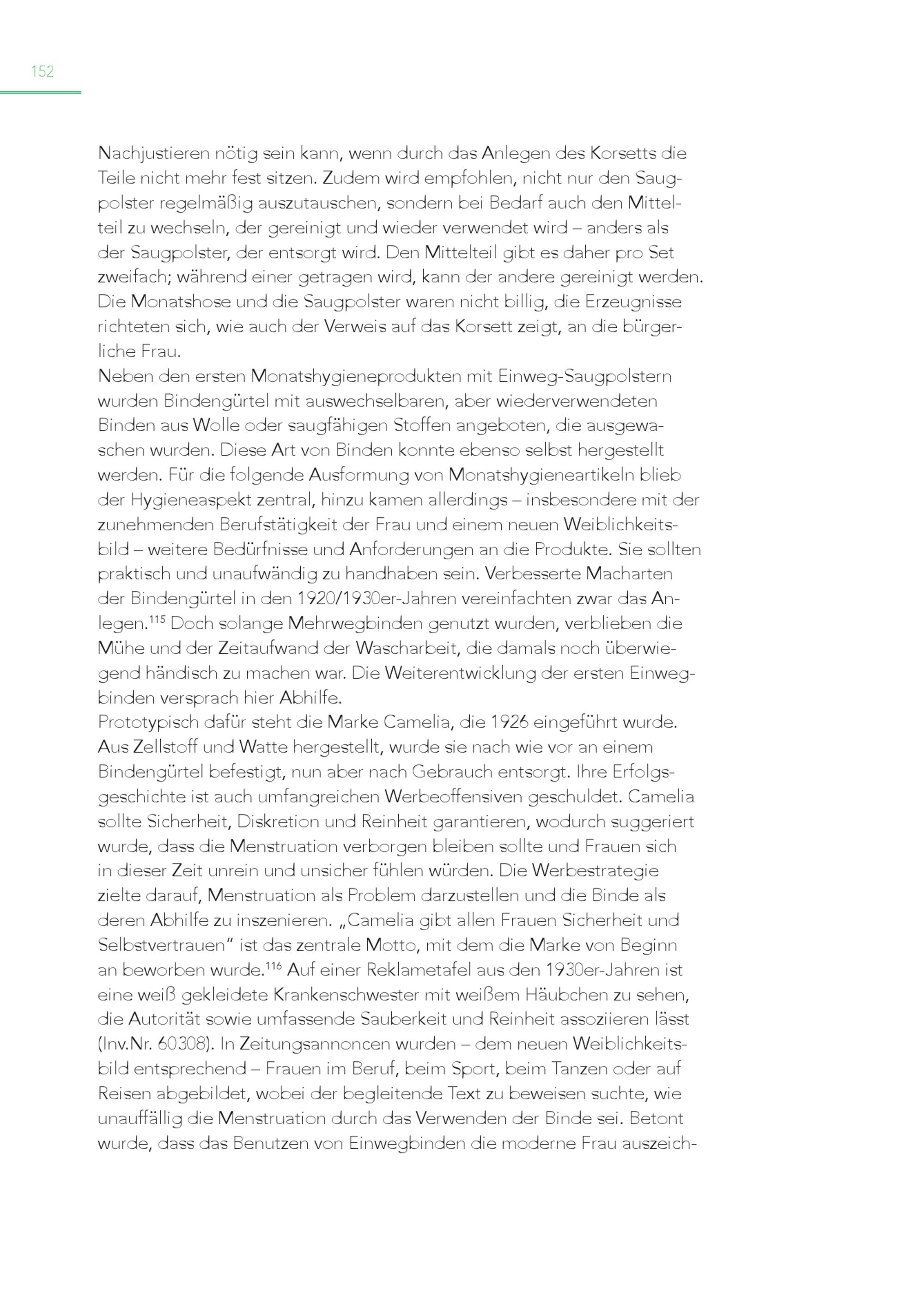 152 Nachjustieren nötig sein kann, wenn durch das Anlegen des Korsetts die Teile nicht mehr fest sitzen. Zudem wird empfohlen, nicht nur den Saugpolster regelmäßig auszutauschen, sondern bei Bedarf auch den Mittelteil zu wechseln, der gereinigt und wieder verwendet wird – anders als der Saugpolster, der entsorgt wird. Den Mittelteil gibt es daher pro Set zweifach; während einer getragen wird, kann der andere gereinigt werden. Die Monatshose und die Saugpolster waren nicht billig, die Erzeugnisse richteten sich, wie auch der Verweis auf das Korsett zeigt, an die bürgerliche Frau. Neben den ersten Monatshygieneprodukten mit Einweg-Saugpolstern wurden Bindengürtel mit auswechselbaren, aber wiederverwendeten Binden aus Wolle oder saugfähigen Stoffen angeboten, die ausgewaschen wurden. Diese Art von Binden konnte ebenso selbst hergestellt werden. Für die folgende Ausformung von Monatshygieneartikeln blieb der Hygieneaspekt zentral, hinzu kamen allerdings – insbesondere mit der zunehmenden Berufstätigkeit der Frau und einem neuen Weiblichkeitsbild – weitere Bedürfnisse und Anforderungen an die Produkte. Sie sollten praktisch und unaufwändig zu handhaben sein. Verbesserte Macharten der Bindengürtel in den 1920/1930er-Jahren vereinfachten zwar das Anlegen. 115 Doch solange Mehrwegbinden genutzt wurden, verblieben die Mühe und der Zeitaufwand der Wascharbeit, die damals noch überwiegend händisch zu machen war. Die Weiterentwicklung der ersten Einwegbinden versprach hier Abhilfe. Prototypisch dafür steht die Marke Camelia, die 1926 eingeführt wurde. Aus Zellstoff und Watte hergestellt, wurde sie nach wie vor an einem Bindengürtel befestigt, nun aber nach Gebrauch entsorgt. Ihre Erfolgsgeschichte ist auch umfangreichen Werbeoffensiven geschuldet. Camelia sollte Sicherheit, Diskretion und Reinheit garantieren, wodurch suggeriert wurde, dass die Menstruation verborgen bleiben sollte und Frauen sich in dieser Zeit unrein und unsicher fühlen würden. Die Werbestrategie zielte darauf, Menstruation als Problem darzustellen und die Binde als deren Abhilfe zu inszenieren.„Camelia gibt allen Frauen Sicherheit und Selbstvertrauen“ ist das zentrale Motto, mit dem die Marke von Beginn an beworben wurde. 116 Auf einer Reklametafel aus den 1930er-Jahren ist eine weiß gekleidete Krankenschwester mit weißem Häubchen zu sehen, die Autorität sowie umfassende Sauberkeit und Reinheit assoziieren lässt (Inv.Nr. 60308). In Zeitungsannoncen wurden – dem neuen Weiblichkeitsbild entsprechend – Frauen im Beruf, beim Sport, beim Tanzen oder auf Reisen abgebildet, wobei der begleitende Text zu beweisen suchte, wie unauffällig die Menstruation durch das Verwenden der Binde sei. Betont wurde, dass das Benutzen von Einwegbinden die moderne Frau auszeich-