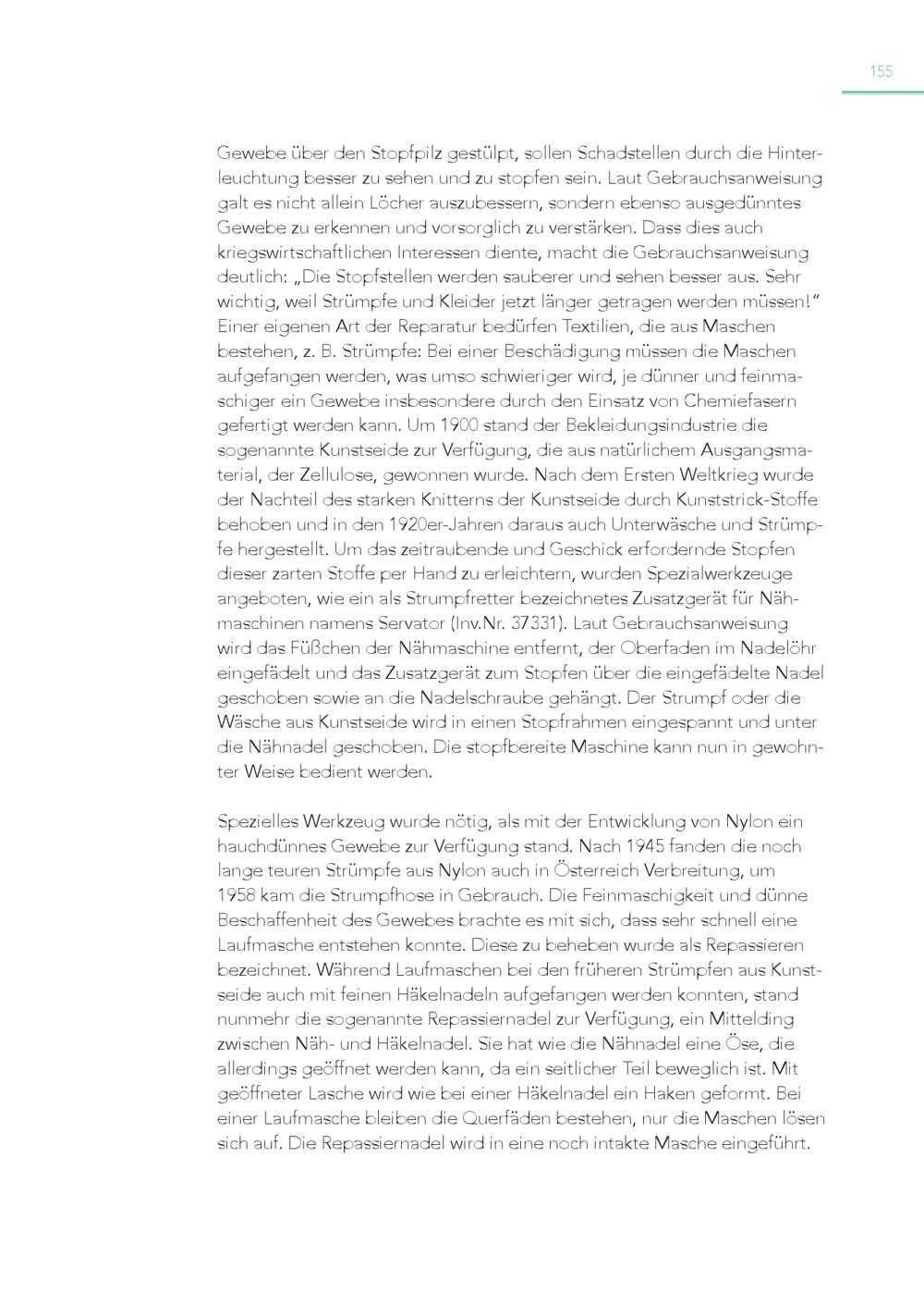 155 Gewebe über den Stopfpilz gestülpt, sollen Schadstellen durch die Hinterleuchtung besser zu sehen und zu stopfen sein. Laut Gebrauchsanweisung galt es nicht allein Löcher auszubessern, sondern ebenso ausgedünntes Gewebe zu erkennen und vorsorglich zu verstärken. Dass dies auch kriegswirtschaftlichen Interessen diente, macht die Gebrauchsanweisung deutlich:„Die Stopfstellen werden sauberer und sehen besser aus. Sehr wichtig, weil Strümpfe und Kleider jetzt länger getragen werden müssen!“ Einer eigenen Art der Reparatur bedürfen Textilien, die aus Maschen bestehen, z. B. Strümpfe: Bei einer Beschädigung müssen die Maschen aufgefangen werden, was umso schwieriger wird, je dünner und feinmaschiger ein Gewebe insbesondere durch den Einsatz von Chemiefasern gefertigt werden kann. Um 1900 stand der Bekleidungsindustrie die sogenannte Kunstseide zur Verfügung, die aus natürlichem Ausgangsmaterial, der Zellulose, gewonnen wurde. Nach dem Ersten Weltkrieg wurde der Nachteil des starken Knitterns der Kunstseide durch Kunststrick-Stoffe behoben und in den 1920er-Jahren daraus auch Unterwäsche und Strümpfe hergestellt. Um das zeitraubende und Geschick erfordernde Stopfen dieser zarten Stoffe per Hand zu erleichtern, wurden Spezialwerkzeuge angeboten, wie ein als Strumpfretter bezeichnetes Zusatzgerät für Nähmaschinen namens Servator(Inv.Nr. 37331). Laut Gebrauchsanweisung wird das Füßchen der Nähmaschine entfernt, der Oberfaden im Nadelöhr eingefädelt und das Zusatzgerät zum Stopfen über die eingefädelte Nadel geschoben sowie an die Nadelschraube gehängt. Der Strumpf oder die Wäsche aus Kunstseide wird in einen Stopfrahmen eingespannt und unter die Nähnadel geschoben. Die stopfbereite Maschine kann nun in gewohnter Weise bedient werden. Spezielles Werkzeug wurde nötig, als mit der Entwicklung von Nylon ein hauchdünnes Gewebe zur Verfügung stand. Nach 1945 fanden die noch lange teuren Strümpfe aus Nylon auch in Österreich Verbreitung, um 1958 kam die Strumpfhose in Gebrauch. Die Feinmaschigkeit und dünne Beschaffenheit des Gewebes brachte es mit sich, dass sehr schnell eine Laufmasche entstehen konnte. Diese zu beheben wurde als Repassieren bezeichnet. Während Laufmaschen bei den früheren Strümpfen aus Kunstseide auch mit feinen Häkelnadeln aufgefangen werden konnten, stand nunmehr die sogenannte Repassiernadel zur Verfügung, ein Mittelding zwischen Näh- und Häkelnadel. Sie hat wie die Nähnadel eine Öse, die allerdings geöffnet werden kann, da ein seitlicher Teil beweglich ist. Mit geöffneter Lasche wird wie bei einer Häkelnadel ein Haken geformt. Bei einer Laufmasche bleiben die Querfäden bestehen, nur die Maschen lösen sich auf. Die Repassiernadel wird in eine noch intakte Masche eingeführt.