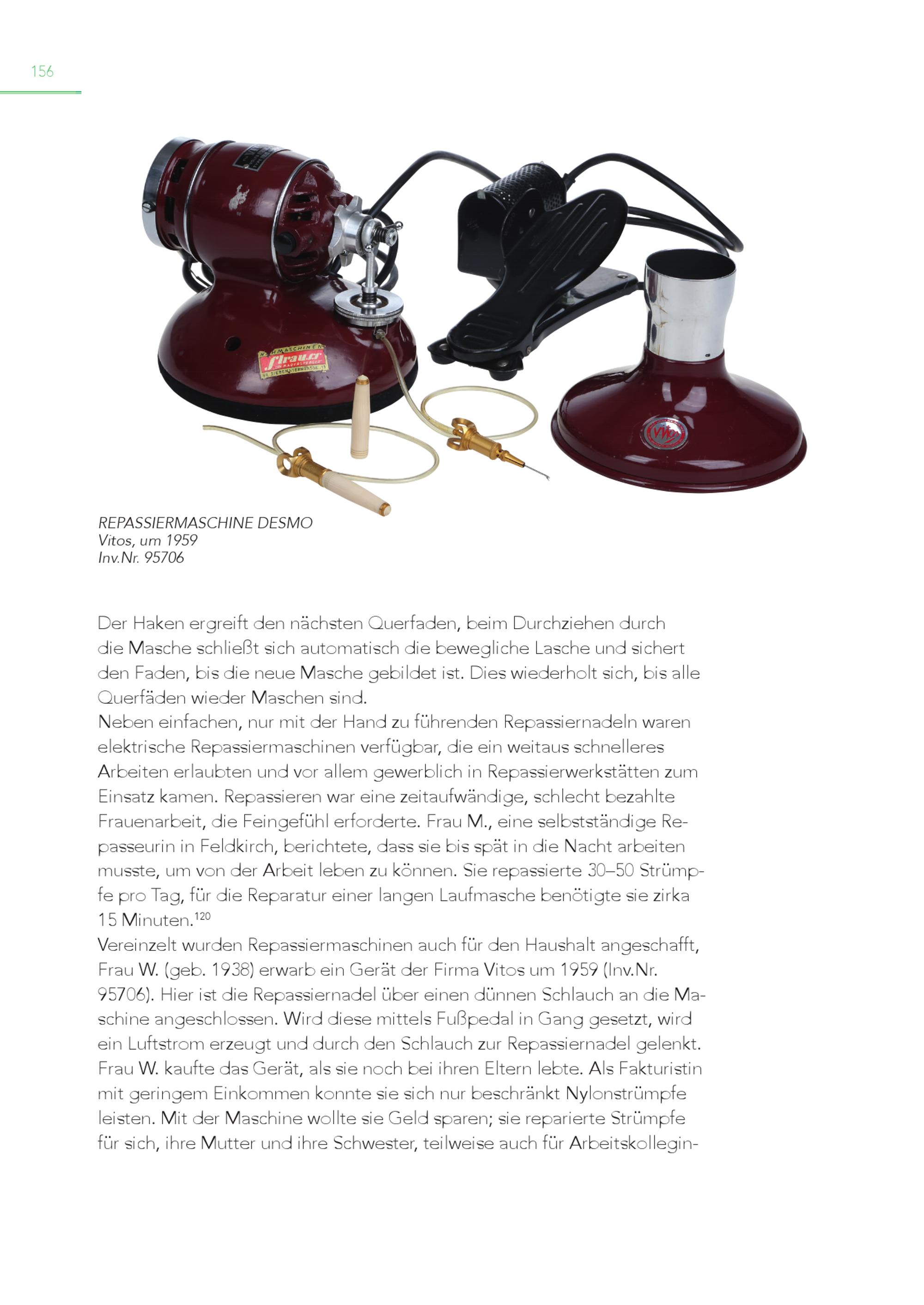 156 REPASSIERMASCHINE DESMO Vitos, um 1959 Inv.Nr. 95706 Der Haken ergreift den nächsten Querfaden, beim Durchziehen durch die Masche schließt sich automatisch die bewegliche Lasche und sichert den Faden, bis die neue Masche gebildet ist. Dies wiederholt sich, bis alle Querfäden wieder Maschen sind. Neben einfachen, nur mit der Hand zu führenden Repassiernadeln waren elektrische Repassiermaschinen verfügbar, die ein weitaus schnelleres Arbeiten erlaubten und vor allem gewerblich in Repassierwerkstätten zum Einsatz kamen. Repassieren war eine zeitaufwändige, schlecht bezahlte Frauenarbeit, die Feingefühl erforderte. Frau M., eine selbstständige Repasseurin in Feldkirch, berichtete, dass sie bis spät in die Nacht arbeiten musste, um von der Arbeit leben zu können. Sie repassierte 30–50 Strümpfe pro Tag, für die Reparatur einer langen Laufmasche benötigte sie zirka 15 Minuten. 120 Vereinzelt wurden Repassiermaschinen auch für den Haushalt angeschafft, Frau W.(geb. 1938) erwarb ein Gerät der Firma Vitos um 1959(Inv.Nr. 95706). Hier ist die Repassiernadel über einen dünnen Schlauch an die Maschine angeschlossen. Wird diese mittels Fußpedal in Gang gesetzt, wird ein Luftstrom erzeugt und durch den Schlauch zur Repassiernadel gelenkt. Frau W. kaufte das Gerät, als sie noch bei ihren Eltern lebte. Als Fakturistin mit geringem Einkommen konnte sie sich nur beschränkt Nylonstrümpfe leisten. Mit der Maschine wollte sie Geld sparen; sie reparierte Strümpfe für sich, ihre Mutter und ihre Schwester, teilweise auch für Arbeitskollegin-