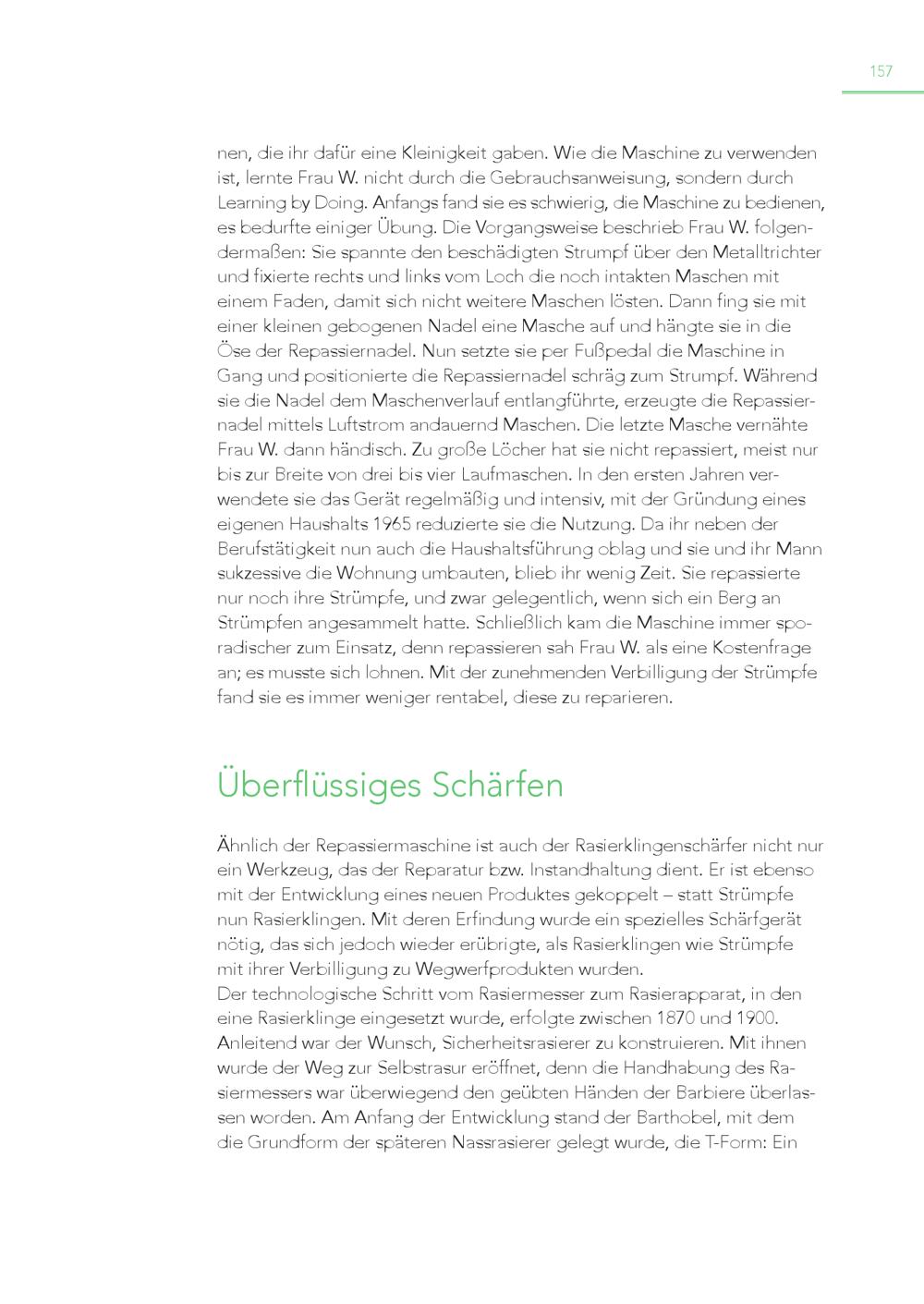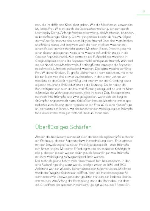 157 nen, die ihr dafür eine Kleinigkeit gaben. Wie die Maschine zu verwenden ist, lernte Frau W. nicht durch die Gebrauchsanweisung, sondern durch Learning by Doing. Anfangs fand sie es schwierig, die Maschine zu bedienen, es bedurfte einiger Übung. Die Vorgangsweise beschrieb Frau W. folgendermaßen: Sie spannte den beschädigten Strumpf über den Metalltrichter und fixierte rechts und links vom Loch die noch intakten Maschen mit einem Faden, damit sich nicht weitere Maschen lösten. Dann fing sie mit einer kleinen gebogenen Nadel eine Masche auf und hängte sie in die Öse der Repassiernadel. Nun setzte sie per Fußpedal die Maschine in Gang und positionierte die Repassiernadel schräg zum Strumpf. Während sie die Nadel dem Maschenverlauf entlangführte, erzeugte die Repassiernadel mittels Luftstrom andauernd Maschen. Die letzte Masche vernähte Frau W. dann händisch. Zu große Löcher hat sie nicht repassiert, meist nur bis zur Breite von drei bis vier Laufmaschen. In den ersten Jahren verwendete sie das Gerät regelmäßig und intensiv, mit der Gründung eines eigenen Haushalts 1965 reduzierte sie die Nutzung. Da ihr neben der Berufstätigkeit nun auch die Haushaltsführung oblag und sie und ihr Mann sukzessive die Wohnung umbauten, blieb ihr wenig Zeit. Sie repassierte nur noch ihre Strümpfe, und zwar gelegentlich, wenn sich ein Berg an Strümpfen angesammelt hatte. Schließlich kam die Maschine immer sporadischer zum Einsatz, denn repassieren sah Frau W. als eine Kostenfrage an; es musste sich lohnen. Mit der zunehmenden Verbilligung der Strümpfe fand sie es immer weniger rentabel, diese zu reparieren. Überflüssiges Schärfen Ähnlich der Repassiermaschine ist auch der Rasierklingenschärfer nicht nur ein Werkzeug, das der Reparatur bzw. Instandhaltung dient. Er ist ebenso mit der Entwicklung eines neuen Produktes gekoppelt – statt Strümpfe nun Rasierklingen. Mit deren Erfindung wurde ein spezielles Schärfgerät nötig, das sich jedoch wieder erübrigte, als Rasierklingen wie Strümpfe mit ihrer Verbilligung zu Wegwerfprodukten wurden. Der technologische Schritt vom Rasiermesser zum Rasierapparat, in den eine Rasierklinge eingesetzt wurde, erfolgte zwischen 1870 und 1900. Anleitend war der Wunsch, Sicherheitsrasierer zu konstruieren. Mit ihnen wurde der Weg zur Selbstrasur eröffnet, denn die Handhabung des Rasiermessers war überwiegend den geübten Händen der Barbiere überlassen worden. Am Anfang der Entwicklung stand der Barthobel, mit dem die Grundform der späteren Nassrasierer gelegt wurde, die T-Form: Ein