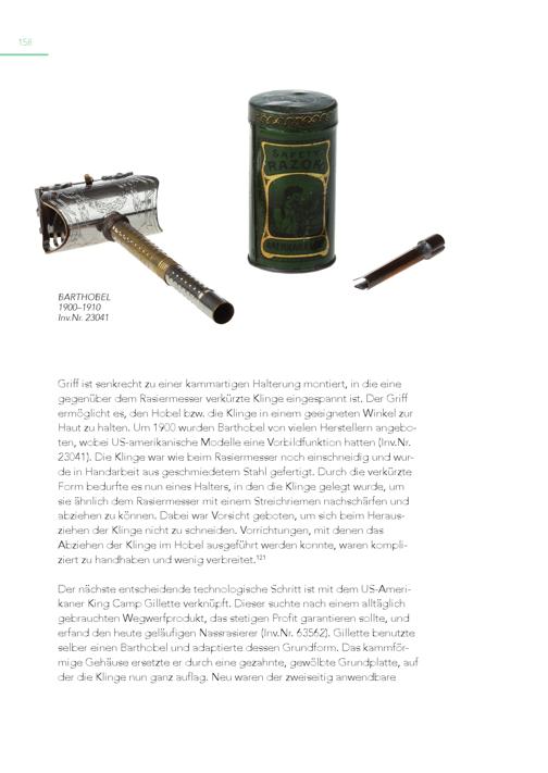 158 BARTHOBEL 1900–1910 Inv.Nr. 23041 Griff ist senkrecht zu einer kammartigen Halterung montiert, in die eine gegenüber dem Rasiermesser verkürzte Klinge eingespannt ist. Der Griff ermöglicht es, den Hobel bzw. die Klinge in einem geeigneten Winkel zur Haut zu halten. Um 1900 wurden Barthobel von vielen Herstellern angeboten, wobei US-amerikanische Modelle eine Vorbildfunktion hatten(Inv.Nr. 23041). Die Klinge war wie beim Rasiermesser noch einschneidig und wurde in Handarbeit aus geschmiedetem Stahl gefertigt. Durch die verkürzte Form bedurfte es nun eines Halters, in den die Klinge gelegt wurde, um sie ähnlich dem Rasiermesser mit einem Streichriemen nachschärfen und abziehen zu können. Dabei war Vorsicht geboten, um sich beim Herausziehen der Klinge nicht zu schneiden. Vorrichtungen, mit denen das Abziehen der Klinge im Hobel ausgeführt werden konnte, waren kompliziert zu handhaben und wenig verbreitet. 121 Der nächste entscheidende technologische Schritt ist mit dem US-Amerikaner King Camp Gillette verknüpft. Dieser suchte nach einem alltäglich gebrauchten Wegwerfprodukt, das stetigen Profit garantieren sollte, und erfand den heute geläufigen Nassrasierer(Inv.Nr. 63562). Gillette benutzte selber einen Barthobel und adaptierte dessen Grundform. Das kammförmige Gehäuse ersetzte er durch eine gezahnte, gewölbte Grundplatte, auf der die Klinge nun ganz auflag. Neu waren der zweiseitig anwendbare