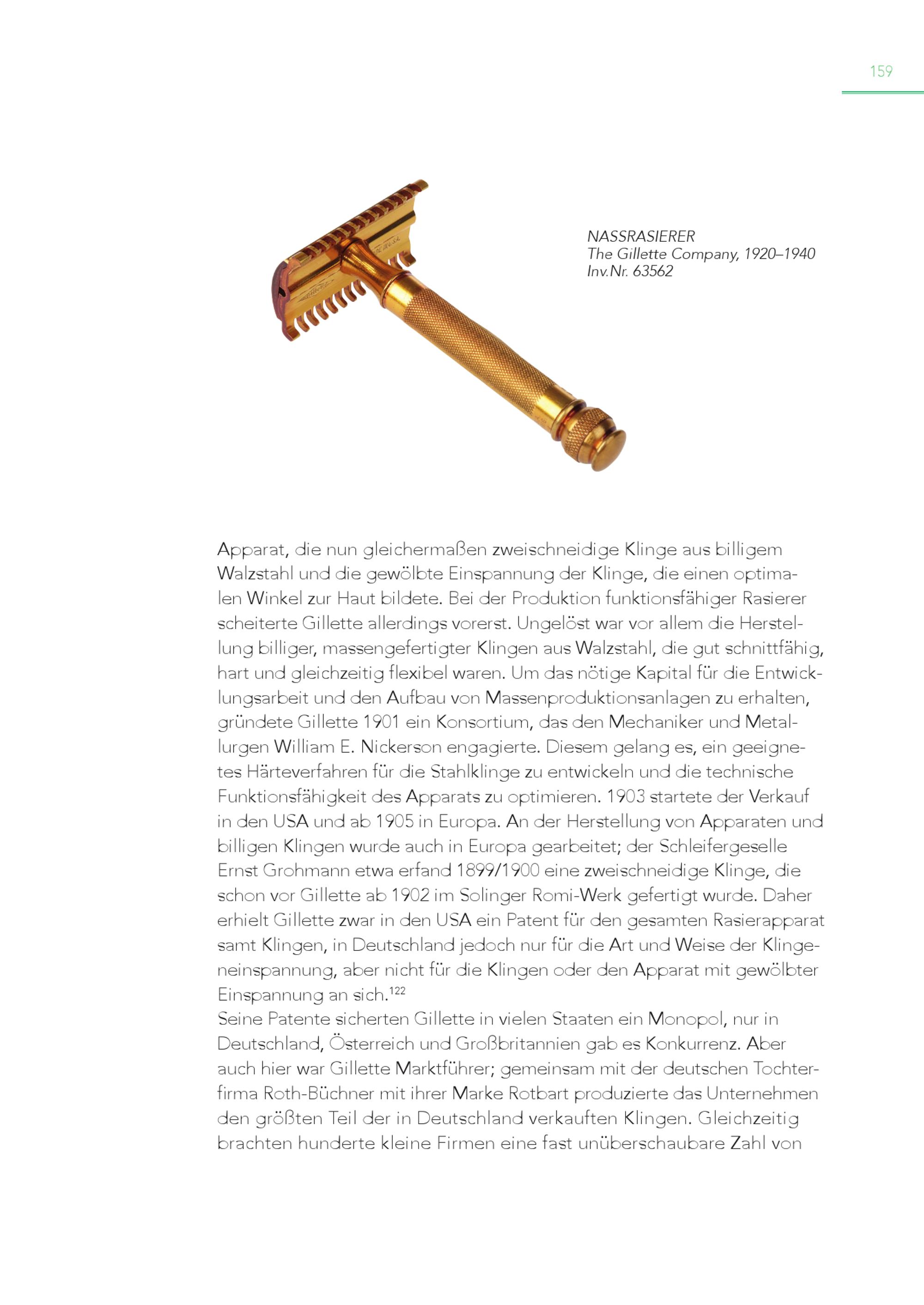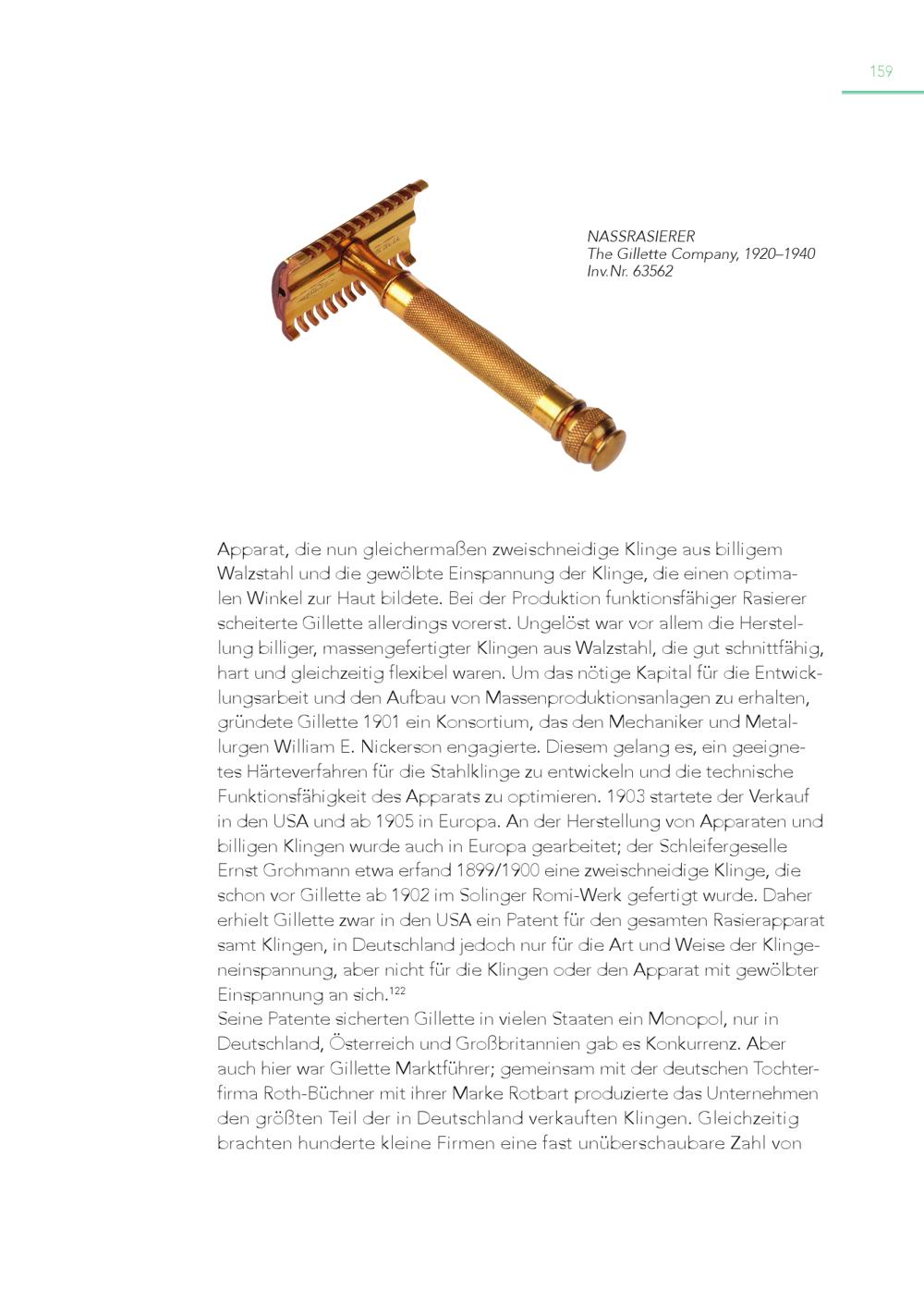 159 NASSRASIERER The Gillette Company, 1920–1940 Inv.Nr. 63562 Apparat, die nun gleichermaßen zweischneidige Klinge aus billigem Walzstahl und die gewölbte Einspannung der Klinge, die einen optimalen Winkel zur Haut bildete. Bei der Produktion funktionsfähiger Rasierer scheiterte Gillette allerdings vorerst. Ungelöst war vor allem die Herstellung billiger, massengefertigter Klingen aus Walzstahl, die gut schnittfähig, hart und gleichzeitig flexibel waren. Um das nötige Kapital für die Entwick lungsarbeit und den Aufbau von Massenproduktionsanlagen zu erhalten, gründete Gillette 1901 ein Konsortium, das den Mechaniker und Metallurgen William E. Nickerson engagierte. Diesem gelang es, ein geeignetes Härteverfahren für die Stahlklinge zu entwickeln und die technische Funktionsfähigkeit des Apparats zu optimieren. 1903 startete der Verkauf in den USA und ab 1905 in Europa. An der Herstellung von Apparaten und billigen Klingen wurde auch in Europa gearbeitet; der Schleifergeselle Ernst Grohmann etwa erfand 1899/1900 eine zweischneidige Klinge, die schon vor Gillette ab 1902 im Solinger Romi-Werk gefertigt wurde. Daher erhielt Gillette zwar in den USA ein Patent für den gesamten Rasierapparat samt Klingen, in Deutschland jedoch nur für die Art und Weise der Klingeneinspannung, aber nicht für die Klingen oder den Apparat mit gewölbter Einspannung an sich. 122 Seine Patente sicherten Gillette in vielen Staaten ein Monopol, nur in Deutschland, Österreich und Großbritannien gab es Konkurrenz. Aber auch hier war Gillette Marktführer; gemeinsam mit der deutschen Tochterfirma Roth-Büchner mit ihrer Marke Rotbart produzierte das Unternehmen den größten Teil der in Deutschland verkauften Klingen. Gleichzeitig brachten hunderte kleine Firmen eine fast unüberschaubare Zahl von