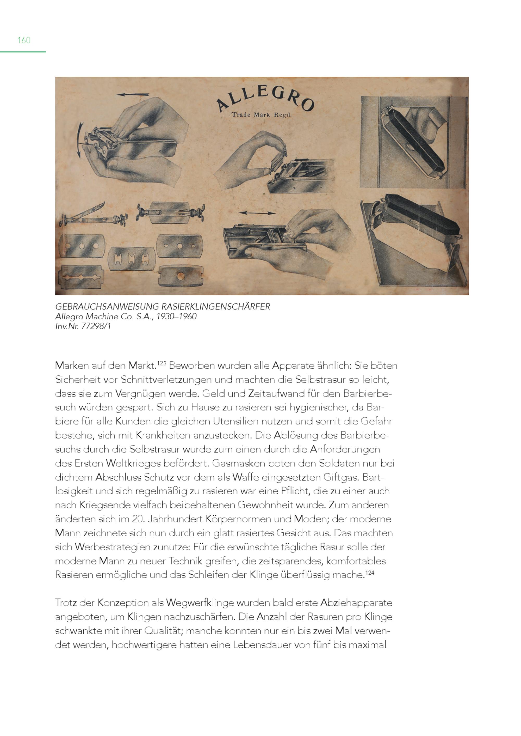 160 GEBRAUCHSANWEISUNG RASIERKLINGENSCHÄRFER Allegro Machine Co. S.A., 1930–1960 Inv.Nr. 77298/1 Marken auf den Markt. 123 Beworben wurden alle Apparate ähnlich: Sie böten Sicherheit vor Schnittverletzungen und machten die Selbstrasur so leicht, dass sie zum Vergnügen werde. Geld und Zeitaufwand für den Barbierbesuch würden gespart. Sich zu Hause zu rasieren sei hygienischer, da Barbiere für alle Kunden die gleichen Utensilien nutzen und somit die Gefahr bestehe, sich mit Krankheiten anzustecken. Die Ablösung des Barbierbesuchs durch die Selbstrasur wurde zum einen durch die Anforderungen des Ersten Weltkrieges befördert. Gasmasken boten den Soldaten nur bei dichtem Abschluss Schutz vor dem als Waffe eingesetzten Giftgas. Bartlosigkeit und sich regelmäßig zu rasieren war eine Pflicht, die zu einer auch nach Kriegsende vielfach beibehaltenen Gewohnheit wurde. Zum anderen änderten sich im 20. Jahrhundert Körpernormen und Moden; der moderne Mann zeichnete sich nun durch ein glatt rasiertes Gesicht aus. Das machten sich Werbestrategien zunutze: Für die erwünschte tägliche Rasur solle der moderne Mann zu neuer Technik greifen, die zeitsparendes, komfortables Rasieren ermögliche und das Schleifen der Klinge überflüssig mache. 124 Trotz der Konzeption als Wegwerfklinge wurden bald erste Abziehapparate angeboten, um Klingen nachzuschärfen. Die Anzahl der Rasuren pro Klinge schwankte mit ihrer Qualität; manche konnten nur ein bis zwei Mal verwendet werden, hochwertigere hatten eine Lebensdauer von fünf bis maximal