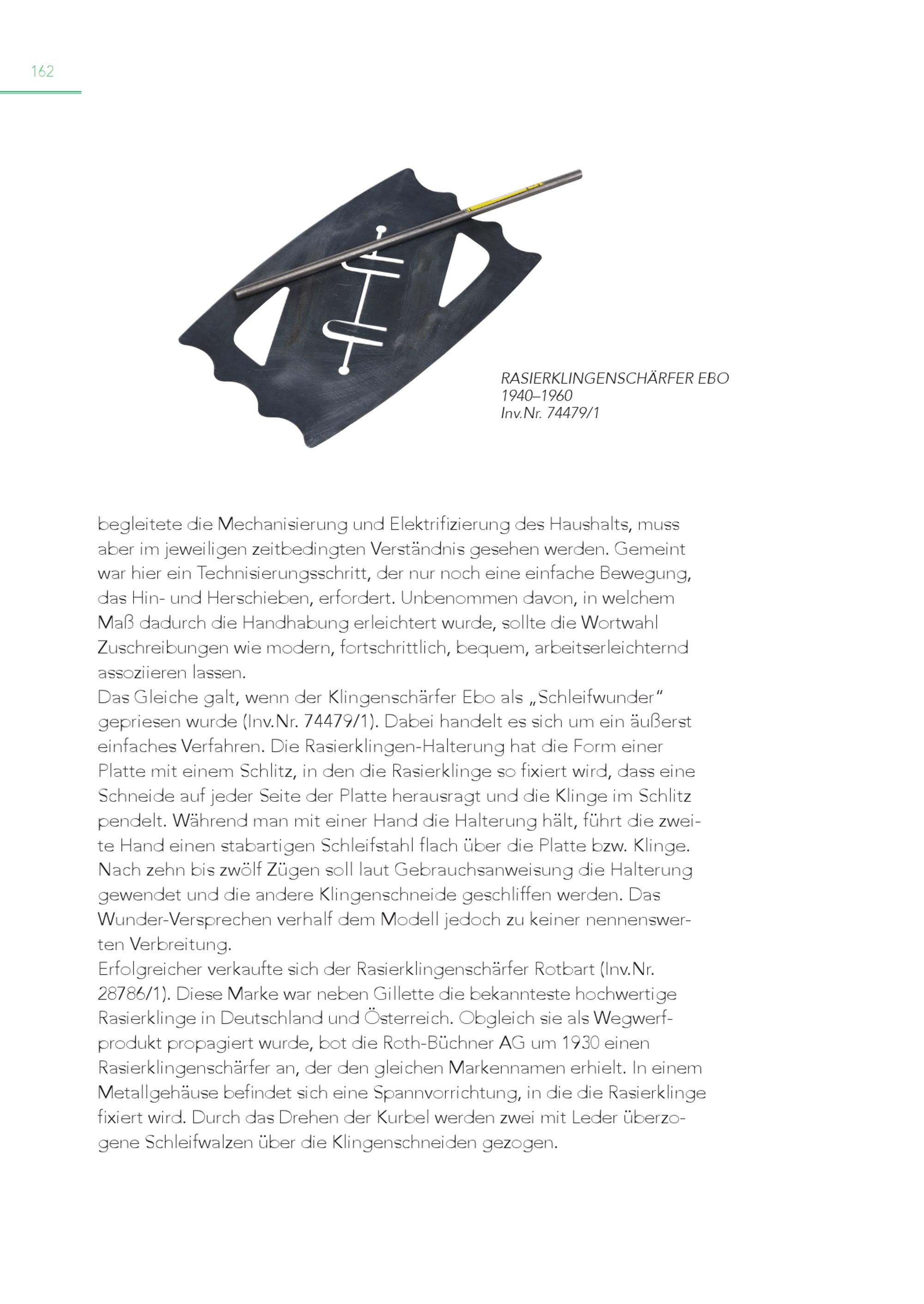 162 RASIERKLINGENSCHÄRFER EBO 1940–1960 Inv.Nr. 74479/1 begleitete die Mechanisierung und Elektrifizierung des Haushalts, muss aber im jeweiligen zeitbedingten Verständnis gesehen werden. Gemeint war hier ein Technisierungsschritt, der nur noch eine einfache Bewegung, das Hin- und Herschieben, erfordert. Unbenommen davon, in welchem Maß dadurch die Handhabung erleichtert wurde, sollte die Wortwahl Zuschreibungen wie modern, fortschrittlich, bequem, arbeitserleichternd assoziieren lassen. Das Gleiche galt, wenn der Klingenschärfer Ebo als„Schleifwunder“ gepriesen wurde(Inv.Nr. 74479/1). Dabei handelt es sich um ein äußerst einfaches Verfahren. Die Rasierklingen-Halterung hat die Form einer Platte mit einem Schlitz, in den die Rasierklinge so fixiert wird, dass eine Schneide auf jeder Seite der Platte herausragt und die Klinge im Schlitz pendelt. Während man mit einer Hand die Halterung hält, führt die zweite Hand einen stabartigen Schleifstahl flach über die Platte bzw. Klinge. Nach zehn bis zwölf Zügen soll laut Gebrauchsanweisung die Halterung gewendet und die andere Klingenschneide geschliffen werden. Das Wunder-Versprechen verhalf dem Modell jedoch zu keiner nennenswerten Verbreitung. Erfolgreicher verkaufte sich der Rasierklingenschärfer Rotbart(Inv.Nr. 28786/1). Diese Marke war neben Gillette die bekannteste hochwertige Rasierklinge in Deutschland und Österreich. Obgleich sie als Wegwerfprodukt propagiert wurde, bot die Roth-Büchner AG um 1930 einen Rasierklingenschärfer an, der den gleichen Markennamen erhielt. In einem Metallgehäuse befindet sich eine Spannvorrichtung, in die die Rasierklinge fixiert wird. Durch das Drehen der Kurbel werden zwei mit Leder überzo gene Schleifwalzen über die Klingenschneiden gezogen.