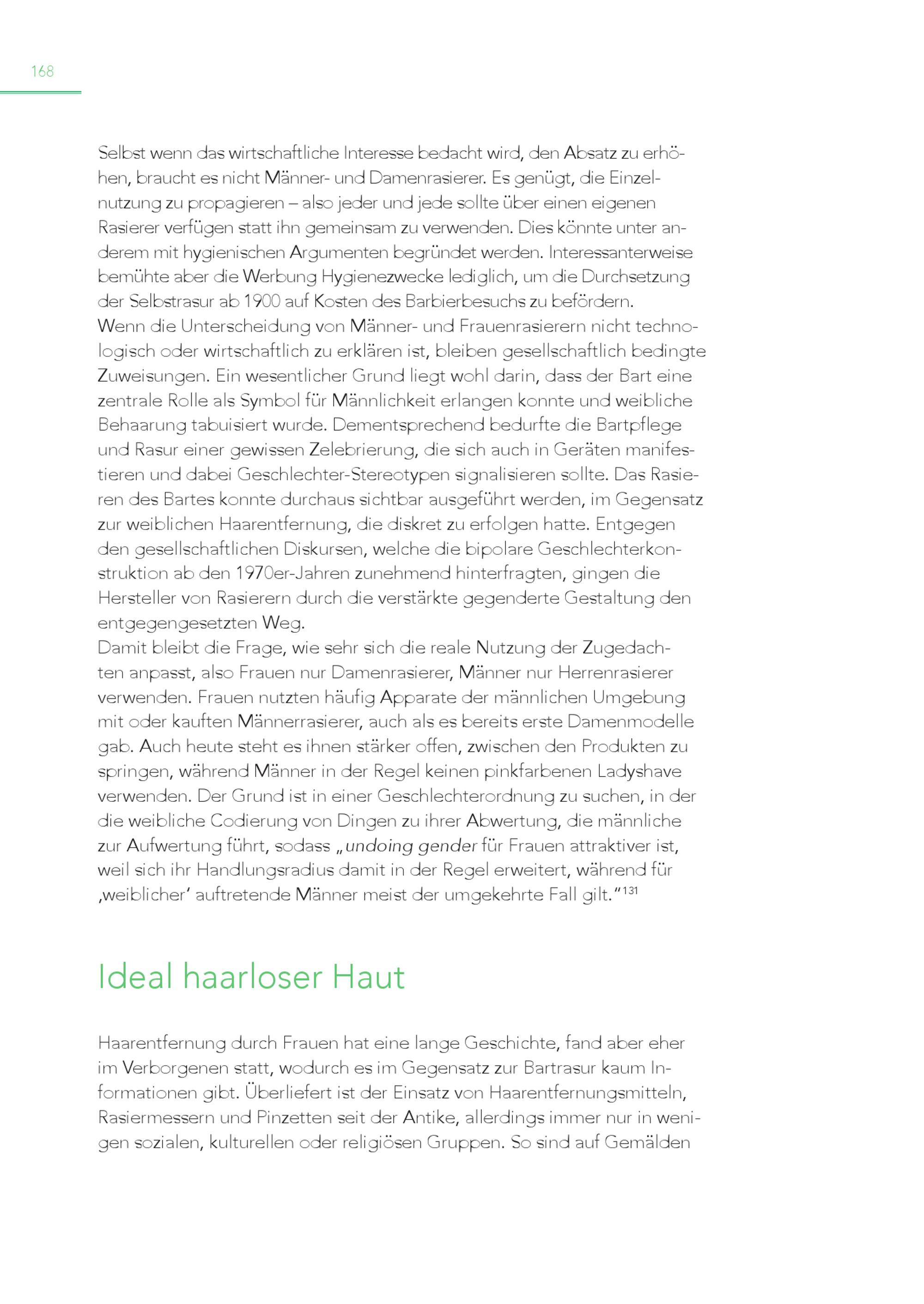 168 Selbst wenn das wirtschaftliche Interesse bedacht wird, den Absatz zu erhöhen, braucht es nicht Männer- und Damenrasierer. Es genügt, die Einzelnutzung zu propagieren – also jeder und jede sollte über einen eigenen Rasierer verfügen statt ihn gemeinsam zu verwenden. Dies könnte unter anderem mit hygienischen Argumenten begründet werden. Interessanterweise bemühte aber die Werbung Hygienezwecke lediglich, um die Durchsetzung der Selbstrasur ab 1900 auf Kosten des Barbierbesuchs zu befördern. Wenn die Unterscheidung von Männer- und Frauenrasierern nicht technologisch oder wirtschaftlich zu erklären ist, bleiben gesellschaftlich bedingte Zuweisungen. Ein wesentlicher Grund liegt wohl darin, dass der Bart eine zentrale Rolle als Symbol für Männlichkeit erlangen konnte und weibliche Behaarung tabuisiert wurde. Dementsprechend bedurfte die Bartpflege und Rasur einer gewissen Zelebrierung, die sich auch in Geräten manifestieren und dabei Geschlechter-Stereotypen signalisieren sollte. Das Rasieren des Bartes konnte durchaus sichtbar ausgeführt werden, im Gegensatz zur weiblichen Haarentfernung, die diskret zu erfolgen hatte. Entgegen den gesellschaftlichen Diskursen, welche die bipolare Geschlechterkonstruktion ab den 1970er-Jahren zunehmend hinterfragten, gingen die Hersteller von Rasierern durch die verstärkte gegenderte Gestaltung den entgegengesetzten Weg. Damit bleibt die Frage, wie sehr sich die reale Nutzung der Zugedachten anpasst, also Frauen nur Damenrasierer, Männer nur Herrenrasierer verwenden. Frauen nutzten häufig Apparate der männlichen Umgebung mit oder kauften Männerrasierer, auch als es bereits erste Damenmodelle gab. Auch heute steht es ihnen stärker offen, zwischen den Produkten zu springen, während Männer in der Regel keinen pinkfarbenen Ladyshave verwenden. Der Grund ist in einer Geschlechterordnung zu suchen, in der die weibliche Codierung von Dingen zu ihrer Abwertung, die männliche zur Aufwertung führt, sodass„ undoing gender für Frauen attraktiver ist, weil sich ihr Handlungsradius damit in der Regel erweitert, während für ‚weiblicher‘ auftretende Männer meist der umgekehrte Fall gilt.“ 131 Ideal haarloser Haut Haarentfernung durch Frauen hat eine lange Geschichte, fand aber eher im Verborgenen statt, wodurch es im Gegensatz zur Bartrasur kaum Informationen gibt. Überliefert ist der Einsatz von Haarentfernungsmitteln, Rasiermessern und Pinzetten seit der Antike, allerdings immer nur in wenigen sozialen, kulturellen oder religiösen Gruppen. So sind auf Gemälden