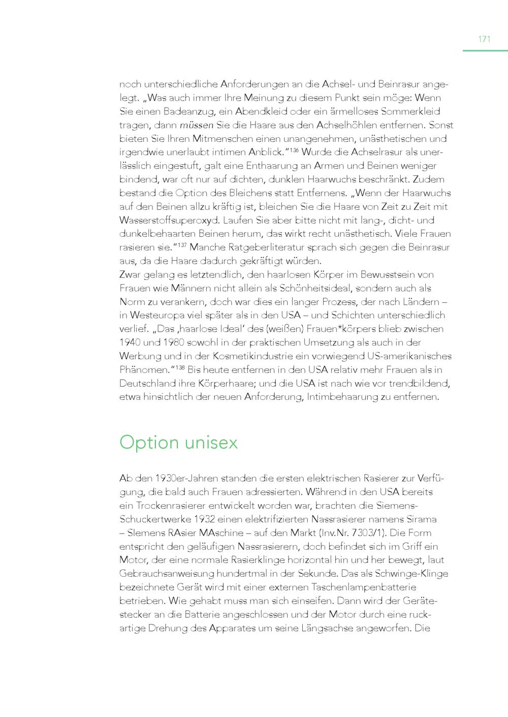 171 noch unterschiedliche Anforderungen an die Achsel- und Beinrasur angelegt.„Was auch immer Ihre Meinung zu diesem Punkt sein möge: Wenn Sie einen Badeanzug, ein Abendkleid oder ein ärmelloses Sommerkleid tragen, dann müssen Sie die Haare aus den Achselhöhlen entfernen. Sonst bieten Sie Ihren Mitmenschen einen unangenehmen, unästhetischen und irgendwie unerlaubt intimen Anblick.“ 136 Wurde die Achselrasur als unerlässlich eingestuft, galt eine Enthaarung an Armen und Beinen weniger bindend, war oft nur auf dichten, dunklen Haarwuchs beschränkt. Zudem bestand die Option des Bleichens statt Entfernens.„Wenn der Haarwuchs auf den Beinen allzu kräftig ist, bleichen Sie die Haare von Zeit zu Zeit mit Wasserstoffsuperoxyd. Laufen Sie aber bitte nicht mit lang-, dicht- und dunkelbehaarten Beinen herum, das wirkt recht unästhetisch. Viele Frauen rasieren sie.“ 137 Manche Ratgeberliteratur sprach sich gegen die Beinrasur aus, da die Haare dadurch gekräftigt würden. Zwar gelang es letztendlich, den haarlosen Körper im Bewusstsein von Frauen wie Männern nicht allein als Schönheitsideal, sondern auch als Norm zu verankern, doch war dies ein langer Prozess, der nach Ländern – in Westeuropa viel später als in den USA – und Schichten unterschiedlich verlief.„Das ‚haarlose Ideal‘ des(weißen) Frauen*körpers blieb zwischen 1940 und 1980 sowohl in der praktischen Umsetzung als auch in der Werbung und in der Kosmetikindustrie ein vorwiegend US-amerikanisches Phänomen.“ 138 Bis heute entfernen in den USA relativ mehr Frauen als in Deutschland ihre Körperhaare; und die USA ist nach wie vor trendbildend, etwa hinsichtlich der neuen Anforderung, Intimbehaarung zu entfernen. Option unisex Ab den 1930er-Jahren standen die ersten elektrischen Rasierer zur Verfügung, die bald auch Frauen adressierten. Während in den USA bereits ein Trockenrasierer entwickelt worden war, brachten die SiemensSchuckertwerke 1932 einen elektrifizierten Nassrasierer namens Sirama – SIemens RAsier MAschine – auf den Markt(Inv.Nr. 7303/1). Die Form entspricht den geläufigen Nassrasierern, doch befindet sich im Griff ein Motor, der eine normale Rasierklinge horizontal hin und her bewegt, laut Gebrauchsanweisung hundertmal in der Sekunde. Das als Schwinge-Klinge bezeichnete Gerät wird mit einer externen Taschenlampenbatterie betrieben. Wie gehabt muss man sich einseifen. Dann wird der Gerätestecker an die Batterie angeschlossen und der Motor durch eine ruckartige Drehung des Apparates um seine Längsachse angeworfen. Die