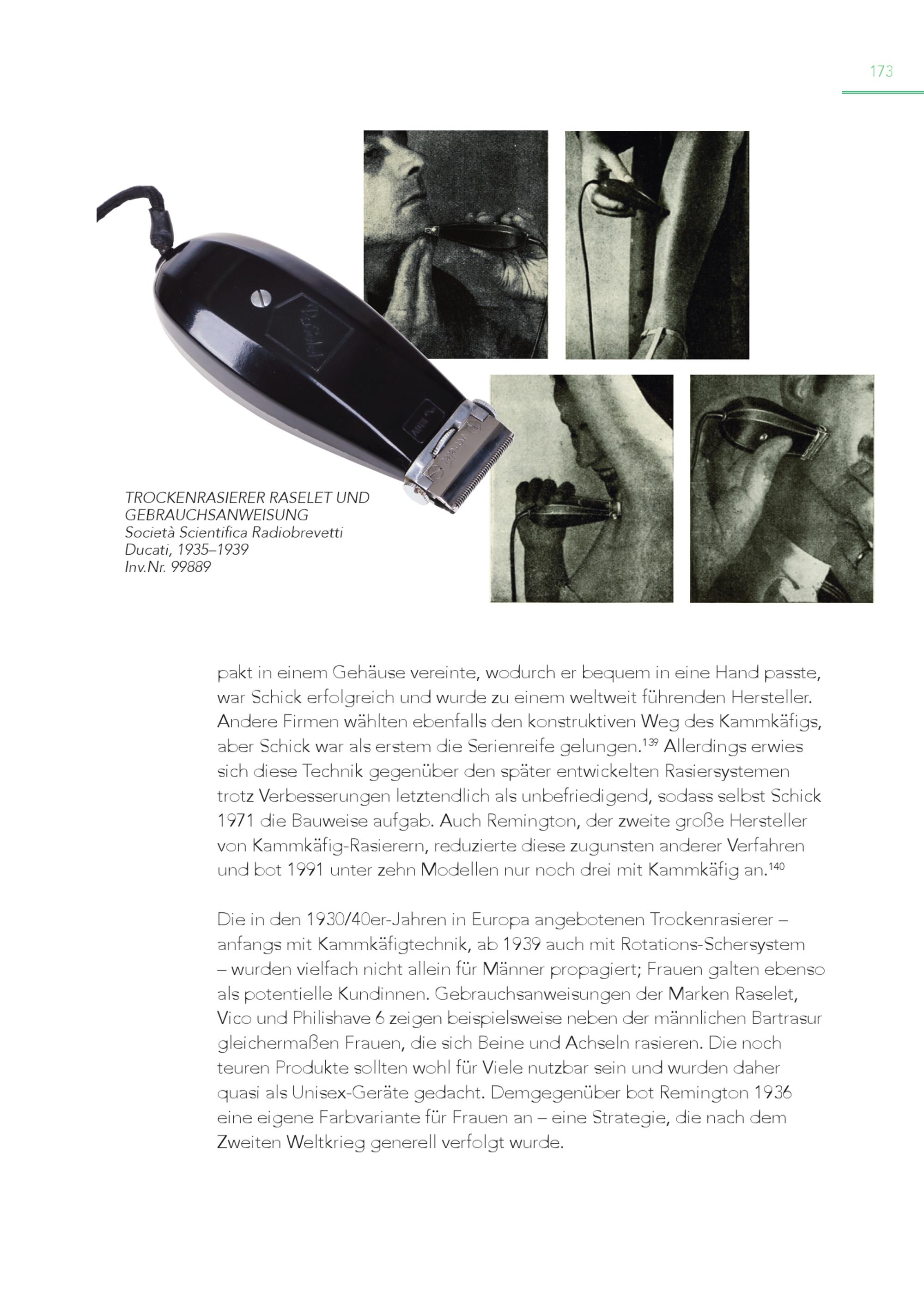 173 TROCKENRASIERER RASELET UND GEBRAUCHSANWEISUNG Società Scientifica Radiobrevetti Ducati, 1935–1939 Inv.Nr. 99889 pakt in einem Gehäuse vereinte, wodurch er bequem in eine Hand passte, war Schick erfolgreich und wurde zu einem weltweit führenden Hersteller. Andere Firmen wählten ebenfalls den konstruktiven Weg des Kammkäfigs, aber Schick war als erstem die Serienreife gelungen. 139 Allerdings erwies sich diese Technik gegenüber den später entwickelten Rasiersystemen trotz Verbesserungen letztendlich als unbefriedigend, sodass selbst Schick 1971 die Bauweise aufgab. Auch Remington, der zweite große Hersteller von Kammkäfig-Rasierern, reduzierte diese zugunsten anderer Verfahren und bot 1991 unter zehn Modellen nur noch drei mit Kammkäfig an. 140 Die in den 1930/40er-Jahren in Europa angebotenen Trockenrasierer – anfangs mit Kammkäfigtechnik, ab 1939 auch mit Rotations-Schersystem – wurden vielfach nicht allein für Männer propagiert; Frauen galten ebenso als potentielle Kundinnen. Gebrauchsanweisungen der Marken Raselet, Vico und Philishave 6 zeigen beispielsweise neben der männlichen Bartrasur gleichermaßen Frauen, die sich Beine und Achseln rasieren. Die noch teuren Produkte sollten wohl für Viele nutzbar sein und wurden daher quasi als Unisex-Geräte gedacht. Demgegenüber bot Remington 1936 eine eigene Farbvariante für Frauen an – eine Strategie, die nach dem Zweiten Weltkrieg generell verfolgt wurde.