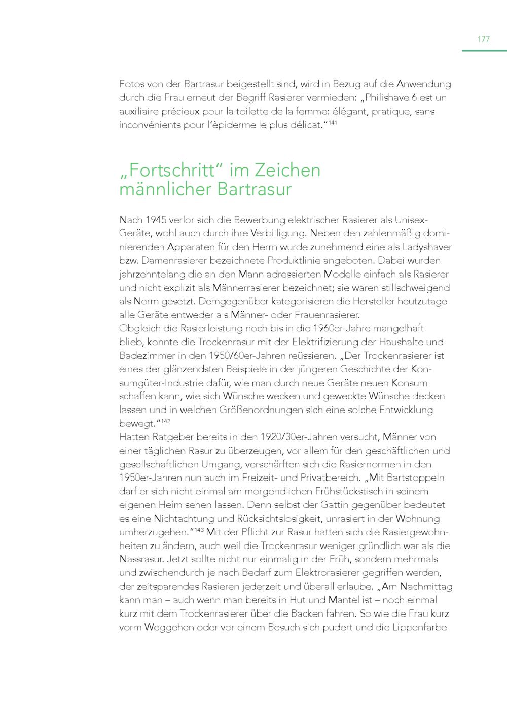 177 Fotos von der Bartrasur beigestellt sind, wird in Bezug auf die Anwendung durch die Frau erneut der Begriff Rasierer vermieden:„Philishave 6 est un auxiliaire précieux pour la toilette de la femme: élégant, pratique, sans inconvénients pour l’èpiderme le plus délicat.“ 141 „Fortschritt“ im Zeichen männlicher Bartrasur Nach 1945 verlor sich die Bewerbung elektrischer Rasierer als UnisexGeräte, wohl auch durch ihre Verbilligung. Neben den zahlenmäßig dominierenden Apparaten für den Herrn wurde zunehmend eine als Ladyshaver bzw. Damenrasierer bezeichnete Produktlinie angeboten. Dabei wurden jahrzehntelang die an den Mann adressierten Modelle einfach als Rasierer und nicht explizit als Männerrasierer bezeichnet; sie waren stillschweigend als Norm gesetzt. Demgegenüber kategorisieren die Hersteller heutzutage alle Geräte entweder als Männer- oder Frauenrasierer. Obgleich die Rasierleistung noch bis in die 1960er-Jahre mangelhaft blieb, konnte die Trockenrasur mit der Elektrifizierung der Haushalte und Badezimmer in den 1950/60er-Jahren reüssieren.„Der Trockenrasierer ist eines der glänzendsten Beispiele in der jüngeren Geschichte der Konsumgüter-Industrie dafür, wie man durch neue Geräte neuen Konsum schaffen kann, wie sich Wünsche wecken und geweckte Wünsche decken lassen und in welchen Größenordnungen sich eine solche Entwicklung bewegt.“ 142 Hatten Ratgeber bereits in den 1920/30er-Jahren versucht, Männer von einer täglichen Rasur zu überzeugen, vor allem für den geschäftlichen und gesellschaftlichen Umgang, verschärften sich die Rasiernormen in den 1950er-Jahren nun auch im Freizeit- und Privatbereich.„Mit Bartstoppeln darf er sich nicht einmal am morgendlichen Frühstückstisch in seinem eigenen Heim sehen lassen. Denn selbst der Gattin gegenüber bedeutet es eine Nichtachtung und Rücksichtslosigkeit, unrasiert in der Wohnung umherzugehen.“ 143 Mit der Pflicht zur Rasur hatten sich die Rasiergewohn heiten zu ändern, auch weil die Trockenrasur weniger gründlich war als die Nassrasur. Jetzt sollte nicht nur einmalig in der Früh, sondern mehrmals und zwischendurch je nach Bedarf zum Elektrorasierer gegriffen werden, der zeitsparendes Rasieren jederzeit und überall erlaube.„Am Nachmittag kann man – auch wenn man bereits in Hut und Mantel ist – noch einmal kurz mit dem Trockenrasierer über die Backen fahren. So wie die Frau kurz vorm Weggehen oder vor einem Besuch sich pudert und die Lippenfarbe