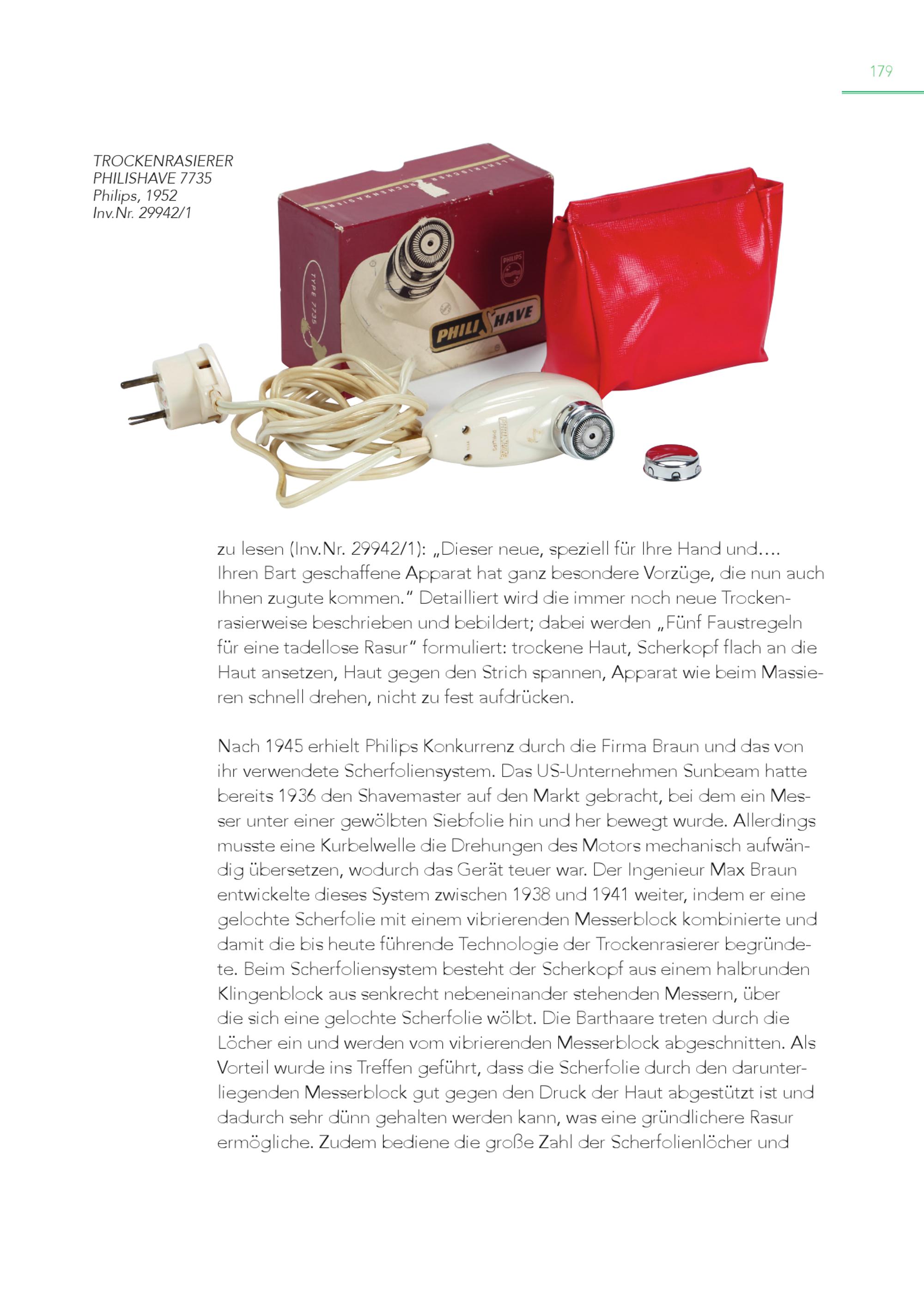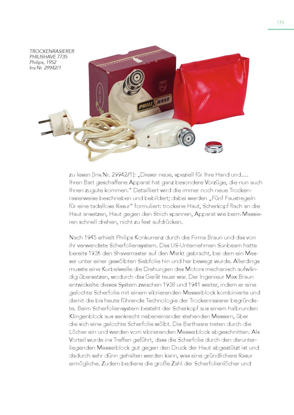 TROCKENRASIERER PHILISHAVE 7735 Philips, 1952 Inv.Nr. 29942/1 179 zu lesen(Inv.Nr. 29942/1):„Dieser neue, speziell für Ihre Hand und…. Ihren Bart geschaffene Apparat hat ganz besondere Vorzüge, die nun auch Ihnen zugute kommen.“ Detailliert wird die immer noch neue Trockenrasierweise beschrieben und bebildert; dabei werden„Fünf Faustregeln für eine tadellose Rasur“ formuliert: trockene Haut, Scherkopf flach an die Haut ansetzen, Haut gegen den Strich spannen, Apparat wie beim Massieren schnell drehen, nicht zu fest aufdrücken. Nach 1945 erhielt Philips Konkurrenz durch die Firma Braun und das von ihr verwendete Scherfoliensystem. Das US-Unternehmen Sunbeam hatte bereits 1936 den Shavemaster auf den Markt gebracht, bei dem ein Messer unter einer gewölbten Siebfolie hin und her bewegt wurde. Allerdings musste eine Kurbelwelle die Drehungen des Motors mechanisch aufwändig übersetzen, wodurch das Gerät teuer war. Der Ingenieur Max Braun entwickelte dieses System zwischen 1938 und 1941 weiter, indem er eine gelochte Scherfolie mit einem vibrierenden Messerblock kombinierte und damit die bis heute führende Technologie der Trockenrasierer begründete. Beim Scherfoliensystem besteht der Scherkopf aus einem halbrunden Klingenblock aus senkrecht nebeneinander stehenden Messern, über die sich eine gelochte Scherfolie wölbt. Die Barthaare treten durch die Löcher ein und werden vom vibrierenden Messerblock abgeschnitten. Als Vorteil wurde ins Treffen geführt, dass die Scherfolie durch den darunterliegenden Messerblock gut gegen den Druck der Haut abgestützt ist und dadurch sehr dünn gehalten werden kann, was eine gründlichere Rasur ermögliche. Zudem bediene die große Zahl der Scherfolienlöcher und