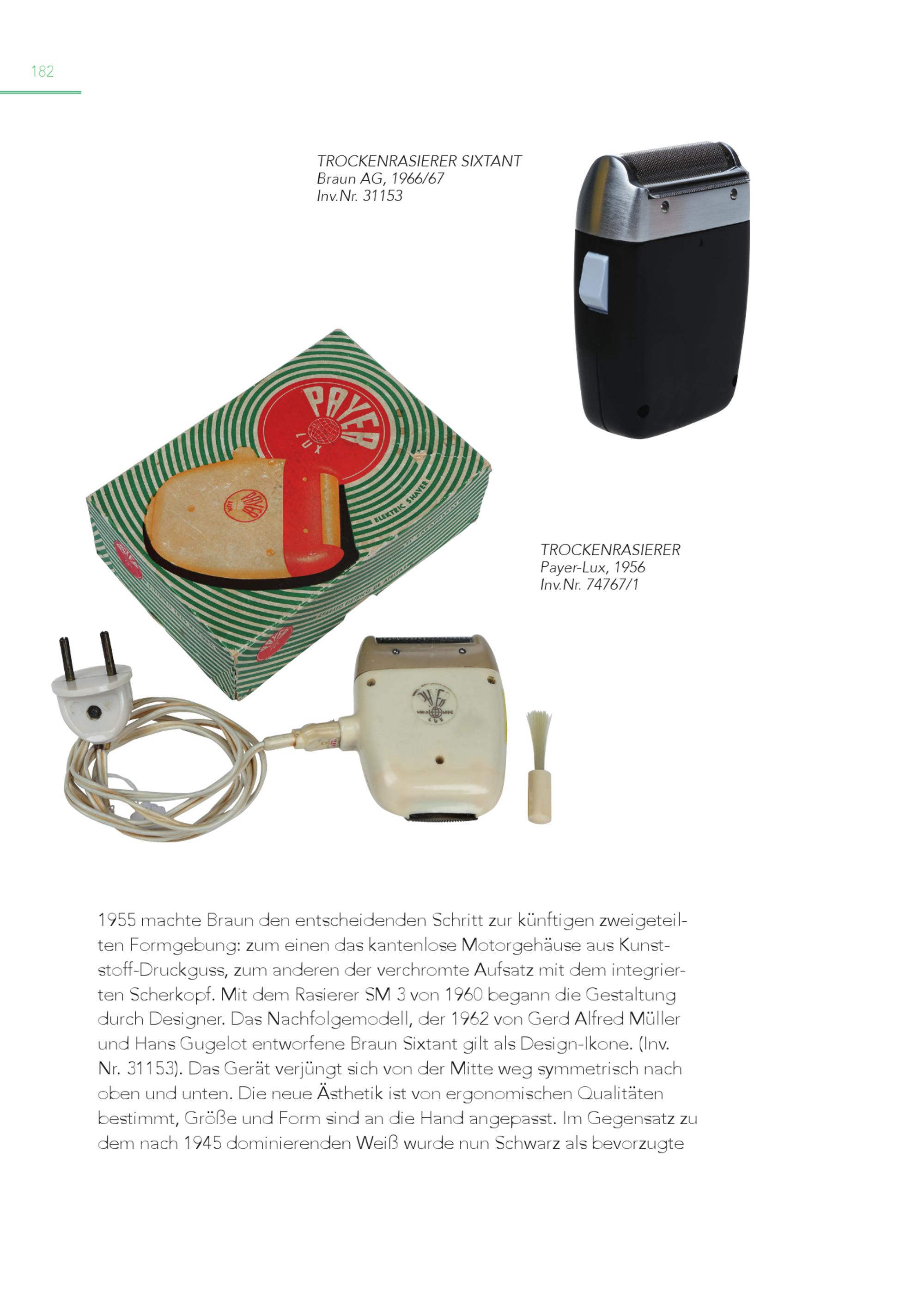 182 TROCKENRASIERER SIXTANT Braun AG, 1966/67 Inv.Nr. 31153 TROCKENRASIERER Payer-Lux, 1956 Inv.Nr. 74767/1 1955 machte Braun den entscheidenden Schritt zur künftigen zweigeteilten Formgebung: zum einen das kantenlose Motorgehäuse aus Kunststoff-Druckguss, zum anderen der verchromte Aufsatz mit dem integrierten Scherkopf. Mit dem Rasierer SM 3 von 1960 begann die Gestaltung durch Designer. Das Nachfolgemodell, der 1962 von Gerd Alfred Müller und Hans Gugelot entworfene Braun Sixtant gilt als Design-Ikone.(Inv. Nr. 31153). Das Gerät verjüngt sich von der Mitte weg symmetrisch nach oben und unten. Die neue Ästhetik ist von ergonomischen Qualitäten bestimmt, Größe und Form sind an die Hand angepasst. Im Gegensatz zu dem nach 1945 dominierenden Weiß wurde nun Schwarz als bevorzugte