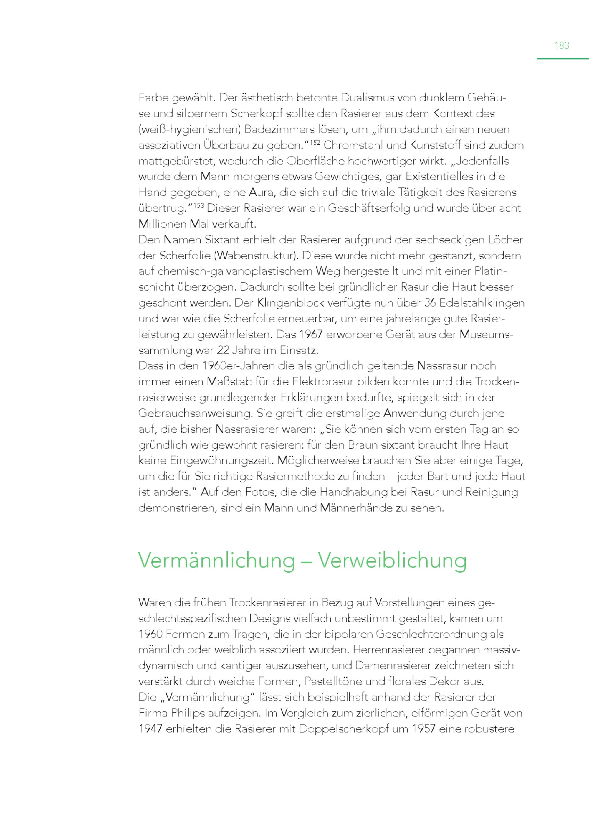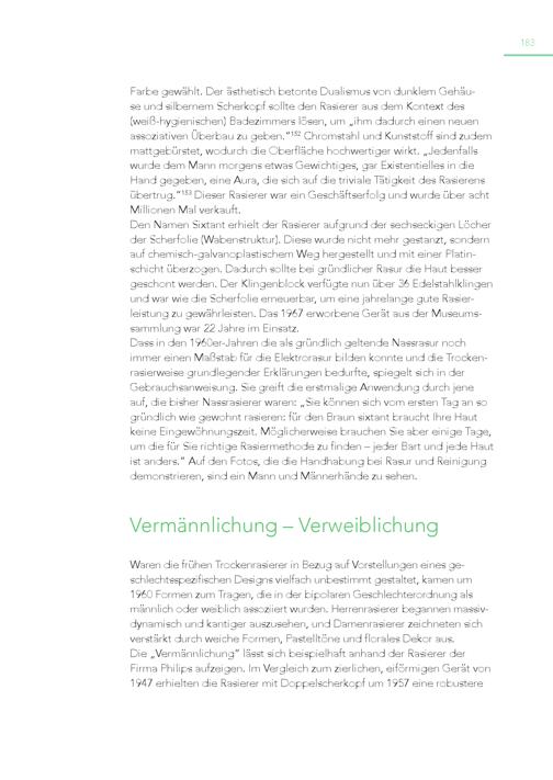 183 Farbe gewählt. Der ästhetisch betonte Dualismus von dunklem Gehäuse und silbernem Scherkopf sollte den Rasierer aus dem Kontext des (weiß-hygienischen) Badezimmers lösen, um„ihm dadurch einen neuen assoziativen Überbau zu geben.“ 152 Chromstahl und Kunststoff sind zudem mattgebürstet, wodurch die Oberfläche hochwertiger wirkt.„Jedenfalls wurde dem Mann morgens etwas Gewichtiges, gar Existentielles in die Hand gegeben, eine Aura, die sich auf die triviale Tätigkeit des Rasierens übertrug.“ 153 Dieser Rasierer war ein Geschäftserfolg und wurde über acht Millionen Mal verkauft. Den Namen Sixtant erhielt der Rasierer aufgrund der sechseckigen Löcher der Scherfolie(Wabenstruktur). Diese wurde nicht mehr gestanzt, sondern auf chemisch-galvanoplastischem Weg hergestellt und mit einer Platinschicht überzogen. Dadurch sollte bei gründlicher Rasur die Haut besser geschont werden. Der Klingenblock verfügte nun über 36 Edelstahlklingen und war wie die Scherfolie erneuerbar, um eine jahrelange gute Rasierleistung zu gewährleisten. Das 1967 erworbene Gerät aus der Museumssammlung war 22 Jahre im Einsatz. Dass in den 1960er-Jahren die als gründlich geltende Nassrasur noch immer einen Maßstab für die Elektrorasur bilden konnte und die Trockenrasierweise grundlegender Erklärungen bedurfte, spiegelt sich in der Gebrauchsanweisung. Sie greift die erstmalige Anwendung durch jene auf, die bisher Nassrasierer waren:„Sie können sich vom ersten Tag an so gründlich wie gewohnt rasieren: für den Braun sixtant braucht Ihre Haut keine Eingewöhnungszeit. Möglicherweise brauchen Sie aber einige Tage, um die für Sie richtige Rasiermethode zu finden – jeder Bart und jede Haut ist anders.“ Auf den Fotos, die die Handhabung bei Rasur und Reinigung demonstrieren, sind ein Mann und Männerhände zu sehen. Vermännlichung – Verweiblichung Waren die frühen Trockenrasierer in Bezug auf Vorstellungen eines geschlechtsspezifischen Designs vielfach unbestimmt gestaltet, kamen um 1960 Formen zum Tragen, die in der bipolaren Geschlechterordnung als männlich oder weiblich assoziiert wurden. Herrenrasierer begannen massivdynamisch und kantiger auszusehen, und Damenrasierer zeichneten sich verstärkt durch weiche Formen, Pastelltöne und florales Dekor aus. Die„Vermännlichung“ lässt sich beispielhaft anhand der Rasierer der Firma Philips aufzeigen. Im Vergleich zum zierlichen, eiförmigen Gerät von 1947 erhielten die Rasierer mit Doppelscherkopf um 1957 eine robustere
