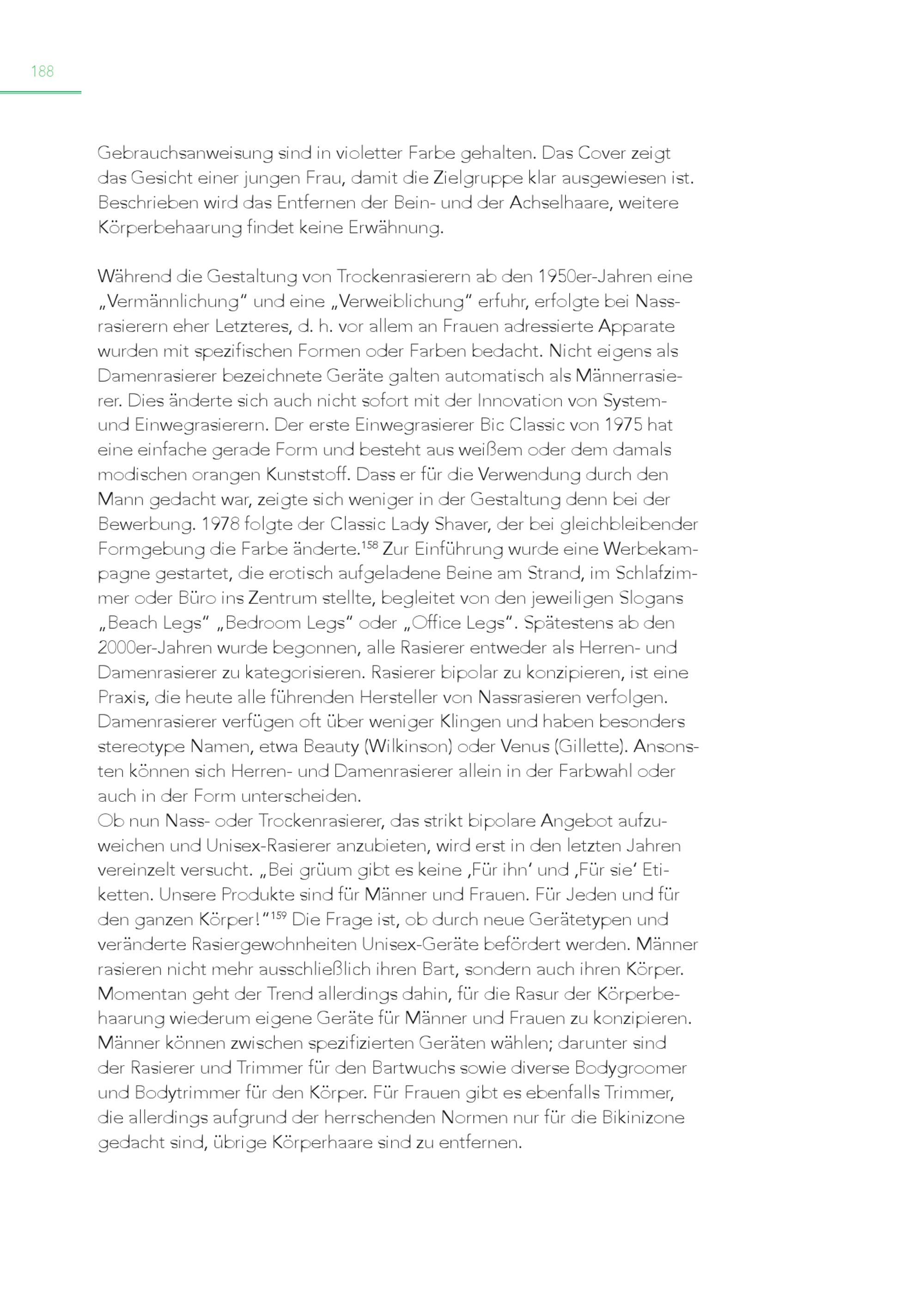 188 Gebrauchsanweisung sind in violetter Farbe gehalten. Das Cover zeigt das Gesicht einer jungen Frau, damit die Zielgruppe klar ausgewiesen ist. Beschrieben wird das Entfernen der Bein- und der Achselhaare, weitere Körperbehaarung findet keine Erwähnung. Während die Gestaltung von Trockenrasierern ab den 1950er-Jahren eine „Vermännlichung“ und eine„Verweiblichung“ erfuhr, erfolgte bei Nassrasierern eher Letzteres, d. h. vor allem an Frauen adressierte Apparate wurden mit spezifischen Formen oder Farben bedacht. Nicht eigens als Damenrasierer bezeichnete Geräte galten automatisch als Männerrasierer. Dies änderte sich auch nicht sofort mit der Innovation von Systemund Einwegrasierern. Der erste Einwegrasierer Bic Classic von 1975 hat eine einfache gerade Form und besteht aus weißem oder dem damals modischen orangen Kunststoff. Dass er für die Verwendung durch den Mann gedacht war, zeigte sich weniger in der Gestaltung denn bei der Bewerbung. 1978 folgte der Classic Lady Shaver, der bei gleichbleibender Formgebung die Farbe änderte. 158 Zur Einführung wurde eine Werbekampagne gestartet, die erotisch aufgeladene Beine am Strand, im Schlafzimmer oder Büro ins Zentrum stellte, begleitet von den jeweiligen Slogans „Beach Legs“„Bedroom Legs“ oder„Office Legs“. Spätestens ab den 2000er-Jahren wurde begonnen, alle Rasierer entweder als Herren- und Damenrasierer zu kategorisieren. Rasierer bipolar zu konzipieren, ist eine Praxis, die heute alle führenden Hersteller von Nassrasieren verfolgen. Damenrasierer verfügen oft über weniger Klingen und haben besonders stereotype Namen, etwa Beauty(Wilkinson) oder Venus(Gillette). Ansonsten können sich Herren- und Damenrasierer allein in der Farbwahl oder auch in der Form unterscheiden. Ob nun Nass- oder Trockenrasierer, das strikt bipolare Angebot aufzuweichen und Unisex-Rasierer anzubieten, wird erst in den letzten Jahren vereinzelt versucht.„Bei grüum gibt es keine ‚Für ihn‘ und ‚Für sie‘ Etiketten. Unsere Produkte sind für Männer und Frauen. Für Jeden und für den ganzen Körper!“ 159 Die Frage ist, ob durch neue Gerätetypen und veränderte Rasiergewohnheiten Unisex-Geräte befördert werden. Männer rasieren nicht mehr ausschließlich ihren Bart, sondern auch ihren Körper. Momentan geht der Trend allerdings dahin, für die Rasur der Körperbehaarung wiederum eigene Geräte für Männer und Frauen zu konzipieren. Männer können zwischen spezifizierten Geräten wählen; darunter sind der Rasierer und Trimmer für den Bartwuchs sowie diverse Bodygroomer und Bodytrimmer für den Körper. Für Frauen gibt es ebenfalls Trimmer, die allerdings aufgrund der herrschenden Normen nur für die Bikinizone gedacht sind, übrige Körperhaare sind zu entfernen.