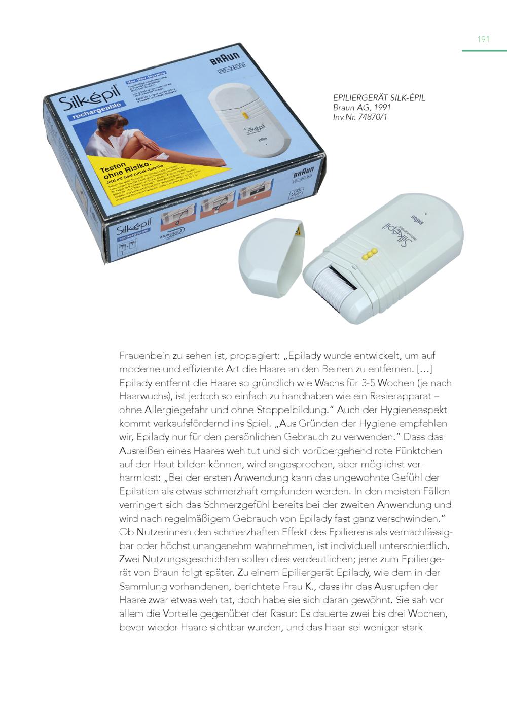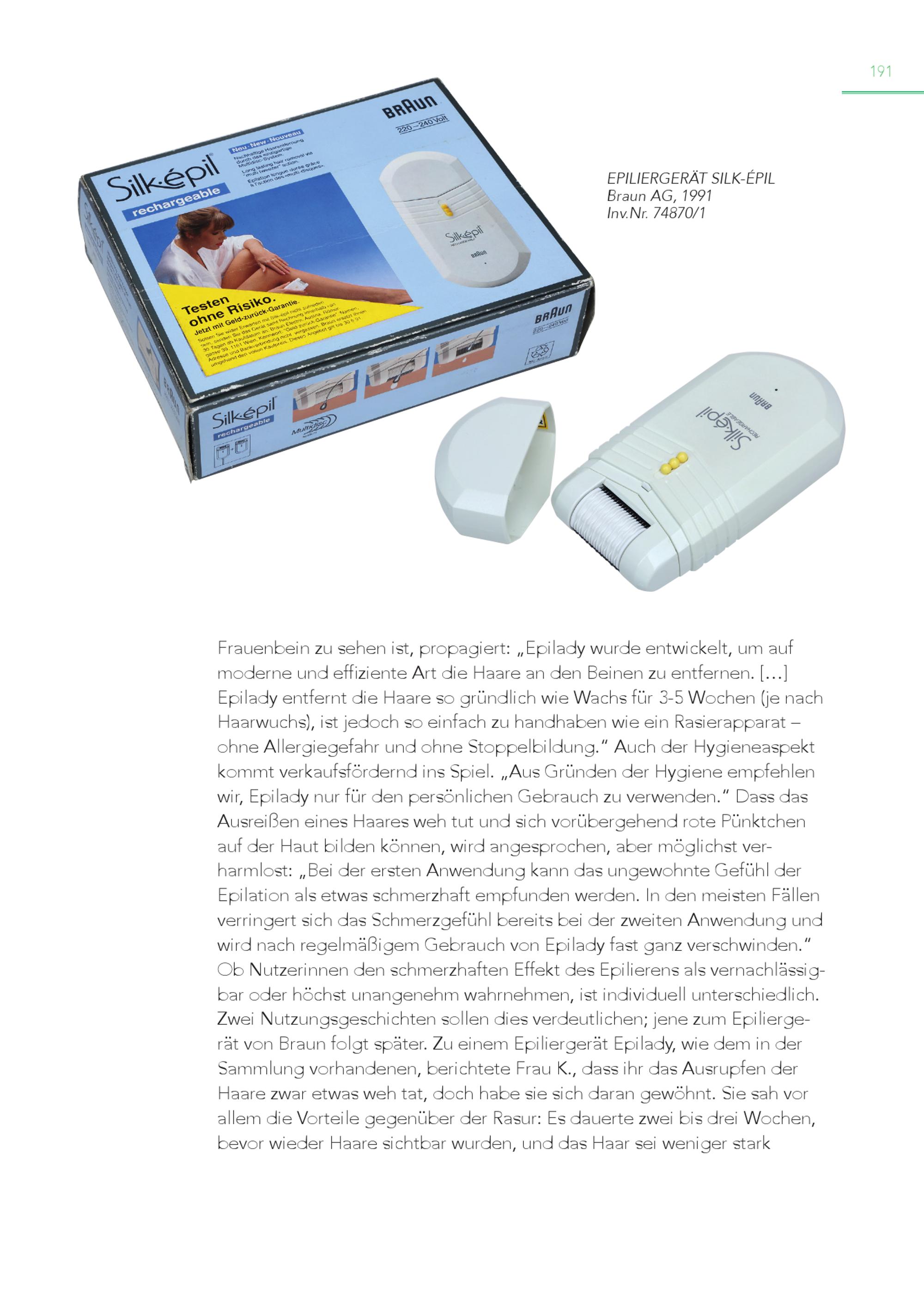 191 EPILIERGERÄT SILK-ÉPIL Braun AG, 1991 Inv.Nr. 74870/1 Frauenbein zu sehen ist, propagiert:„Epilady wurde entwickelt, um auf moderne und effiziente Art die Haare an den Beinen zu entfernen.[…] Epilady entfernt die Haare so gründlich wie Wachs für 3-5 Wochen(je nach Haarwuchs), ist jedoch so einfach zu handhaben wie ein Rasierapparat – ohne Allergiegefahr und ohne Stoppelbildung.“ Auch der Hygieneaspekt kommt verkaufsfördernd ins Spiel.„Aus Gründen der Hygiene empfehlen wir, Epilady nur für den persönlichen Gebrauch zu verwenden.“ Dass das Ausreißen eines Haares weh tut und sich vorübergehend rote Pünktchen auf der Haut bilden können, wird angesprochen, aber möglichst verharmlost:„Bei der ersten Anwendung kann das ungewohnte Gefühl der Epilation als etwas schmerzhaft empfunden werden. In den meisten Fällen verringert sich das Schmerzgefühl bereits bei der zweiten Anwendung und wird nach regelmäßigem Gebrauch von Epilady fast ganz verschwinden.“ Ob Nutzerinnen den schmerzhaften Effekt des Epilierens als vernachlässigbar oder höchst unangenehm wahrnehmen, ist individuell unterschiedlich. Zwei Nutzungsgeschichten sollen dies verdeutlichen; jene zum Epiliergerät von Braun folgt später. Zu einem Epiliergerät Epilady, wie dem in der Sammlung vorhandenen, berichtete Frau K., dass ihr das Ausrupfen der Haare zwar etwas weh tat, doch habe sie sich daran gewöhnt. Sie sah vor allem die Vorteile gegenüber der Rasur: Es dauerte zwei bis drei Wochen, bevor wieder Haare sichtbar wurden, und das Haar sei weniger stark