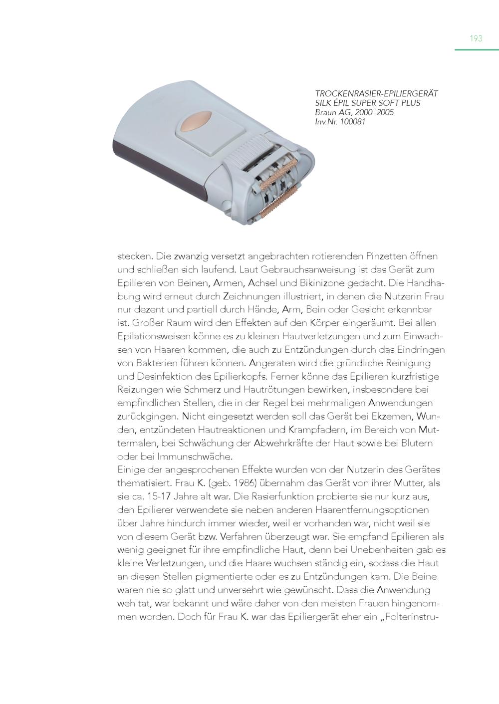 193 TROCKENRASIER-EPILIERGERÄT SILK ÉPIL SUPER SOFT PLUS Braun AG, 2000–2005 Inv.Nr. 100081 stecken. Die zwanzig versetzt angebrachten rotierenden Pinzetten öffnen und schließen sich laufend. Laut Gebrauchsanweisung ist das Gerät zum Epilieren von Beinen, Armen, Achsel und Bikinizone gedacht. Die Handhabung wird erneut durch Zeichnungen illustriert, in denen die Nutzerin Frau nur dezent und partiell durch Hände, Arm, Bein oder Gesicht erkennbar ist. Großer Raum wird den Effekten auf den Körper eingeräumt. Bei allen Epilationsweisen könne es zu kleinen Hautverletzungen und zum Einwachsen von Haaren kommen, die auch zu Entzündungen durch das Eindringen von Bakterien führen können. Angeraten wird die gründliche Reinigung und Desinfektion des Epilierkopfs. Ferner könne das Epilieren kurzfristige Reizungen wie Schmerz und Hautrötungen bewirken, insbesondere bei empfindlichen Stellen, die in der Regel bei mehrmaligen Anwendungen zurückgingen. Nicht eingesetzt werden soll das Gerät bei Ekzemen, Wunden, entzündeten Hautreaktionen und Krampfadern, im Bereich von Muttermalen, bei Schwächung der Abwehrkräfte der Haut sowie bei Blutern oder bei Immunschwäche. Einige der angesprochenen Effekte wurden von der Nutzerin des Gerätes thematisiert. Frau K.(geb. 1986) übernahm das Gerät von ihrer Mutter, als sie ca. 15-17 Jahre alt war. Die Rasierfunktion probierte sie nur kurz aus, den Epilierer verwendete sie neben anderen Haarentfernungsoptionen über Jahre hindurch immer wieder, weil er vorhanden war, nicht weil sie von diesem Gerät bzw. Verfahren überzeugt war. Sie empfand Epilieren als wenig geeignet für ihre empfindliche Haut, denn bei Unebenheiten gab es kleine Verletzungen, und die Haare wuchsen ständig ein, sodass die Haut an diesen Stellen pigmentierte oder es zu Entzündungen kam. Die Beine waren nie so glatt und unversehrt wie gewünscht. Dass die Anwendung weh tat, war bekannt und wäre daher von den meisten Frauen hingenommen worden. Doch für Frau K. war das Epiliergerät eher ein„Folterinstru-